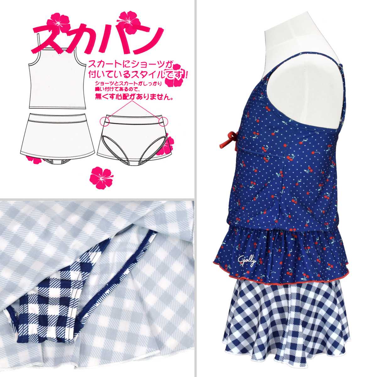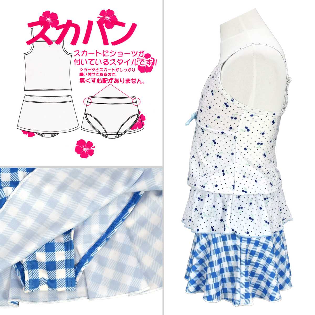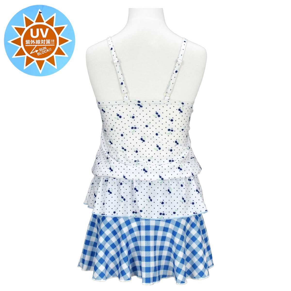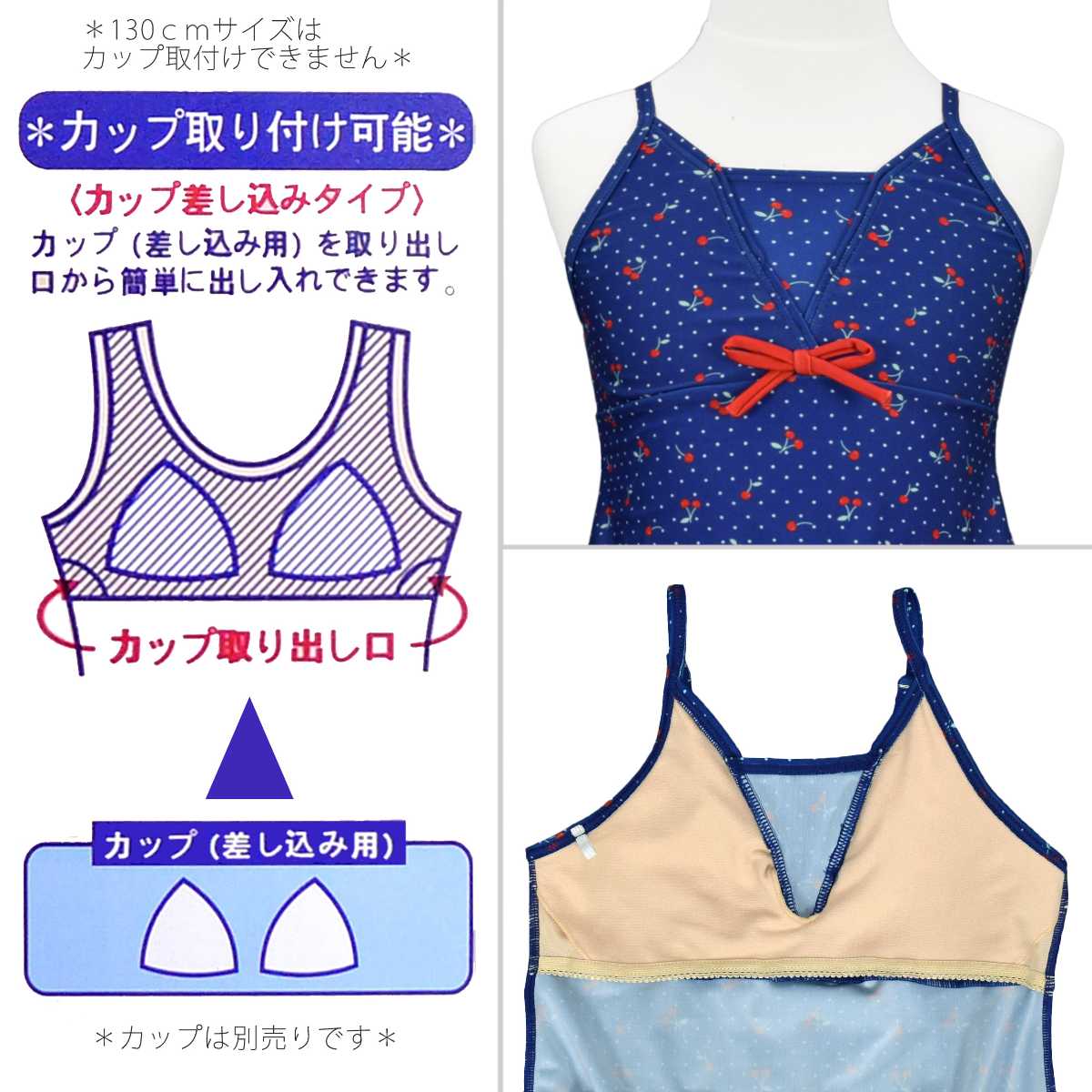☆ 商 品 説 明 ☆ UVカット加工 さくらんぼ柄 セパレート 水着。 さくらんぼ、ドット、チェック柄が可愛い2点セットのスイムウェアです。 トップスは肩ひもが調節可能なキャミソールタイプ。 裾にはゴム入りなので捲れずらいデザインです。 ボトムスはスカートとショーツが一体型のスカパンタイプ。 スカートとショーツはしっかり縫い付けてあるので無くす心配がありません。 UVカット加工で紫外線対策もバッチリです。 130cmは胸元内側に布付き、カップ差し込み口無し。 140cm-160cmはカップ差し込み口あり。取外しも可能です。 (カップは別売りです。)