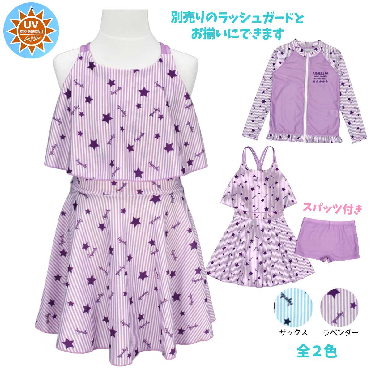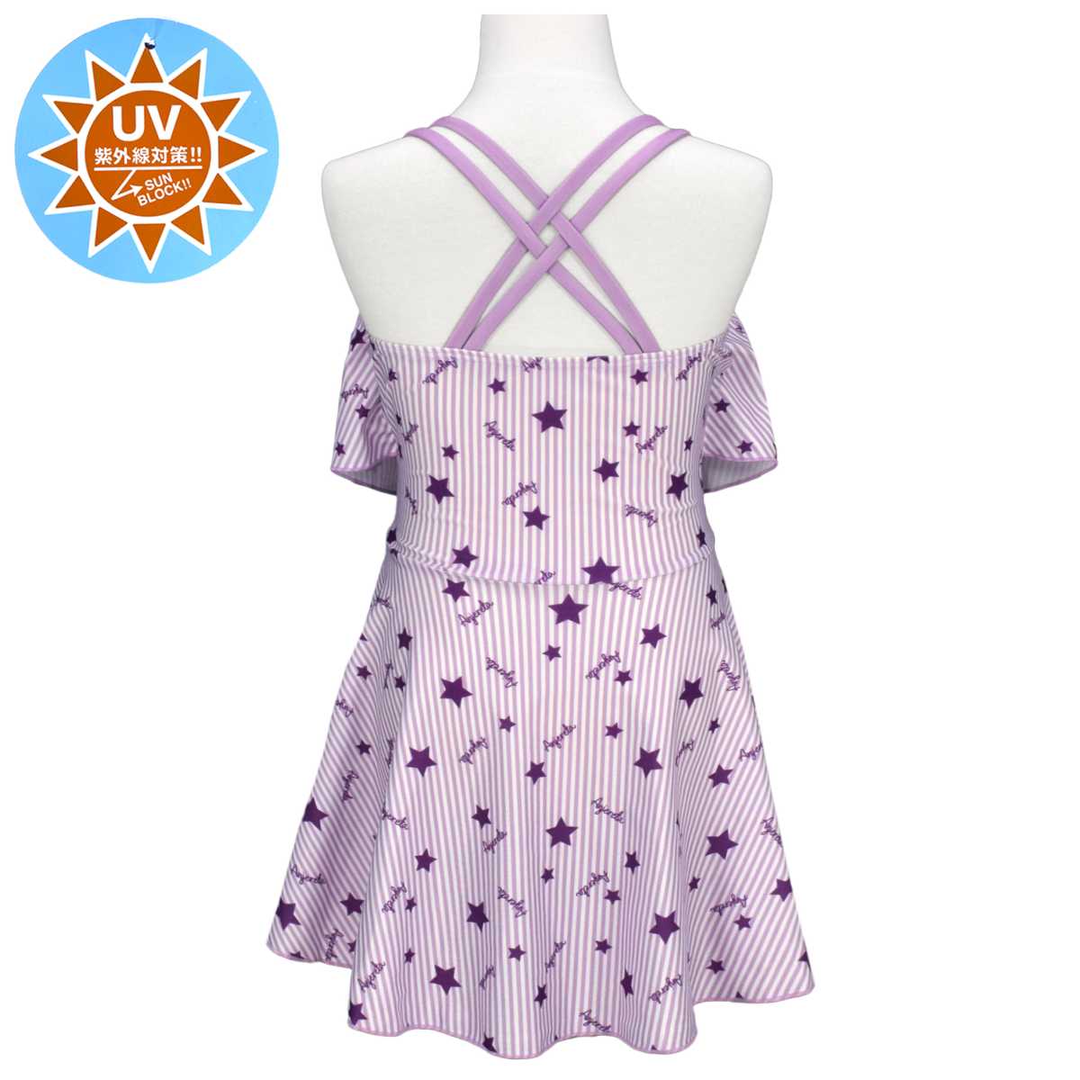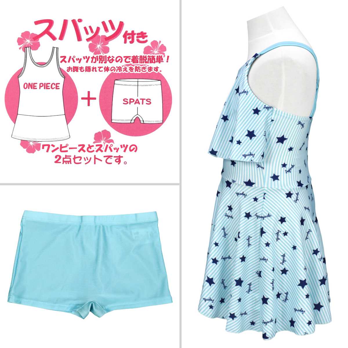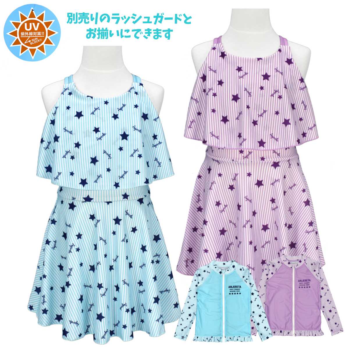 ☆ 商 品 説 明 ☆ UVカット加工 星 ストライププリント ワンピース スパッツ 水着 2点セット 。 ポップなプリントのワンピースにスパッツタイプの ボトムス がついた セパレート水着 です。トップス のフリルで気になる胸元もカバー。UVカット加工で 紫外線対策 もバッチリです。ストラップ調節不可。 130cmは胸元内側に布付き、カップ差し込み口無し。 140cm-160cmはカップ差し込み口あり。カップ取り外し可能。(カップは別売りです。) 別売り同柄 ラッシュガード 品番 865159AS