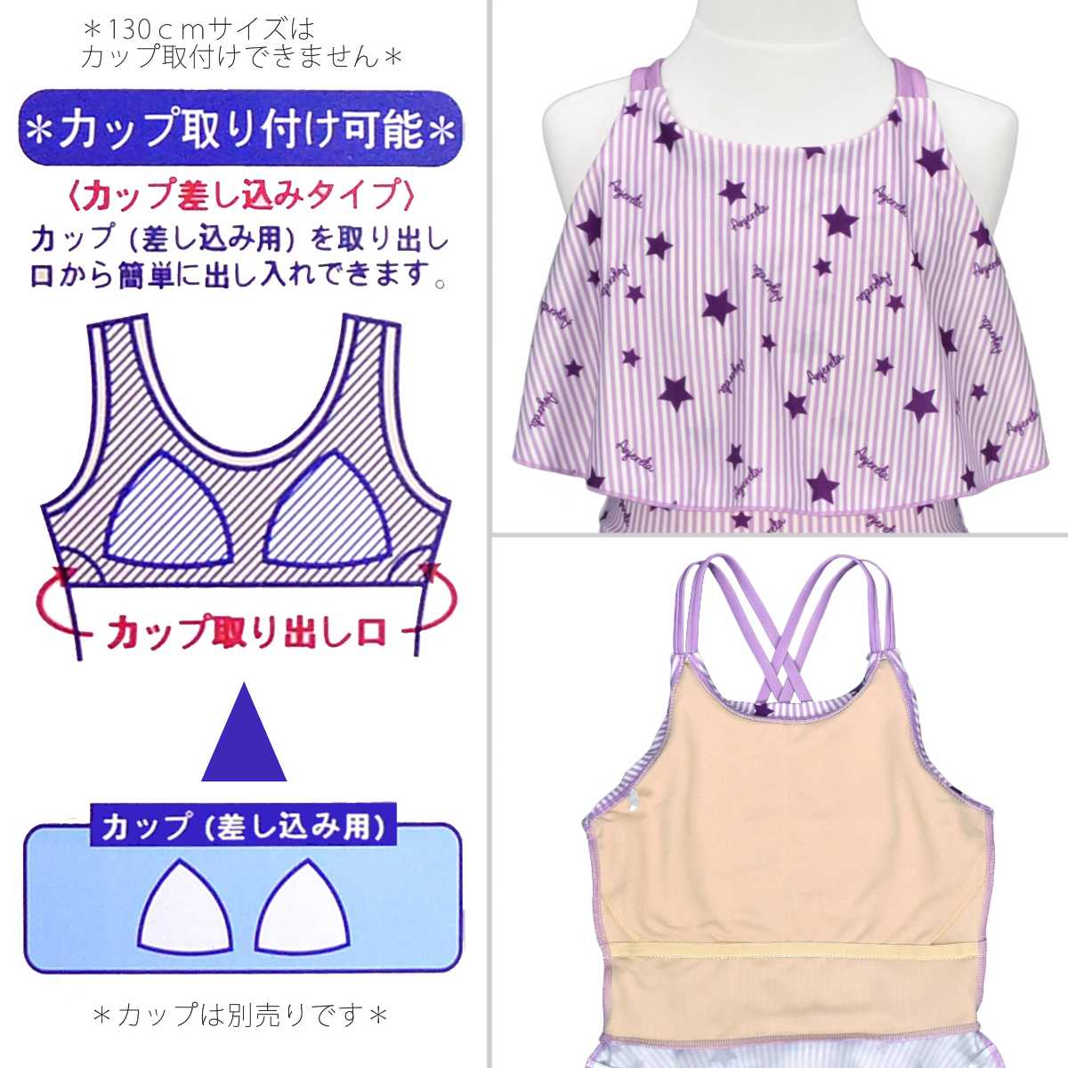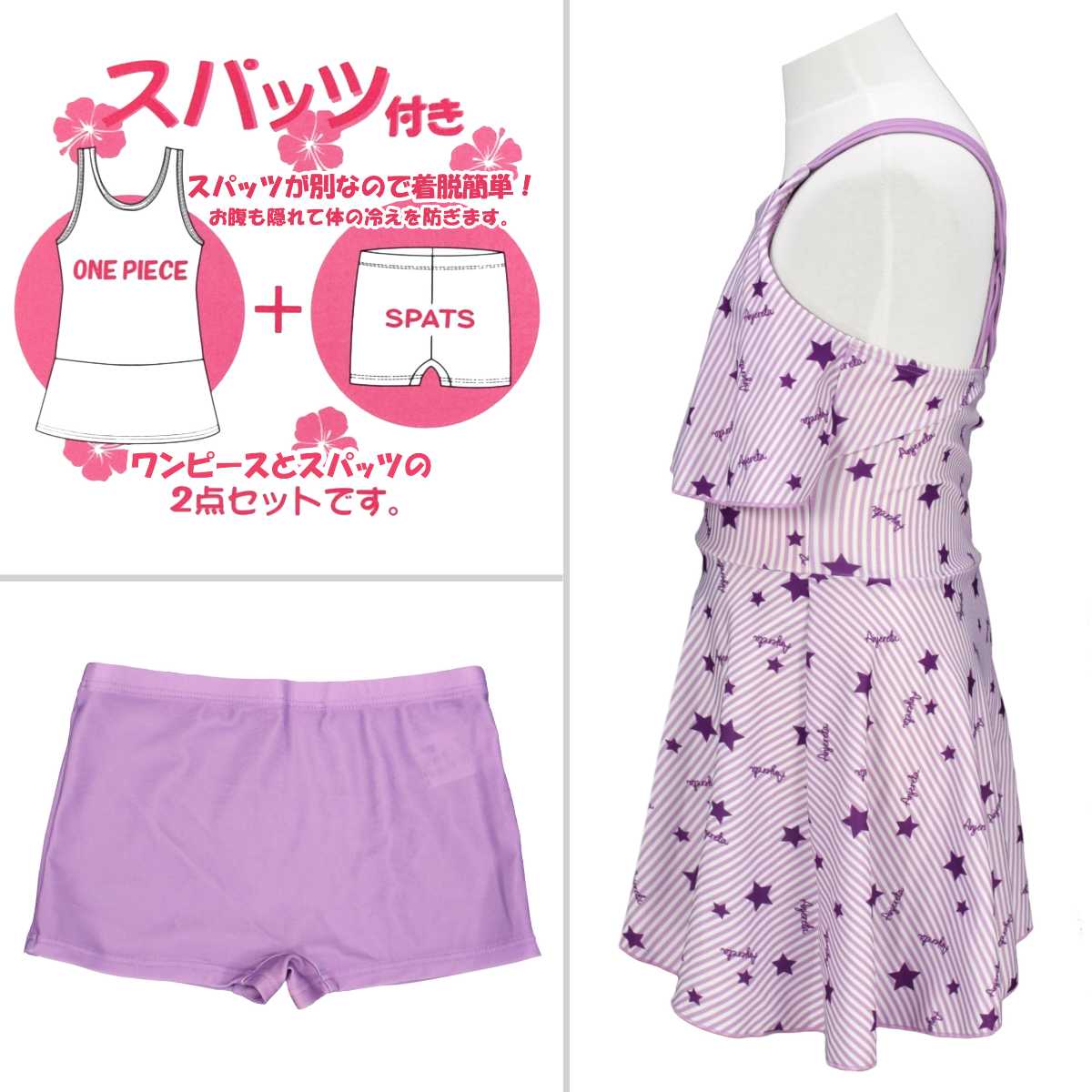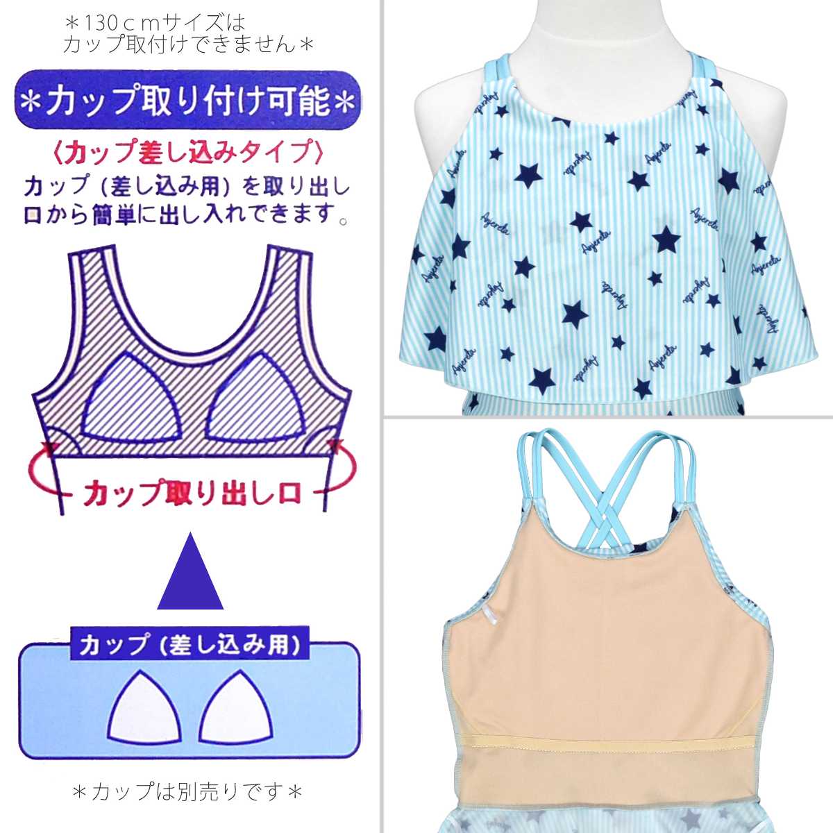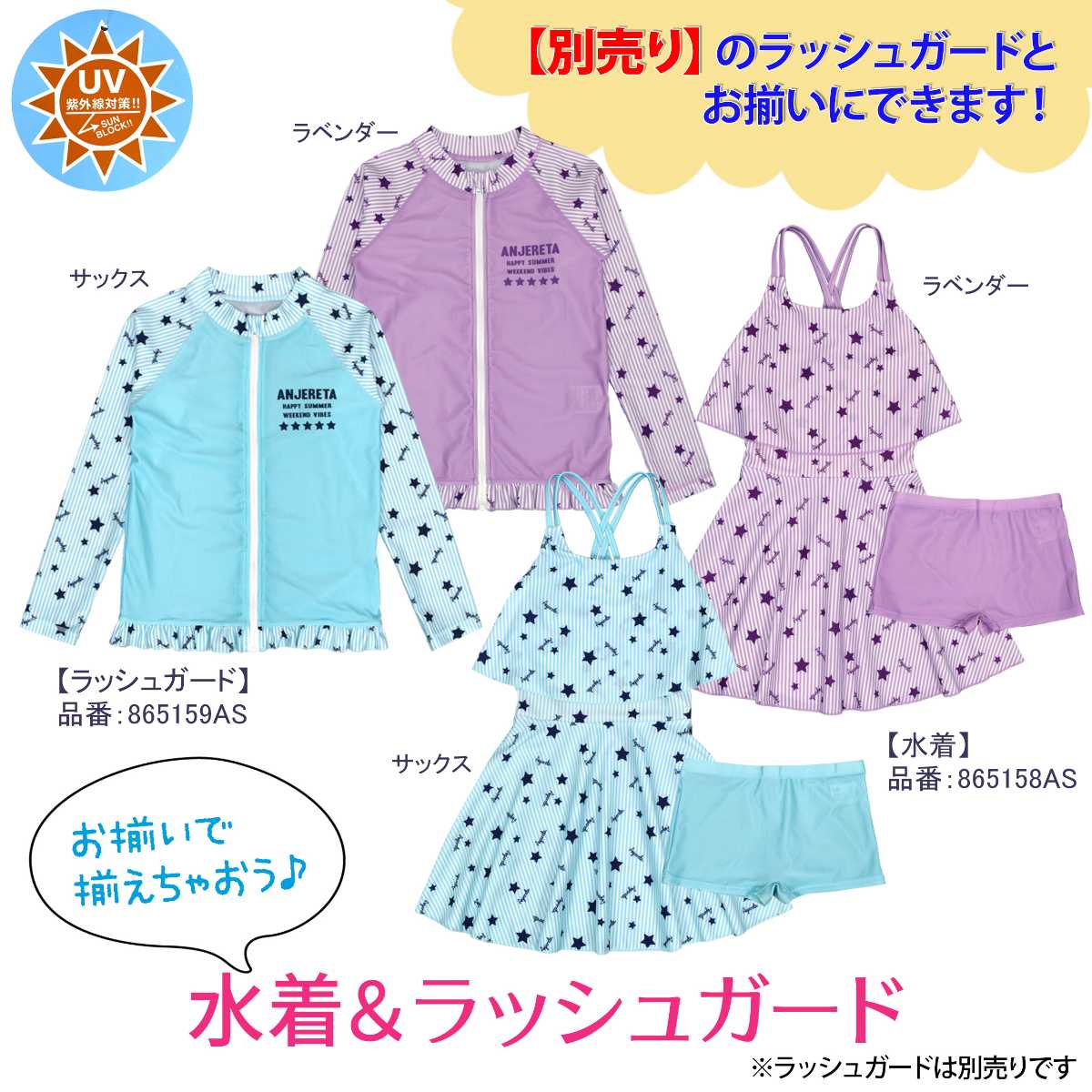 ☆ 商 品 説 明 ☆ UVカット加工 星 ストライププリント ワンピース スパッツ 水着 2点セット 。 ポップなプリントのワンピースにスパッツタイプの ボトムス がついた セパレート水着 です。トップス のフリルで気になる胸元もカバー。UVカット加工で 紫外線対策 もバッチリです。ストラップ調節不可。 130cmは胸元内側に布付き、カップ差し込み口無し。 140cm-160cmはカップ差し込み口あり。カップ取り外し可能。(カップは別売りです。) 別売り同柄 ラッシュガード 品番 865159AS