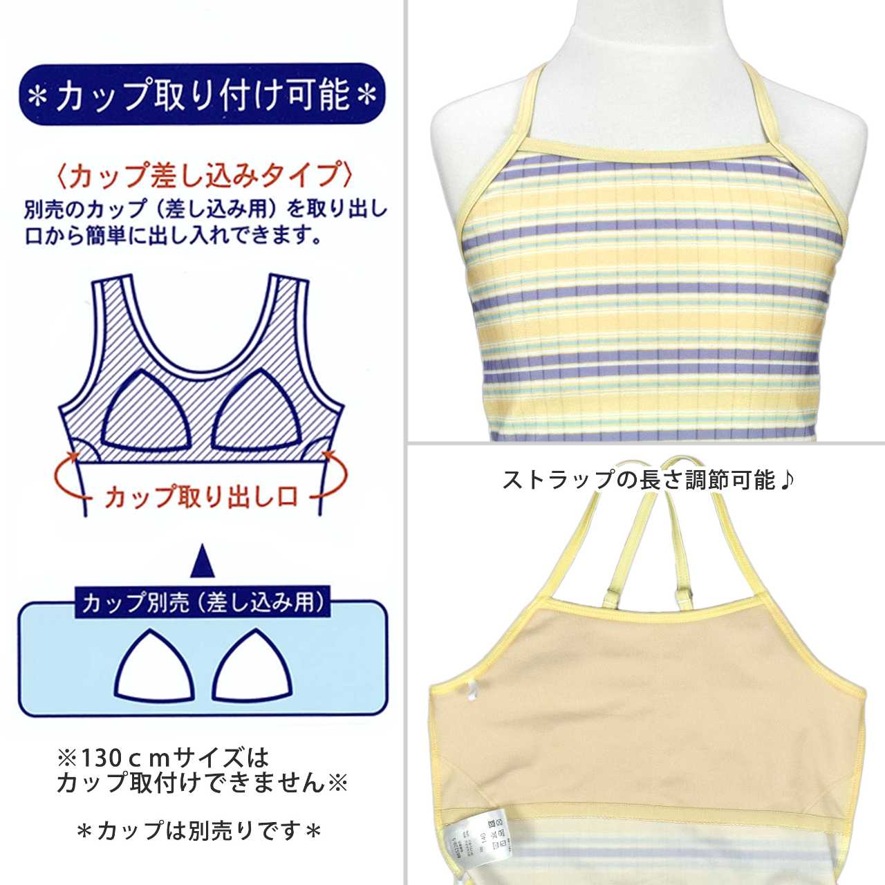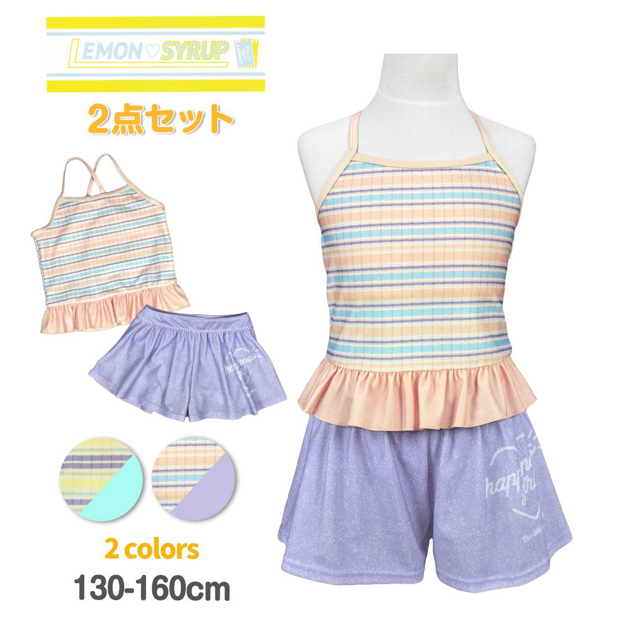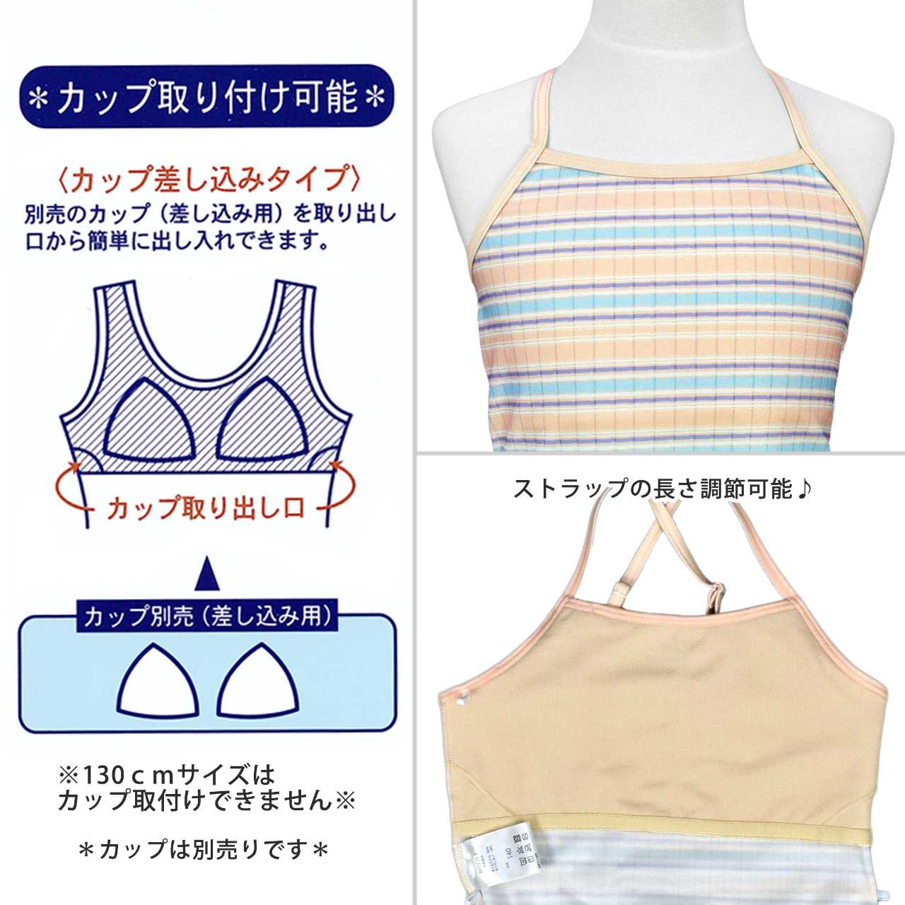 ☆ 商 品 説 明 ☆ UVカット加工 マルチボーダー柄 セパレート 水着 。 セットアップ 2点セット。マルチボーダー のトップスにインナーショーツ付きの キュロットパンツ のセットです。ボトムスはキュロットとショーツの一体型。腰には かわいい パッチ風チケット付き。トップスはストラップの長さ調節可能。 130cmは胸元内側に布付き、カップ差し込み口無し。 140-160cmはカップ差し込み口あり。カップ取り外し可能。(カップは別売りです)
