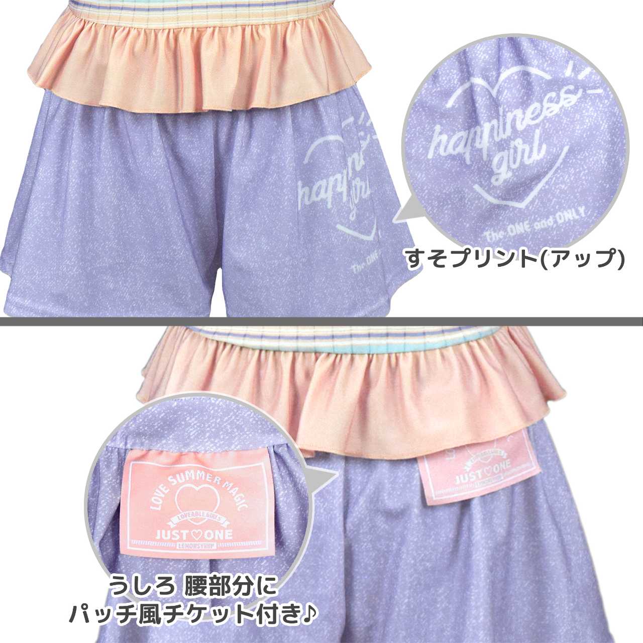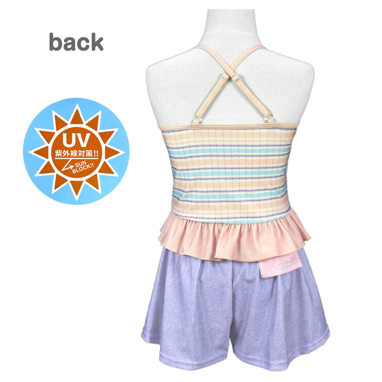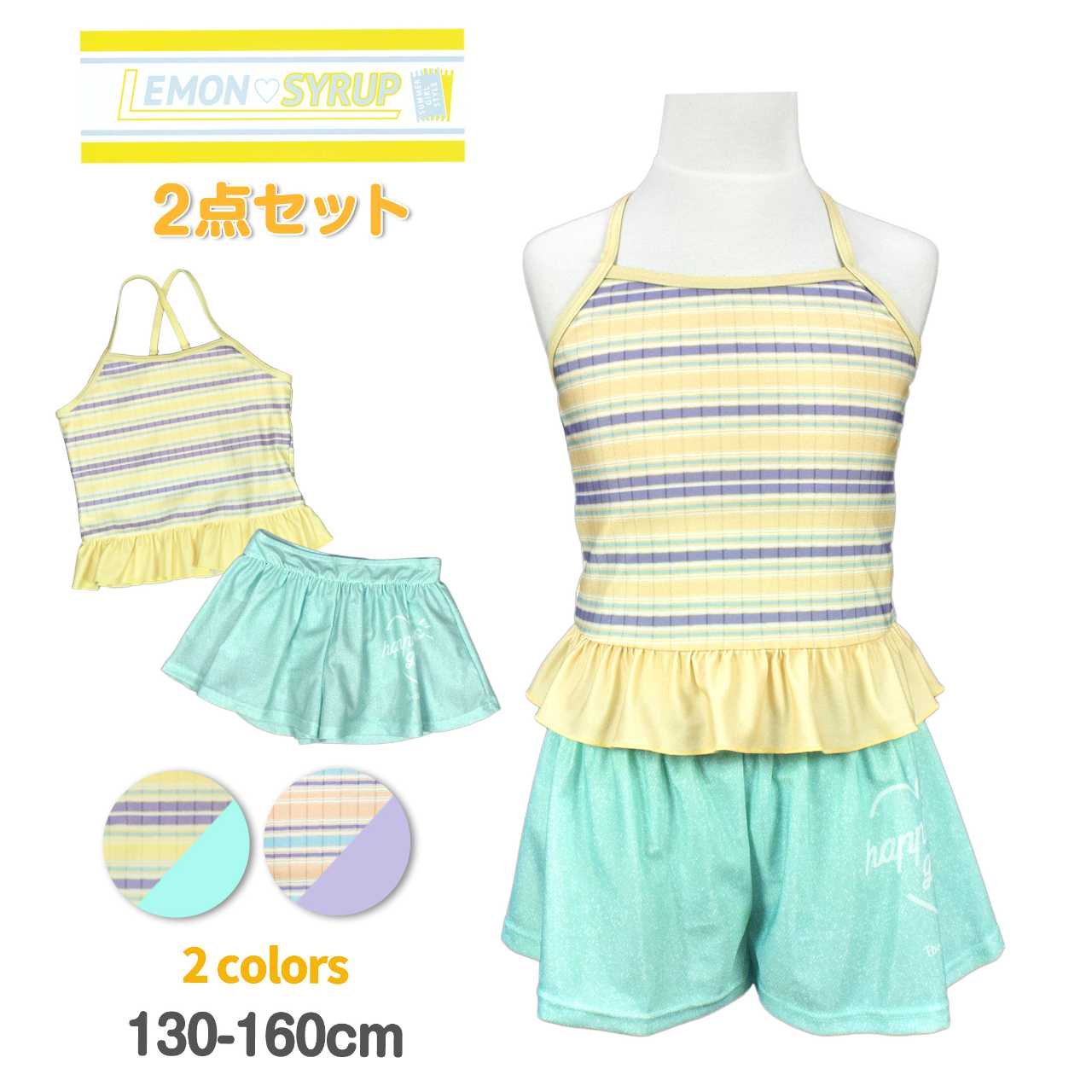 ☆ 商 品 説 明 ☆ UVカット加工 マルチボーダー柄 セパレート 水着 。 セットアップ 2点セット。マルチボーダー のトップスにインナーショーツ付きの キュロットパンツ のセットです。ボトムスはキュロットとショーツの一体型。腰には かわいい パッチ風チケット付き。トップスはストラップの長さ調節可能。 130cmは胸元内側に布付き、カップ差し込み口無し。 140-160cmはカップ差し込み口あり。カップ取り外し可能。(カップは別売りです)