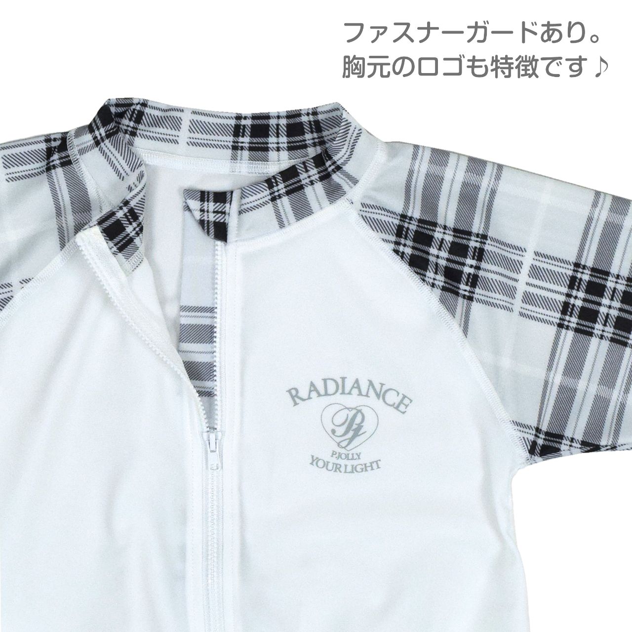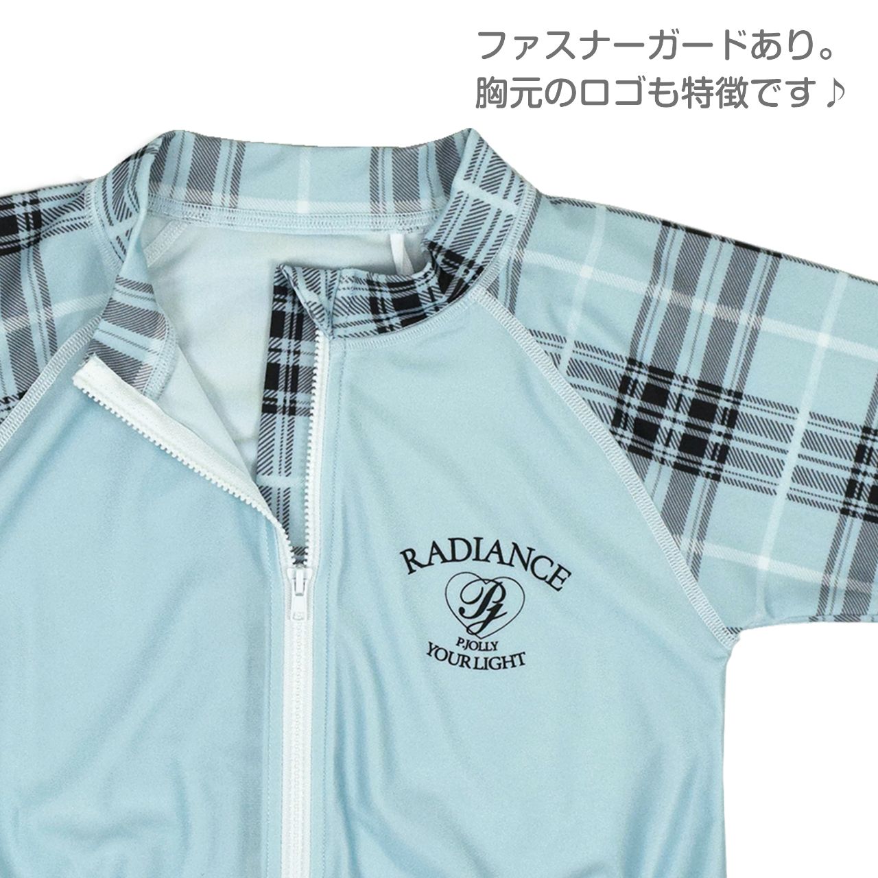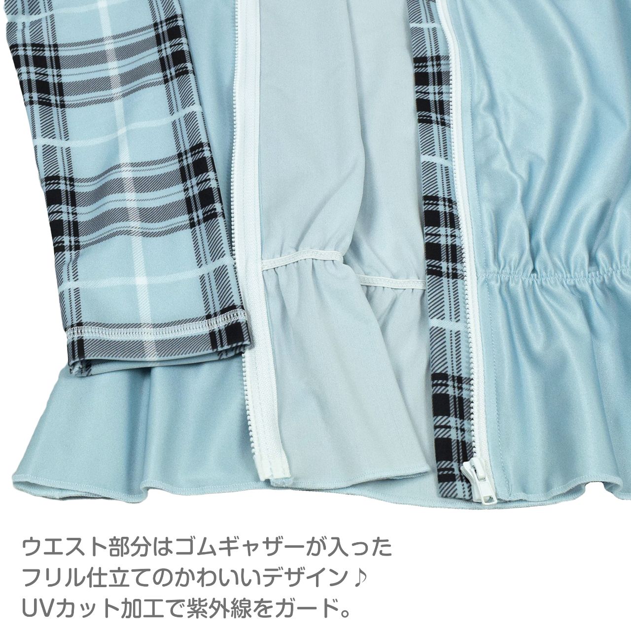 ☆ 商 品 説 明 ☆ UVカット加工 チェック使い 長袖 ラッシュガード 。 袖チェック柄 長袖ラッシュガードです。着脱の簡単な 前開きファスナー、ファスナーガード付き。UVカット 加工で紫外線をガード。 ウエスト部分は ゴムギャザーが入ったフリル仕立ての かわいい デザイン。お手持ちの水着ともコーデしやすい長袖ラッシュガードです。