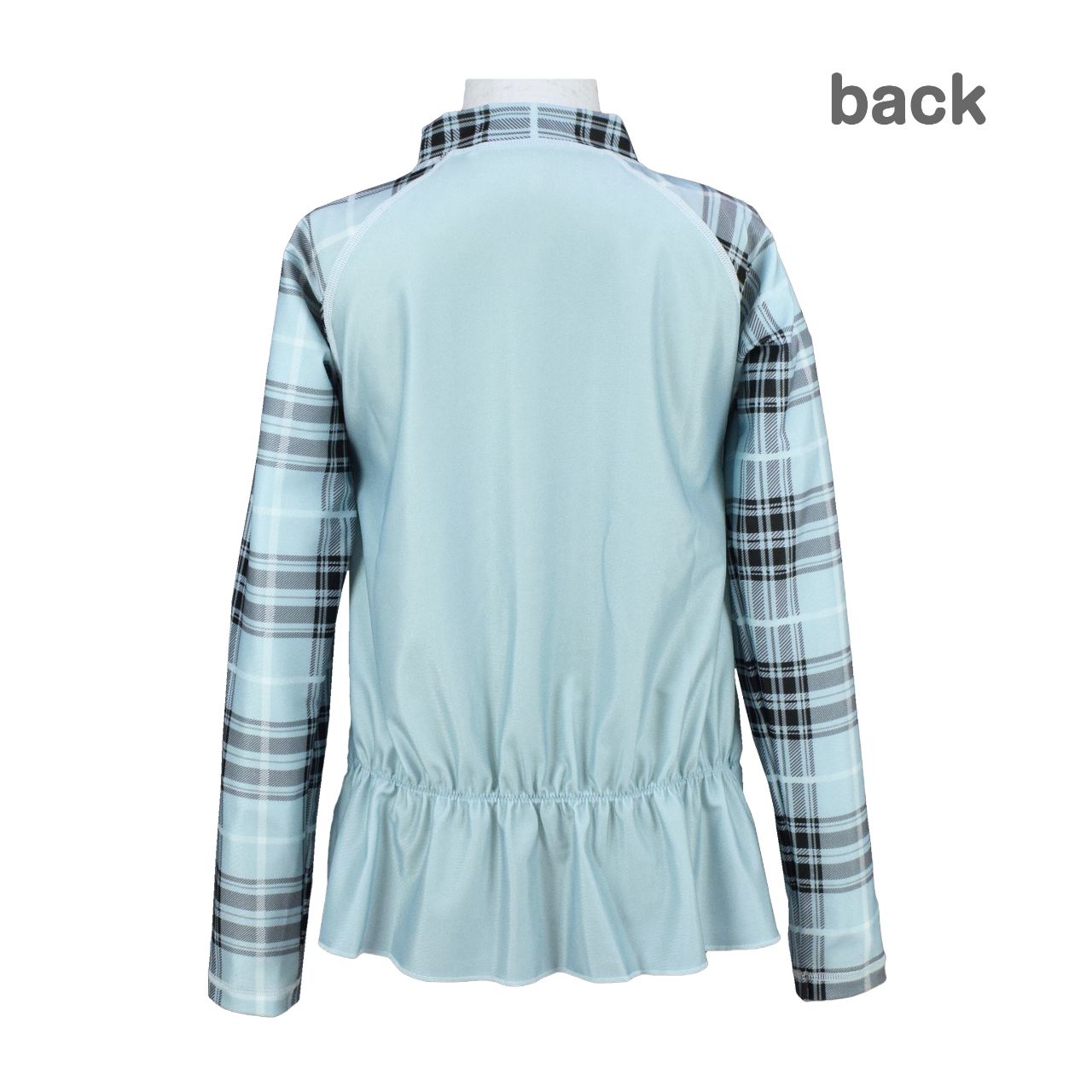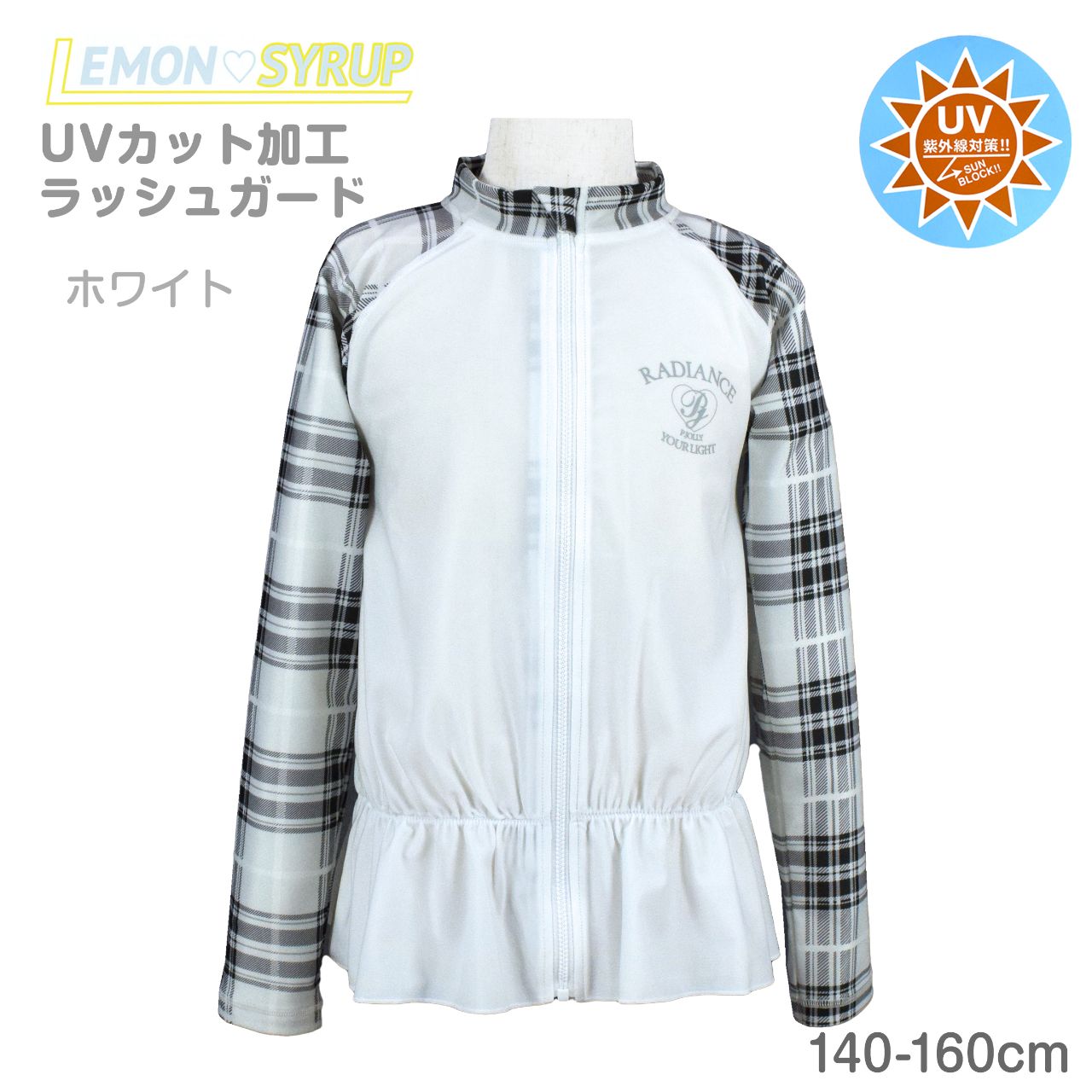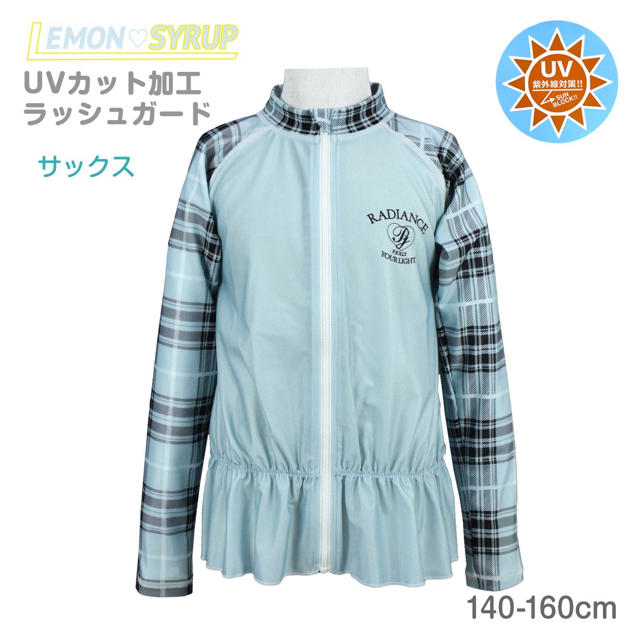 ☆ 商 品 説 明 ☆ UVカット加工 チェック使い 長袖 ラッシュガード 。 袖チェック柄 長袖ラッシュガードです。着脱の簡単な 前開きファスナー、ファスナーガード付き。UVカット 加工で紫外線をガード。 ウエスト部分は ゴムギャザーが入ったフリル仕立ての かわいい デザイン。お手持ちの水着ともコーデしやすい長袖ラッシュガードです。