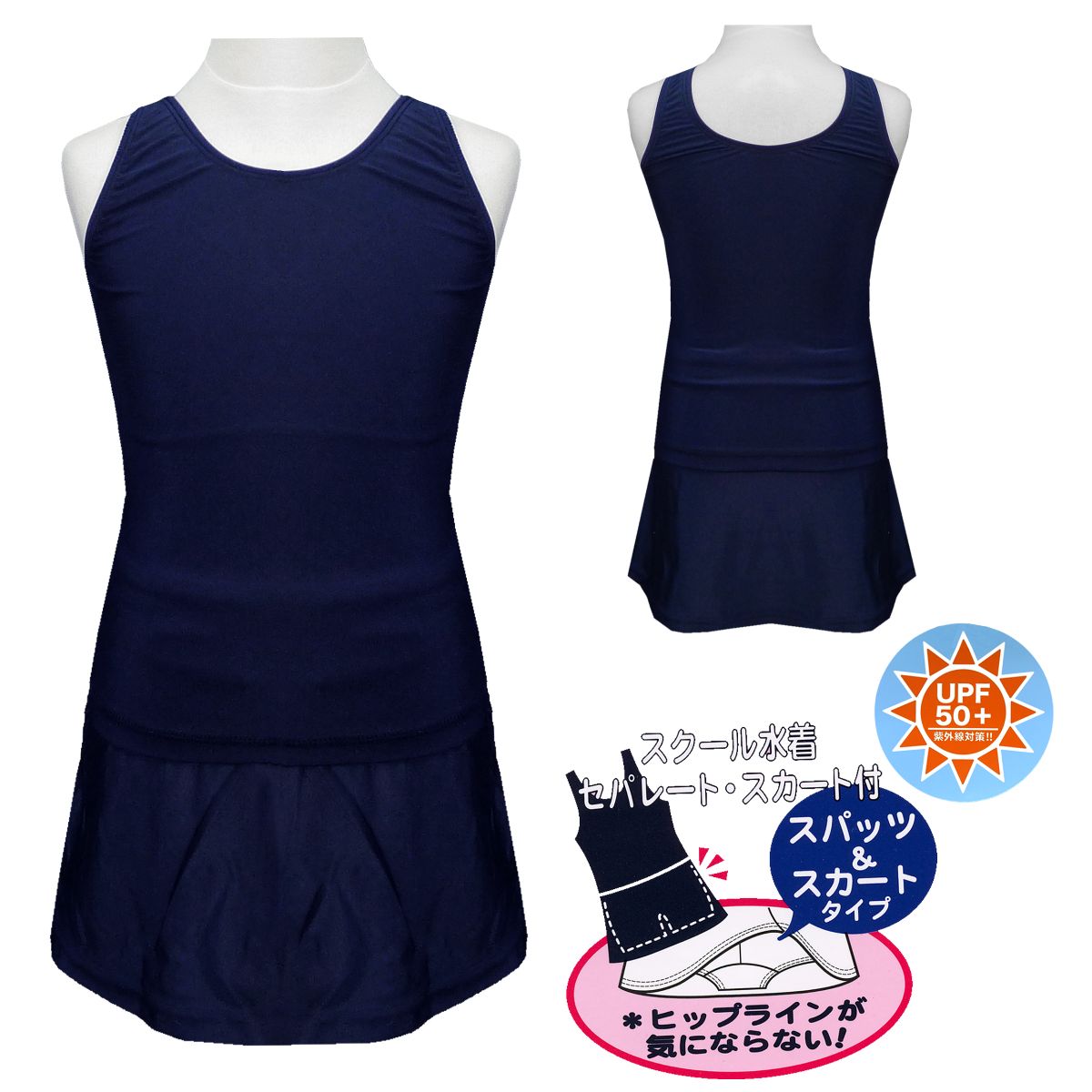 ☆ 商 品 説 明 ☆ UPF+50 UVカット加工 セパレートタイプ スカパン スクール水着 。 トップスはUカットの定番形。胸元は110から130サイズまでは布二重、カップ不可。140から170サイズはカップ付き、取り外し可能。トップスとボトムスを留めるボタンがついていて、めくれ防止になります。 ボトムス はスカートと1分丈パンツがくっついたタイプです。スカートなのでヒップラインも気にならないデザイン。 スカートはウエストゴム。ゴム取換え穴無し。 紐有(紐は丸紐と平紐がありますがご指定は出来ません)