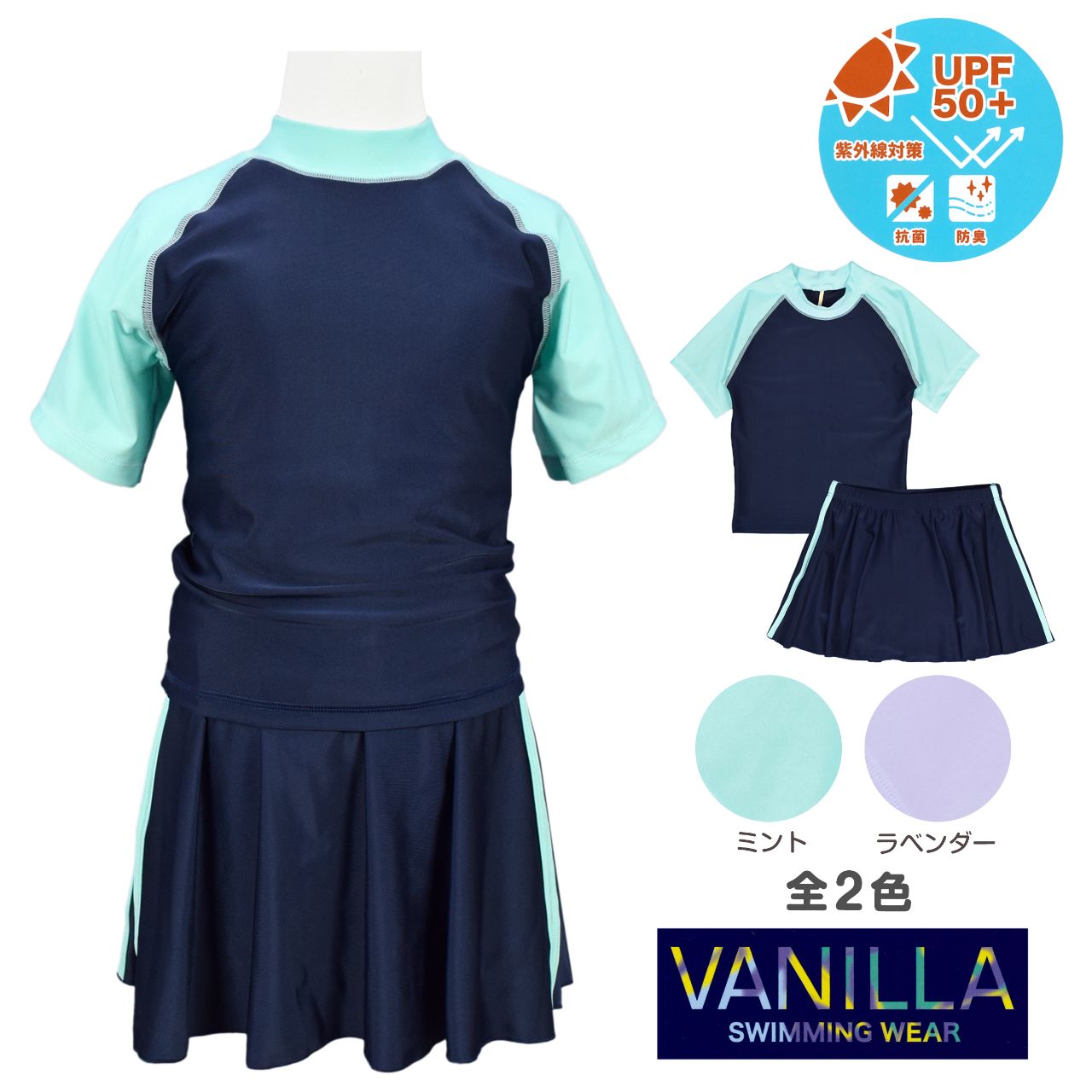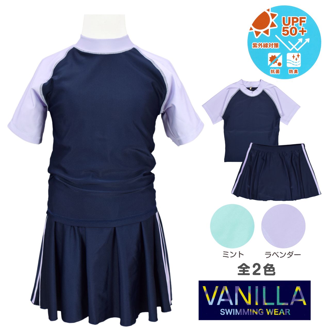 ☆ 商 品 説 明 ☆ UPF50+ UVカット加工 防臭加工 セパレートタイプ セットアップ スクール水着 です。 トップスは、取り外し可能なカップ付き 半袖 ラッシュガード タイプ。できるだけ肌見えを控えたデザイン。ボトムスは スパッツとフレアスカートが一つになった スカパンタイプ。ヒップラインが気になるお子様にオススメです。トップスとボトムがサイドのボタンで留められるので おなか回りもガードしてくれます。スカートはウエストゴム、ひも付き、ゴム取り替え穴なし。トップスにネームタグ付き。