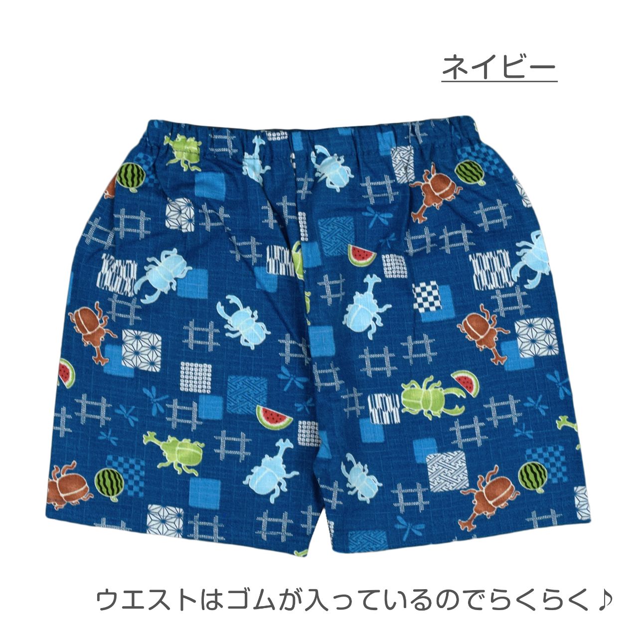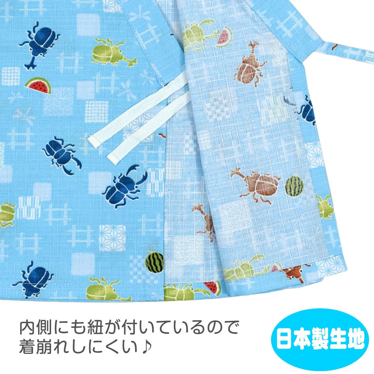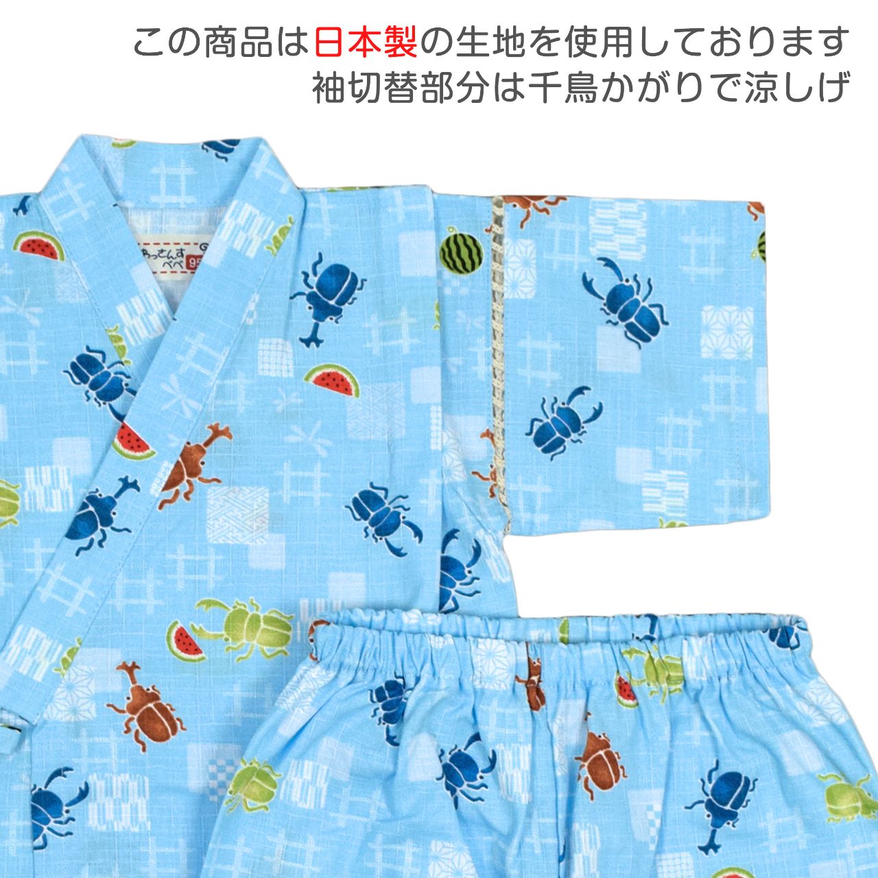 ☆ 商 品 説 明 ☆ 日本製の生地使用 綿100% サザンクロス地 昆虫柄 甚平 。 カブトムシ クワガタ スイカ かわいい じん平 上下セット です。安心の日本製 綿100%生地使用です。トップスは、内側にも紐が付いていて着崩れしにくく、袖の切替部分は、千鳥かがりとなっているので涼し気。パンツのウエストはゴム。パンツ、ウェストはゴム。紐なし。ゴム取換え穴あり。 日本企画・日本製生地使用(縫製中国) *模様や柄の出方は個々の商品によってそれぞれ異なります。