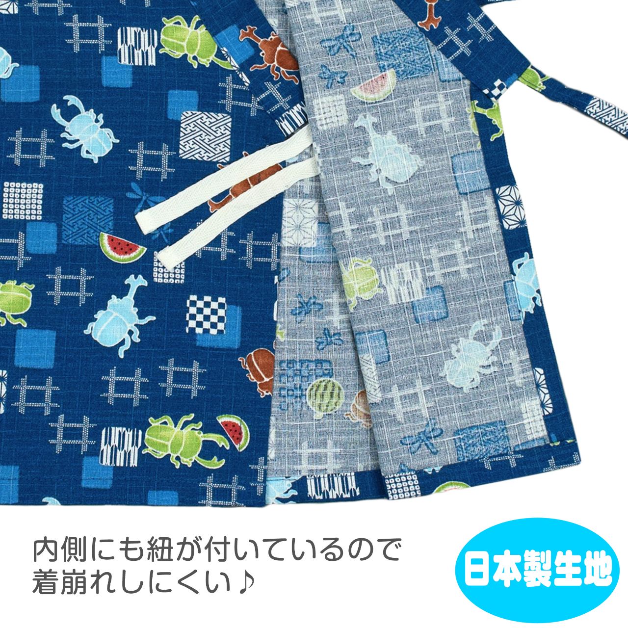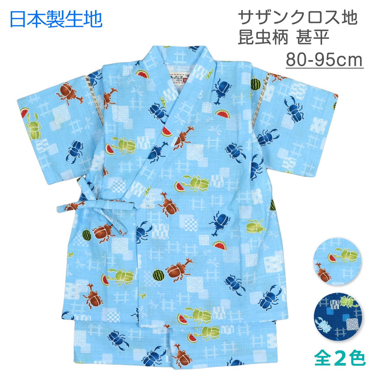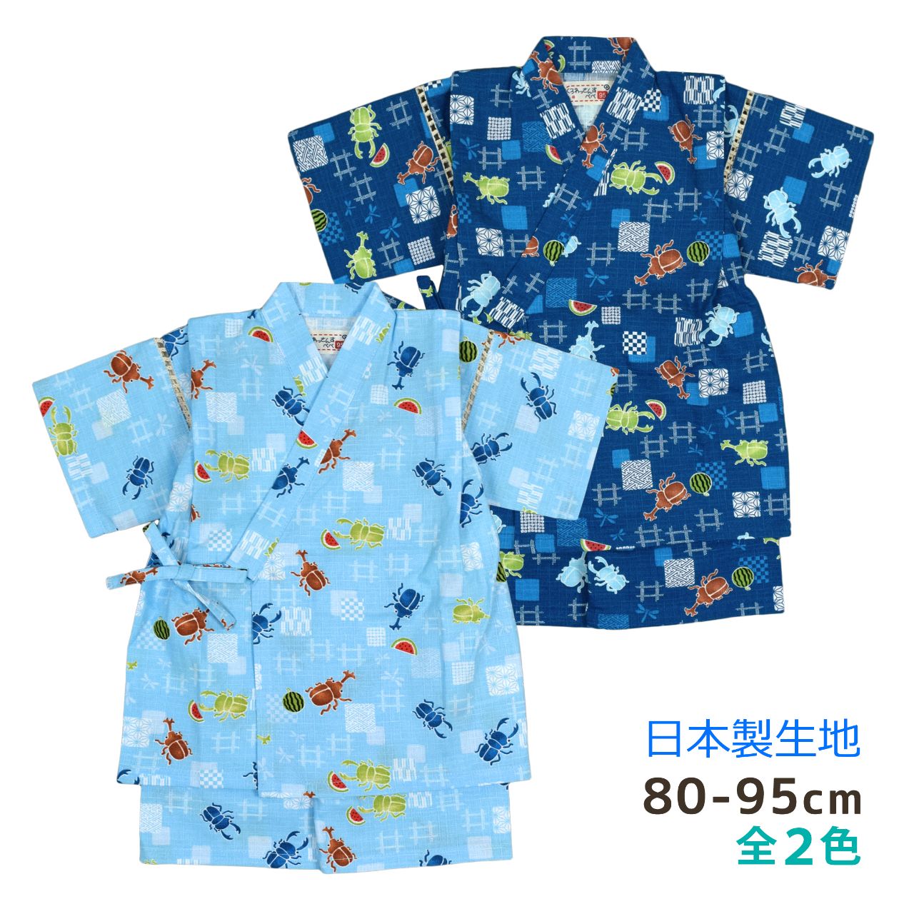 ☆ 商 品 説 明 ☆ 日本製の生地使用 綿100% サザンクロス地 昆虫柄 甚平 。 カブトムシ クワガタ スイカ かわいい じん平 上下セット です。安心の日本製 綿100%生地使用です。トップスは、内側にも紐が付いていて着崩れしにくく、袖の切替部分は、千鳥かがりとなっているので涼し気。パンツのウエストはゴム。パンツ、ウェストはゴム。紐なし。ゴム取換え穴あり。 日本企画・日本製生地使用(縫製中国) *模様や柄の出方は個々の商品によってそれぞれ異なります。