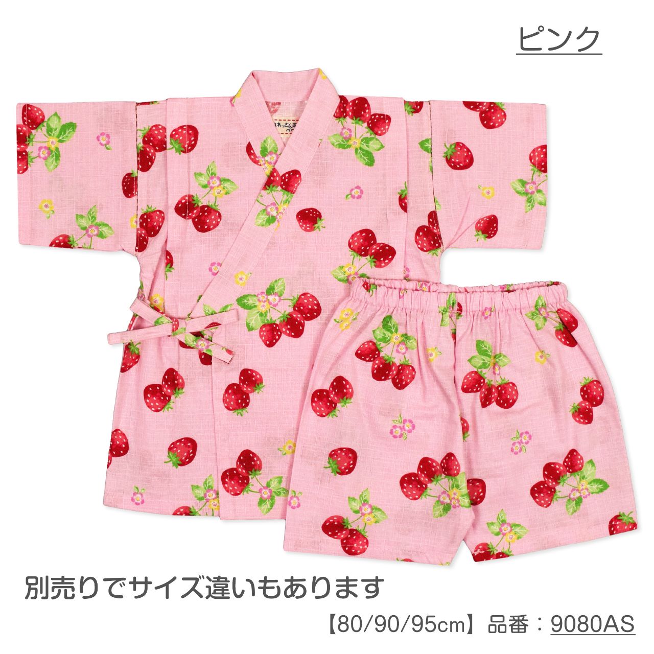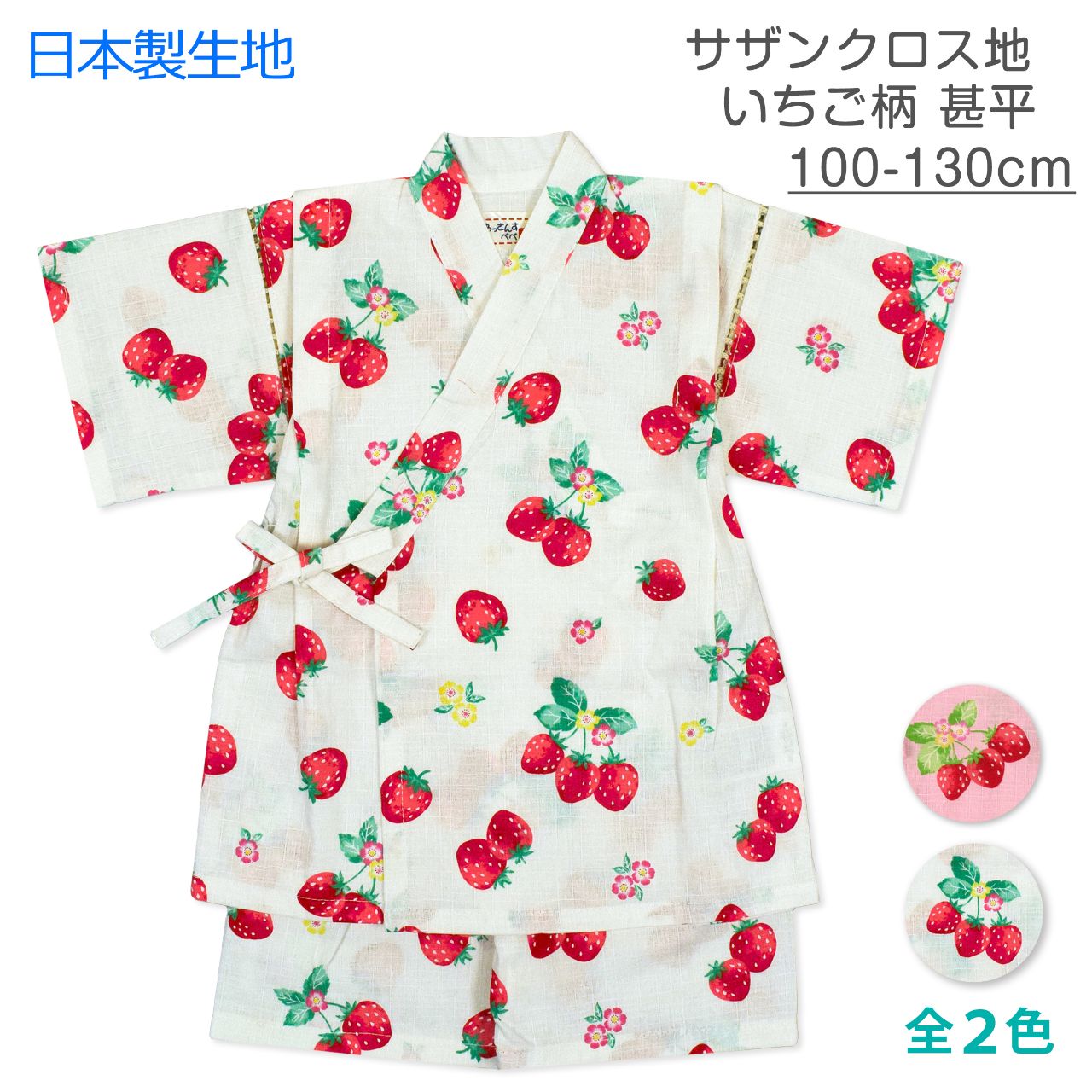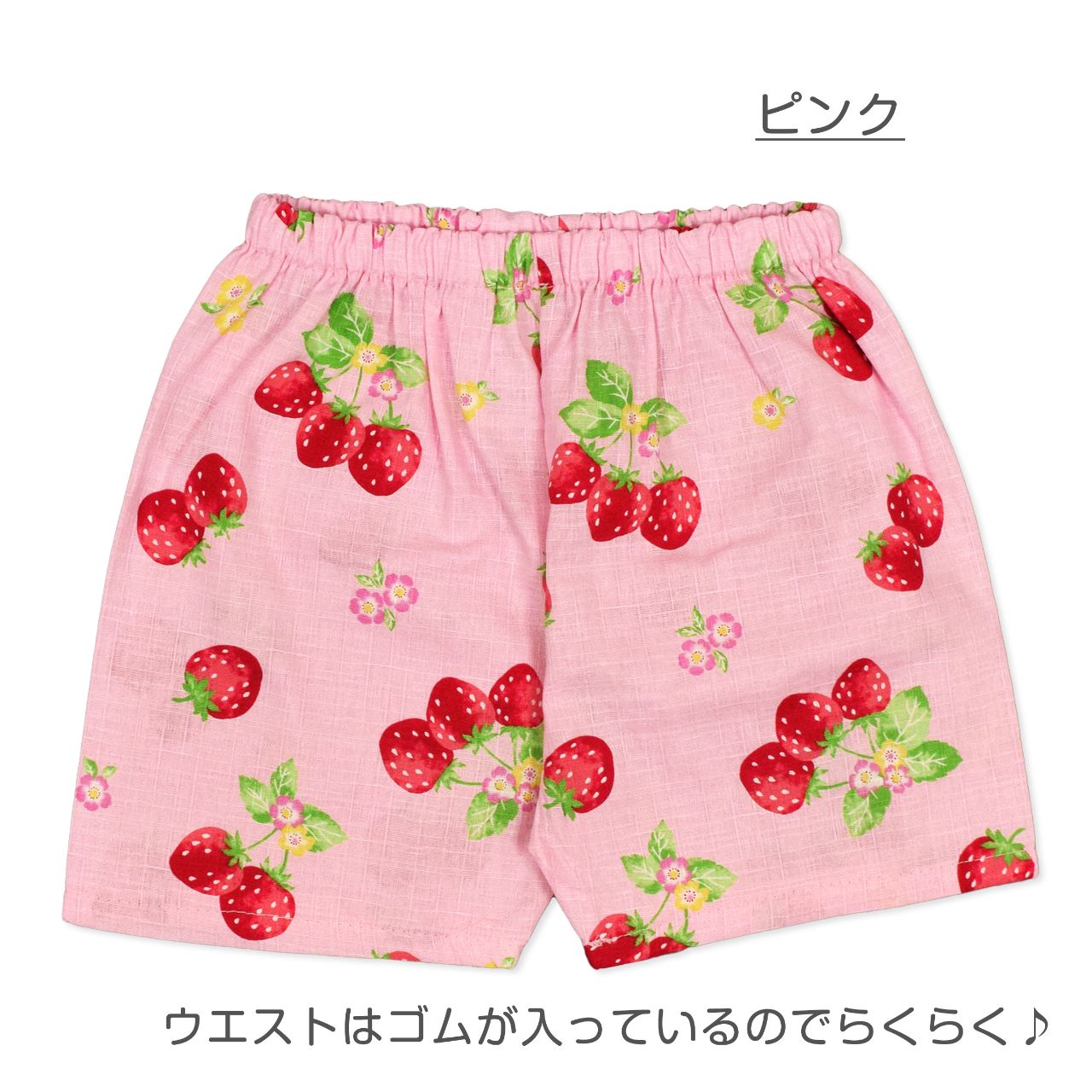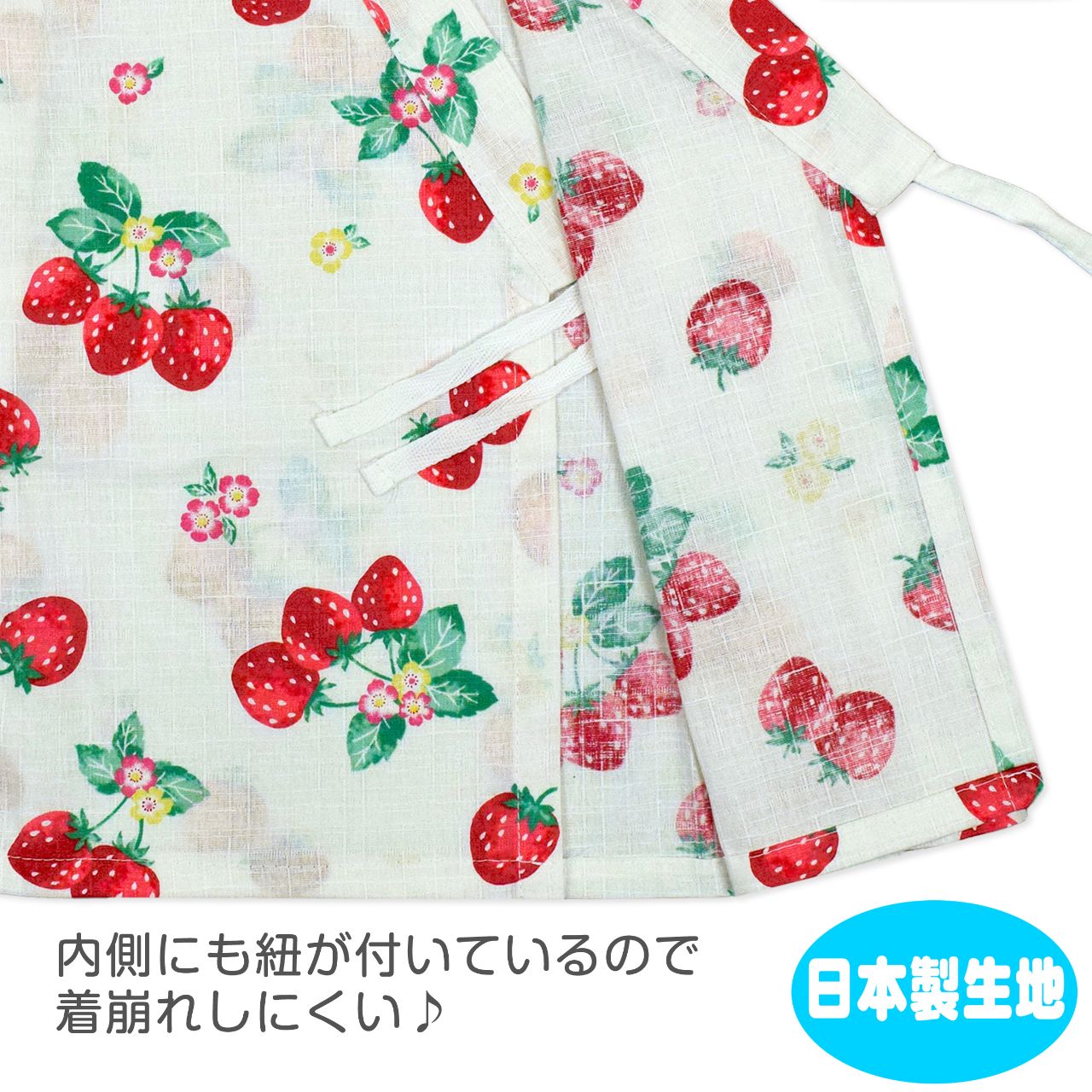 ☆ 商 品 説 明 ☆ 日本製の生地使用 綿100% サザンクロス地 いちご柄 甚平 。 真っ赤な 可愛いい いちご じん平 上下セット です。安心の日本製 綿100%生地使用です。トップスは、内側にも紐が付いていて着崩れしにくく、袖の切替部分は、千鳥かがりとなっているので涼し気。パンツのウエストはゴム。パンツ、ウェストはゴム。紐なし。ゴム取換え穴あり。 日本企画・日本製生地使用(縫製中国) *模様や柄の出方は個々の商品によってそれぞれ異なります。