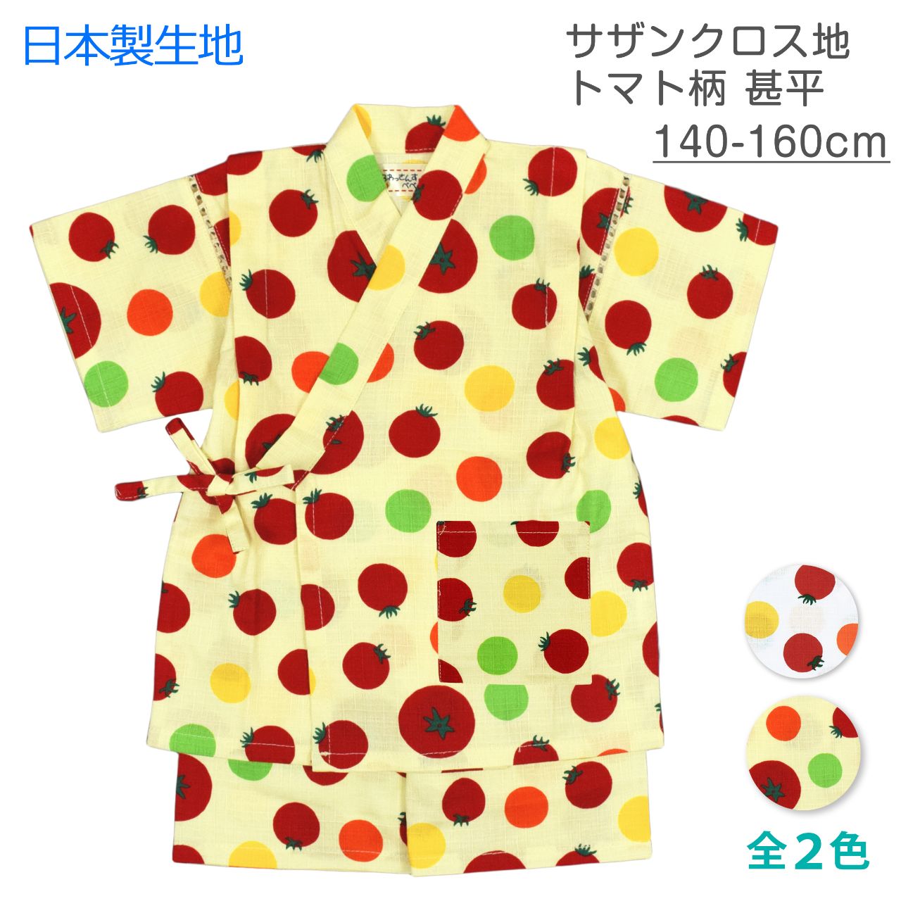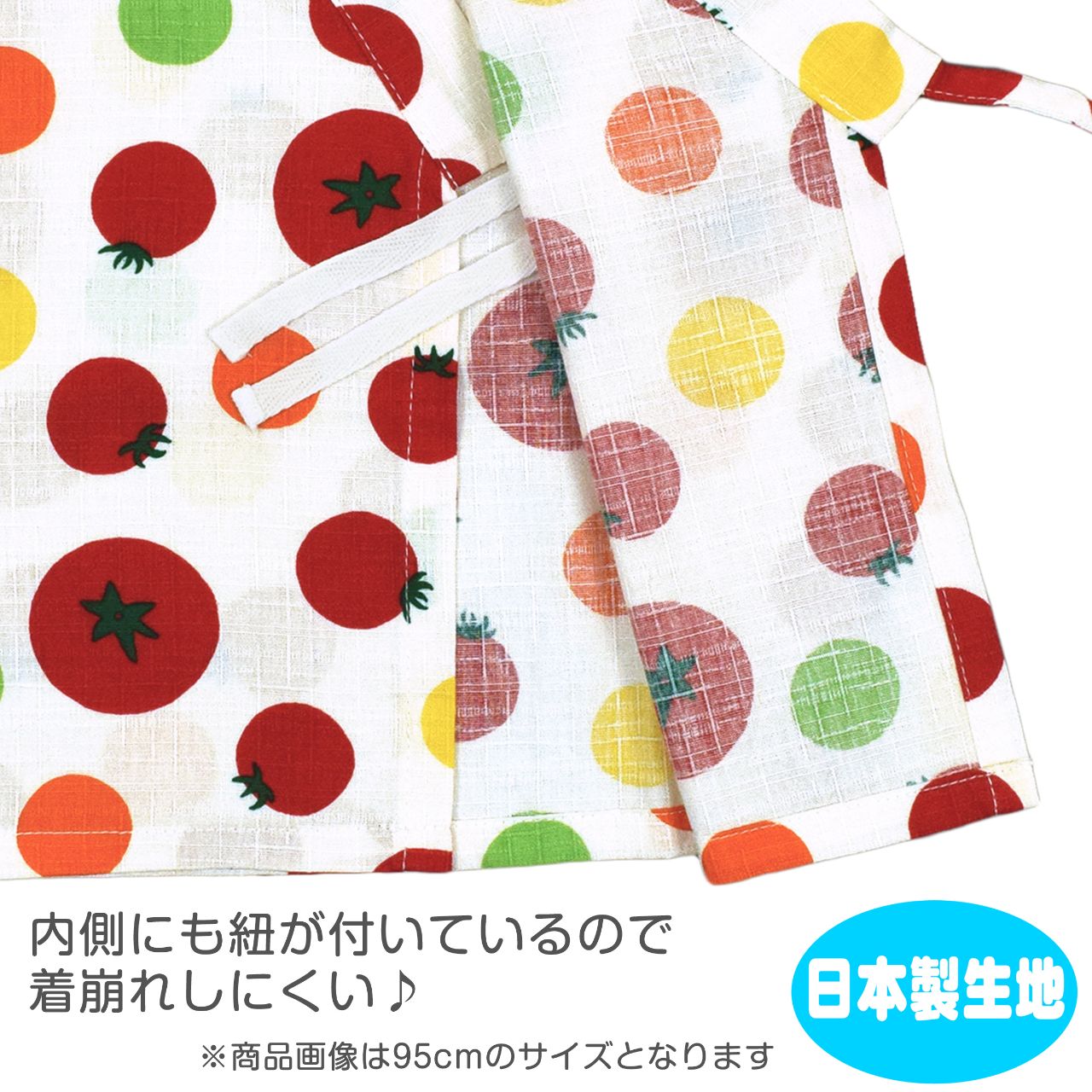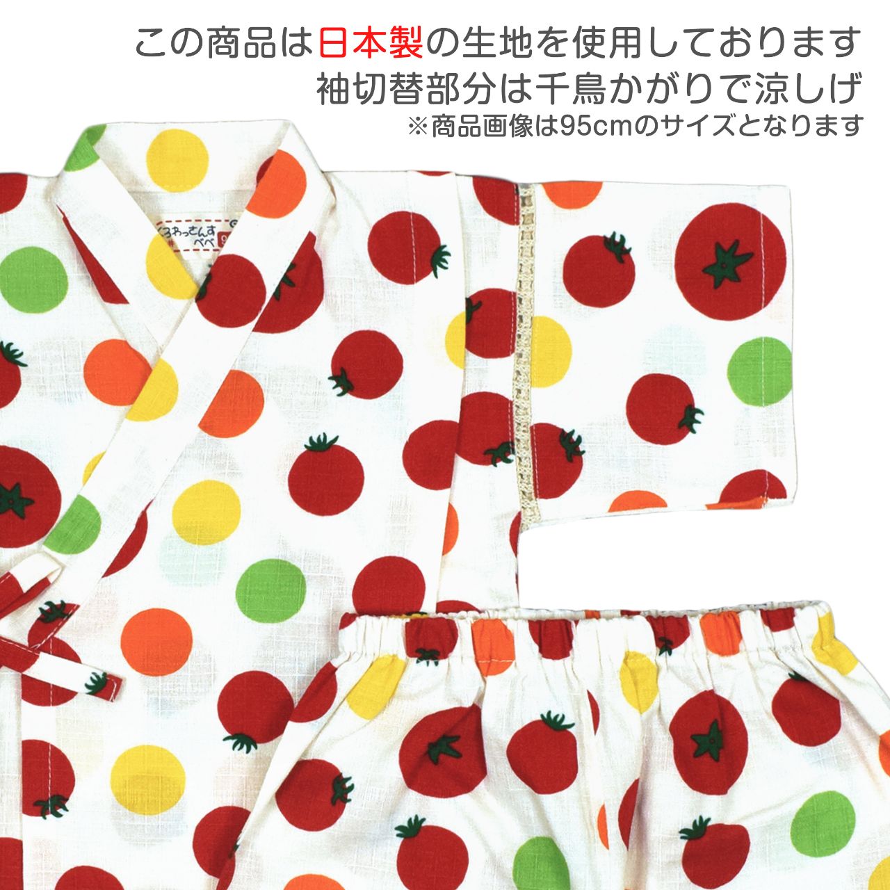 ☆ 商 品 説 明 ☆ 日本製の生地使用 綿100% サザンクロス地 トマト柄 甚平 。 ころころしたカラフルな かわいい トマト柄 じん平 上下セット です。安心の日本製 綿100%生地使用です。 トップスは、内側にも紐が付いていて着崩れしにくく、袖の切替部分は、千鳥かがりとなっているので涼し気。 パンツのウエストはゴム。ゴム取換え穴あり。前身頃左下にポケット一つ。