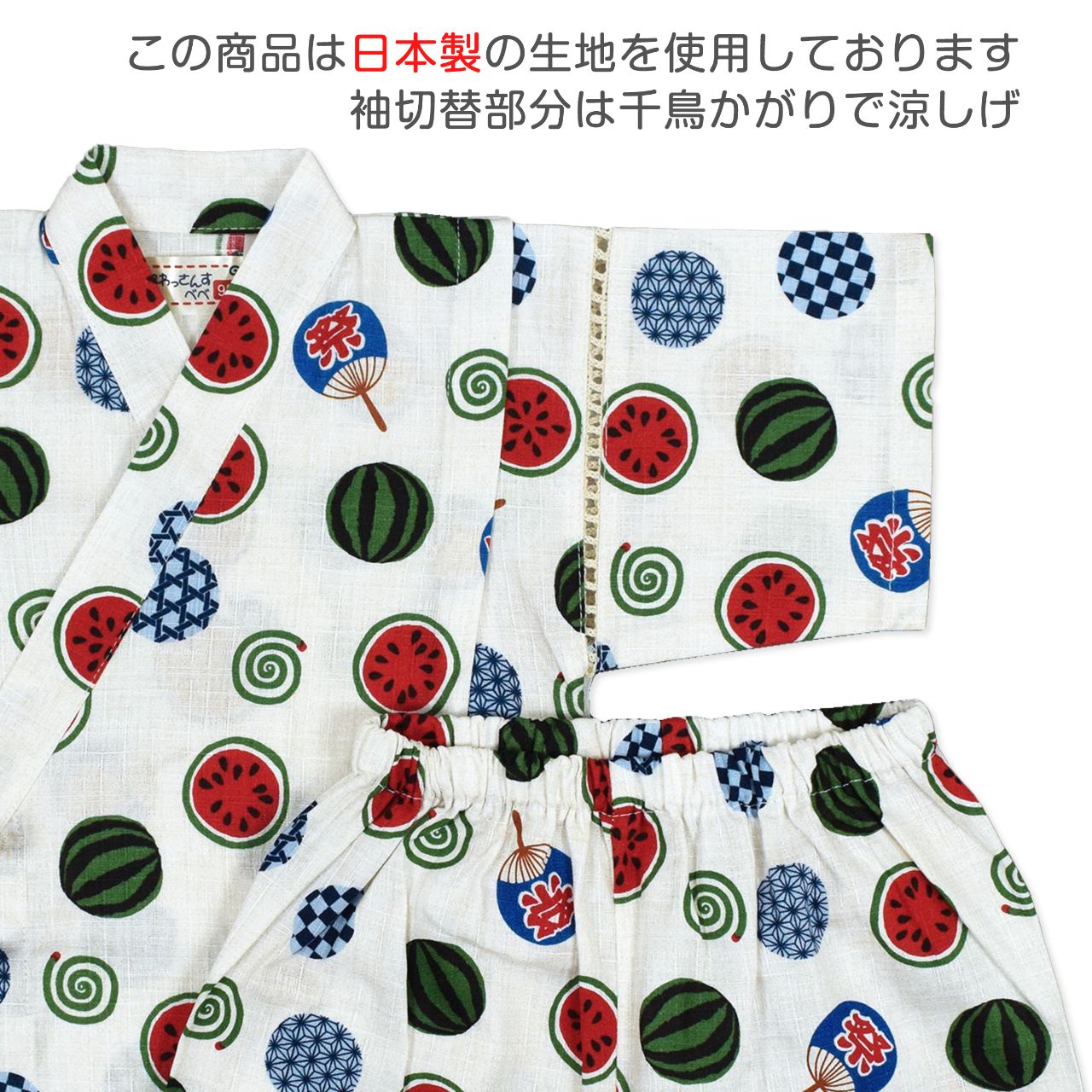 ☆ 商 品 説 明 ☆ 日本製生地使用 綿100% サザンクロス地 すいか柄 甚平 。 夏らしいスイカやうちわ柄が 可愛い じん平 上下セット です。安心の日本製、綿100%サザンクロスの生地使用です。トップスは、内側にも紐が付いていて着崩れしにくく、袖の切替部分は、千鳥かがりとなっているので涼し気。パンツのウエストはゴム。紐なし。ゴム取換え穴あり。 日本企画・日本製生地使用(縫製中国) *模様や柄の出方は個々の商品によってそれぞれ異なります。