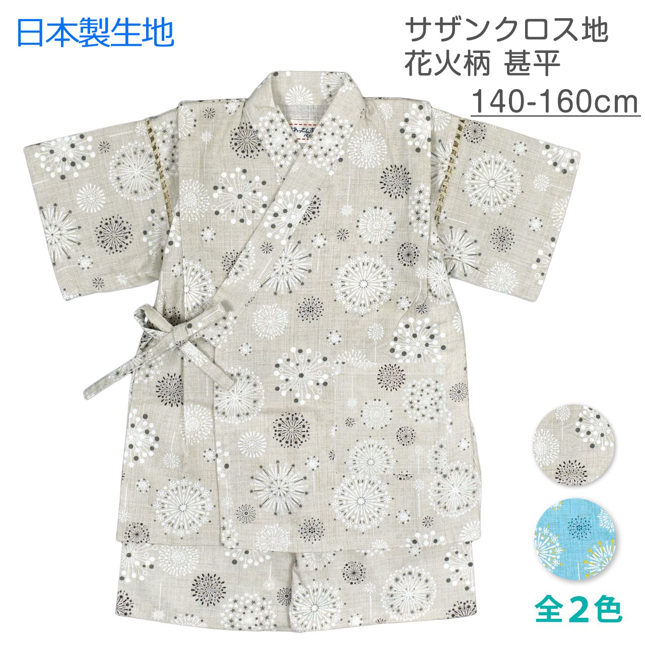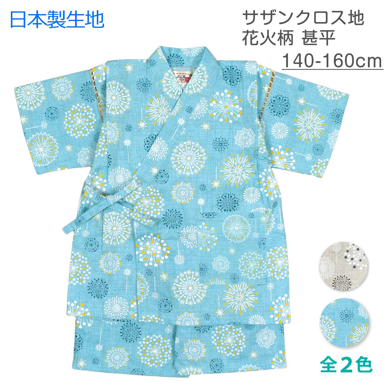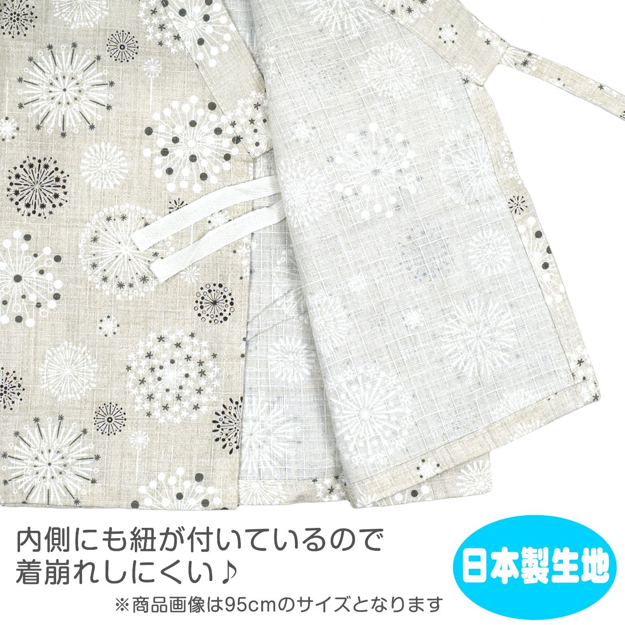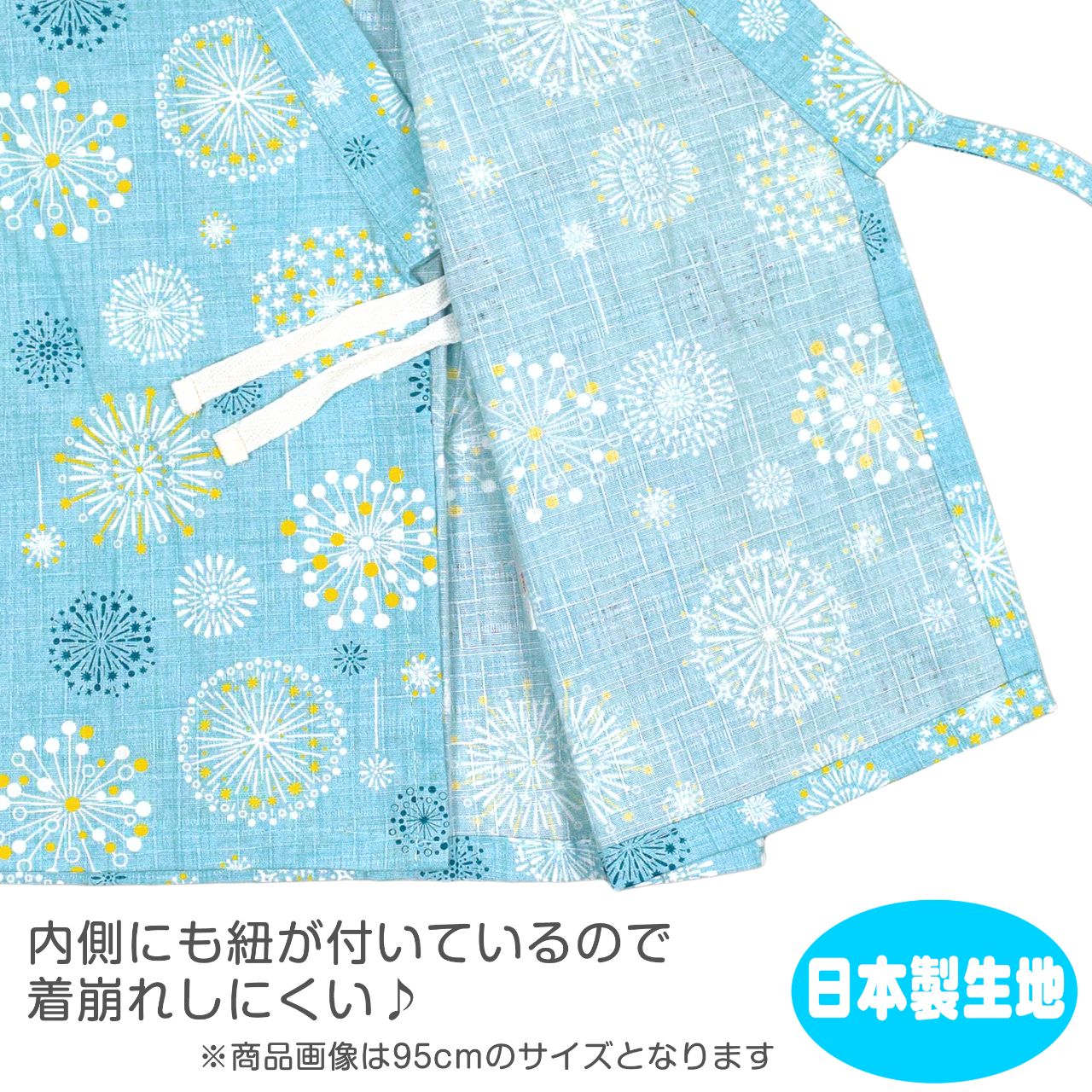 ☆ 商 品 説 明 ☆ 日本製の生地使用 綿100% サザンクロス地 北欧花火柄 甚平 。 大小様々な花火のプリントがおしゃれな じん平 上下セット です。安心の日本製 綿100%生地使用です。 トップスは、内側にも紐が付いていて着崩れしにくく、袖の切替部分は、千鳥かがりとなっているので涼し気。 パンツ、ウエストはゴム。紐なし。ゴム取換え穴あり。前身頃左下にポケット一つ。 日本企画・日本製生地使用(縫製中国) *模様や柄の出方は個々の商品によってそれぞれ異なります。
