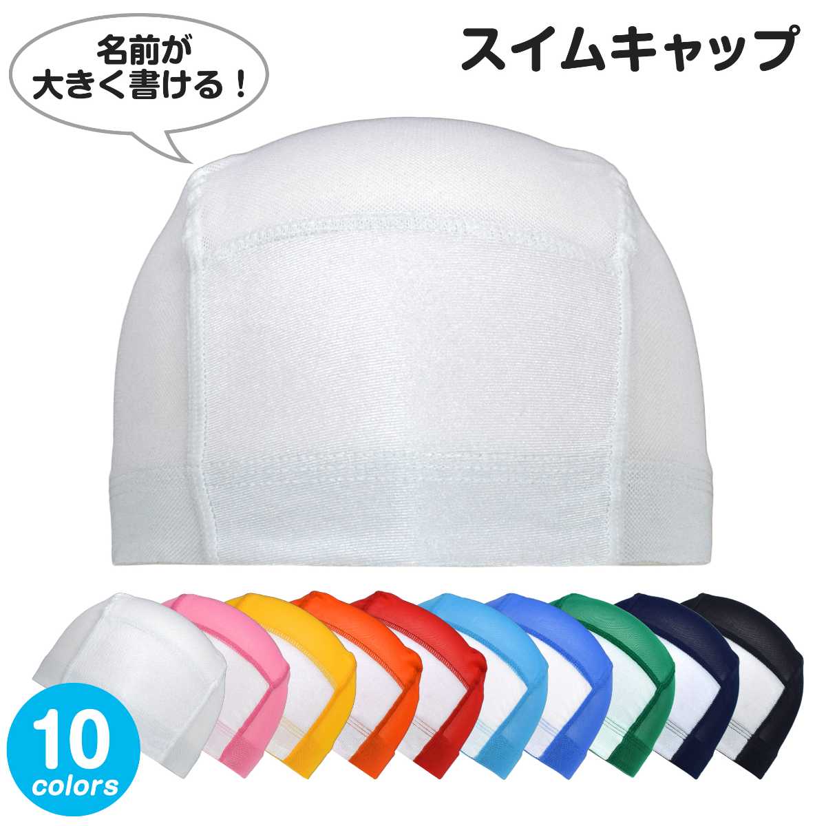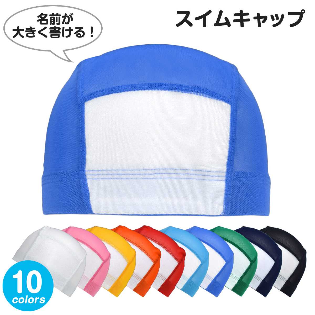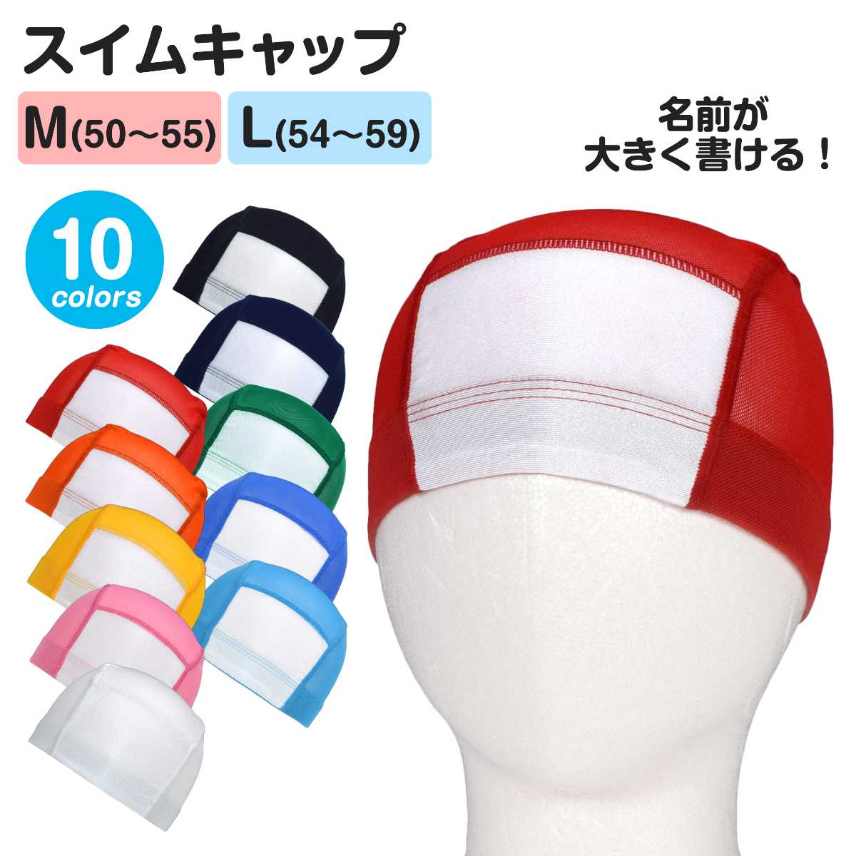 ☆ 商 品 説 明 ☆ 男の子 女の子 兼用 名前の書ける ネーム付き メッシュ 無地 スイムキャップ。 豊富なカラーでお手持ちの水着とも合わせやすいシンプルな水泳帽です。 学校 スイミングスクール プール スポーツセンター には必需品のアイテム。 前面の白地部分にはお名前や学年、クラスなどが大きく書けてとっても便利。 通気性抜群のメッシュ素材で、頭が蒸れにくい快適な着用感。洗濯してもすぐに乾きます。 被り口は平ゴム仕様で伸縮性があり被りやすい。 Lサイズは大人の方も被れるサイズです。 内側にもお名前が書けるネームタグ付き。