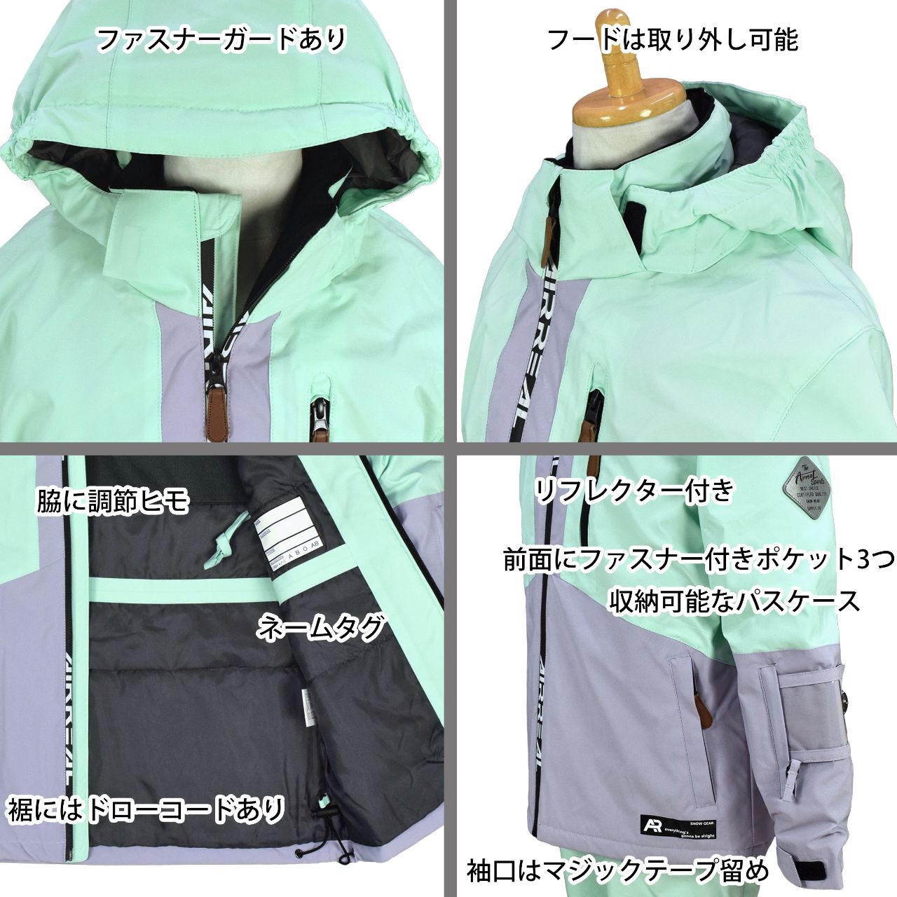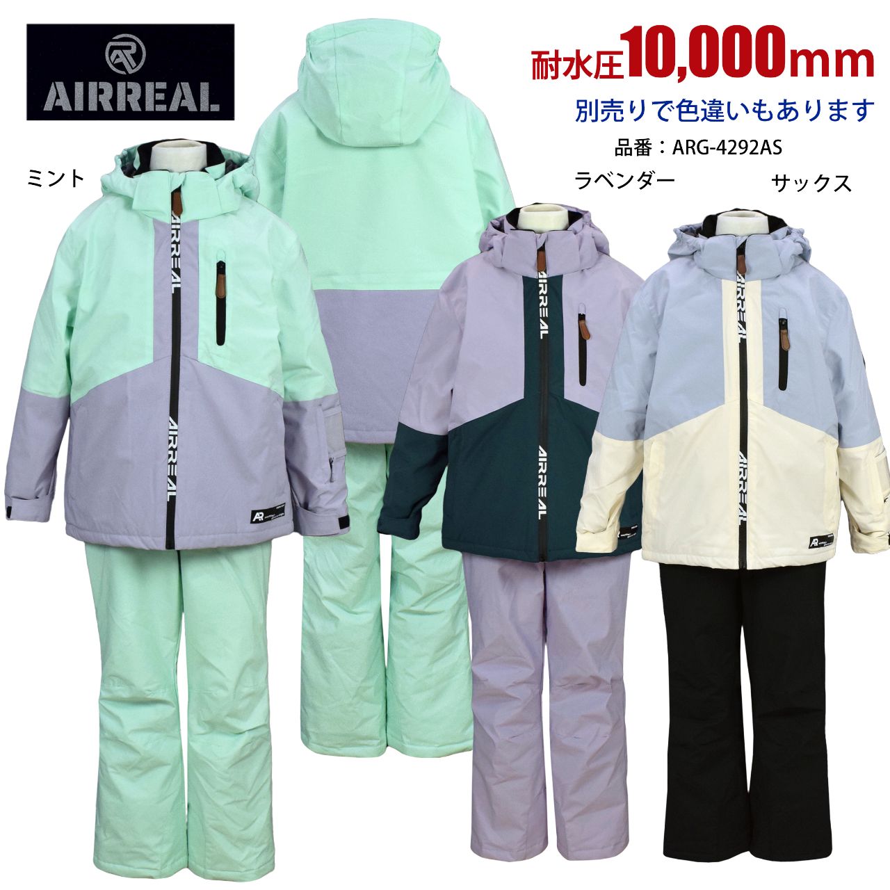 ☆ 商 品 説 明 ☆ AIRREAL エアリアル 耐水圧10000mm サイズ調整可能 スキーウェア 上下セット 。 配色切替 前立てのロゴが かっこいい スノーウエア 上下 セットアップ です 。 【ジャケット】 襟裏・背あては発熱素材で温か。袖口は一部ゴム、マジックテープ留め。ファスナーガード あり。フード は取り外し可能(マジックテープ)。前面にファスナー付きポケットが3つ。左側に内ポケット1つ。リフレクターワッペン付き、収納可能な パスケース つき(左袖)。裾はドローコード。ネームタグあり。 【パンツ】 サスペンダー は取り外し可能(マジックテープ)。ウェストは一部ゴム・サイドマジックテープ。サイドファスナーを開くと広がりゆったり履ける ウエストフレックス仕様。フロントはスナップボタン・ファスナー。ファスナー付きポケット2つ。スノーガード あり、エッジカード あり。