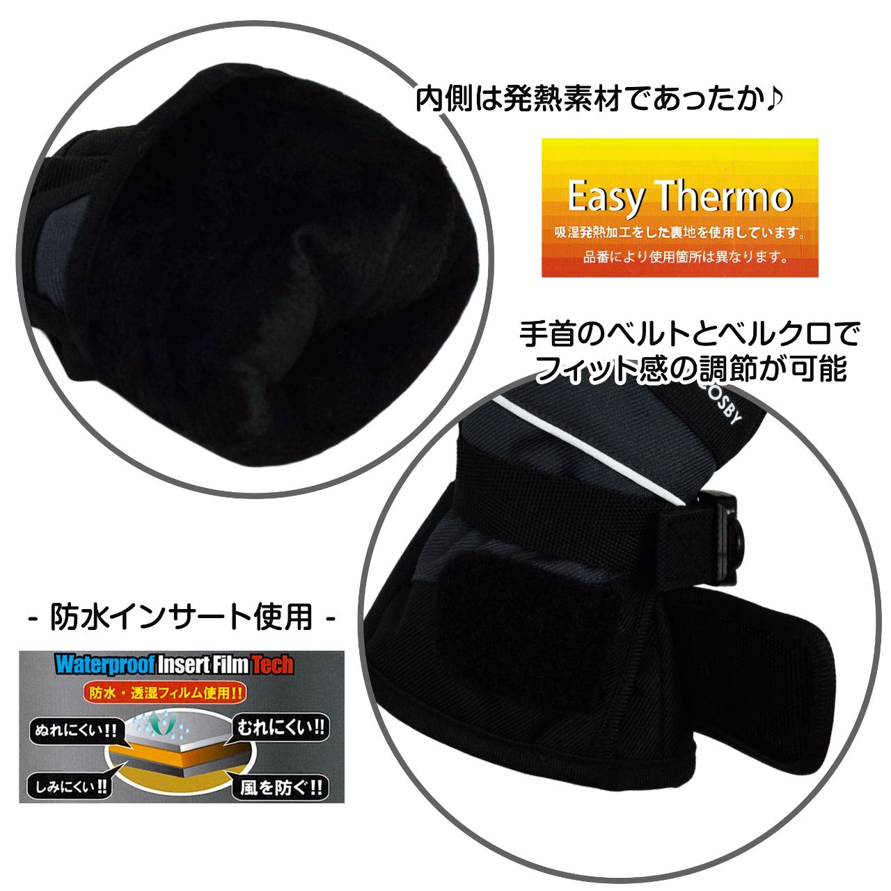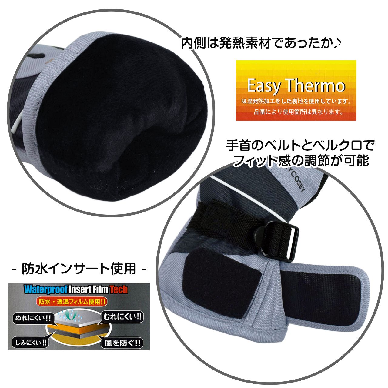 ☆ 商 品 説 明 ☆ cosby コスビー Easy Thermo スキー グローブ 。 防水インサート使用で濡れ、蒸れ、冷たい風をガード。肌に当たる裏地は発熱素材 Easy Thermo イージーサーモ使用で暖か。手首ベルト、マジックテープタブ付き。マジックテープタブにはロゴ入りのリフレクター付き。手首内側ゴム入り。手の平全面 合成皮革。ジョイントフック付き。