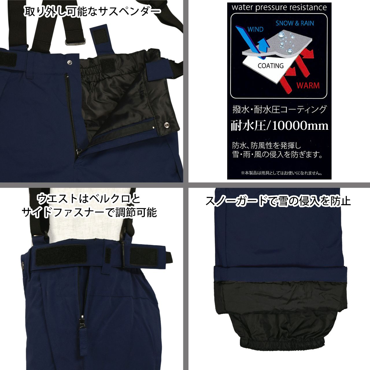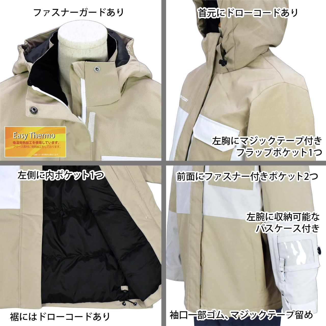 ☆ 商 品 説 明 ☆ cosby コスビー 耐水圧10000mm レディース スキーウェア 上下セット 。 切替配色と胸元のロゴプリントがおしゃれな スノーウエア 上下 セットアップ です 。 【ジャケット】 襟裏は発熱素材で温か。撥水コーティングにより 防水・防風性を発揮し雪、雨、風の侵入を防ぎます。袖口は一部ゴム、マジックテープ留め。ファスナーガード あり。フード は取り外し不可。前面にファスナー付きポケットが2つ。胸部分にマジックテープ付きフラップポケット1つ。左側に内ポケット1つ。収納可能な パスケース つき(左袖)。裾はドローコード付き。 【パンツ】 サスペンダー は取り外し可能(マジックテープ)。ウェストは一部ゴム・サイドマジックテープ。ウエストは サイドファスナー を開くと広がりゆったり履ける ウエストフレックス仕様。フロントはスナップボタン・ファスナー。ファスナー付きポケット2つ。スノーガード あり。