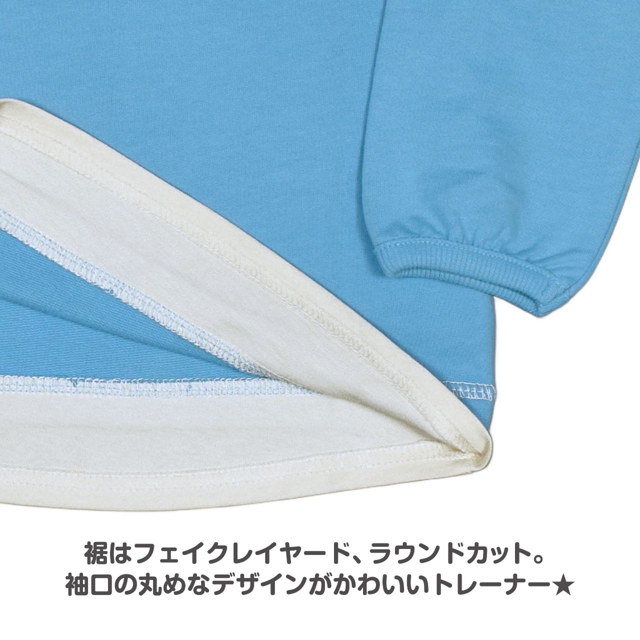 袖口の丸めなデザインが かわいい トレーナーです。裾はフェイクレイヤード、ラウンドカット。