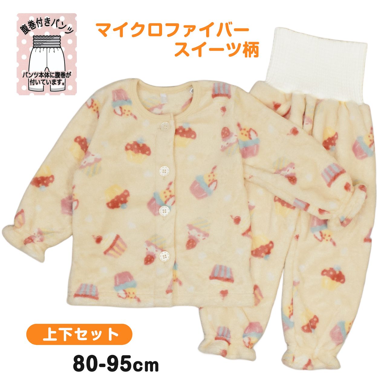 ☆ 商 品 説 明 ☆ マイクロファイバー スイーツプリント 腹巻き付き 長袖パジャマ 。 かわいいケーキやアイスクリームのスイーツプリント入りパジャマ です。マイクロファイバーのふわふわで柔らかな着心地が気持ち良いパジャマです。軽くて暖かなのでルームウェアにもおすすめです。前立てはボタン留め。袖口とパンツの足首部分は軽くゴムが入った キュートなデザイン。パンツは腹巻き付きで冷えからおなかをしっかり守ります。お尻はマチ付きでゆったりした履き心地。パンツのみお名前タグあり。