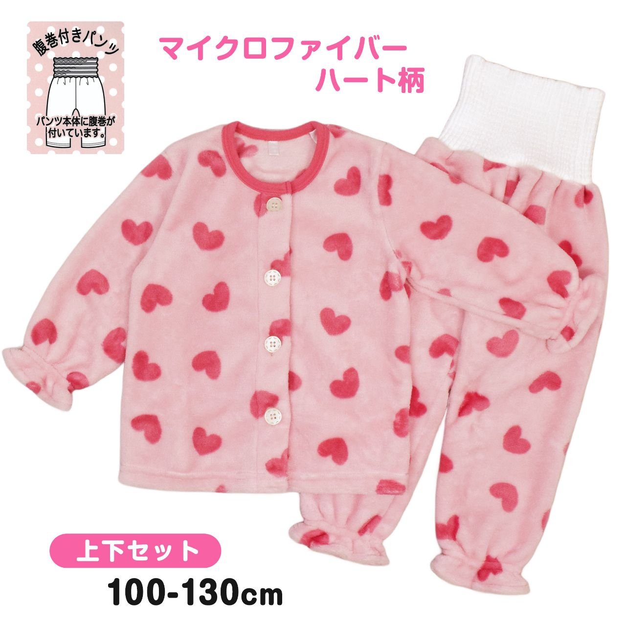 ☆ 商 品 説 明 ☆ マイクロファイバー ハートプリント 腹巻き付き 長袖パジャマ 。 ころんとしたハートプリントが可愛いパジャマです。マイクロファイバーのふわふわで柔らかな着心地が気持ち良いパジャマです。軽くて暖かなのでルームウェアにもおすすめです。前立てはボタン留め。袖口とパンツの足首部分は軽くゴムが入ったキュートなデザイン。パンツは腹巻き付きで冷えからおなかをしっかり守ります。パンツのみお名前タグあり。