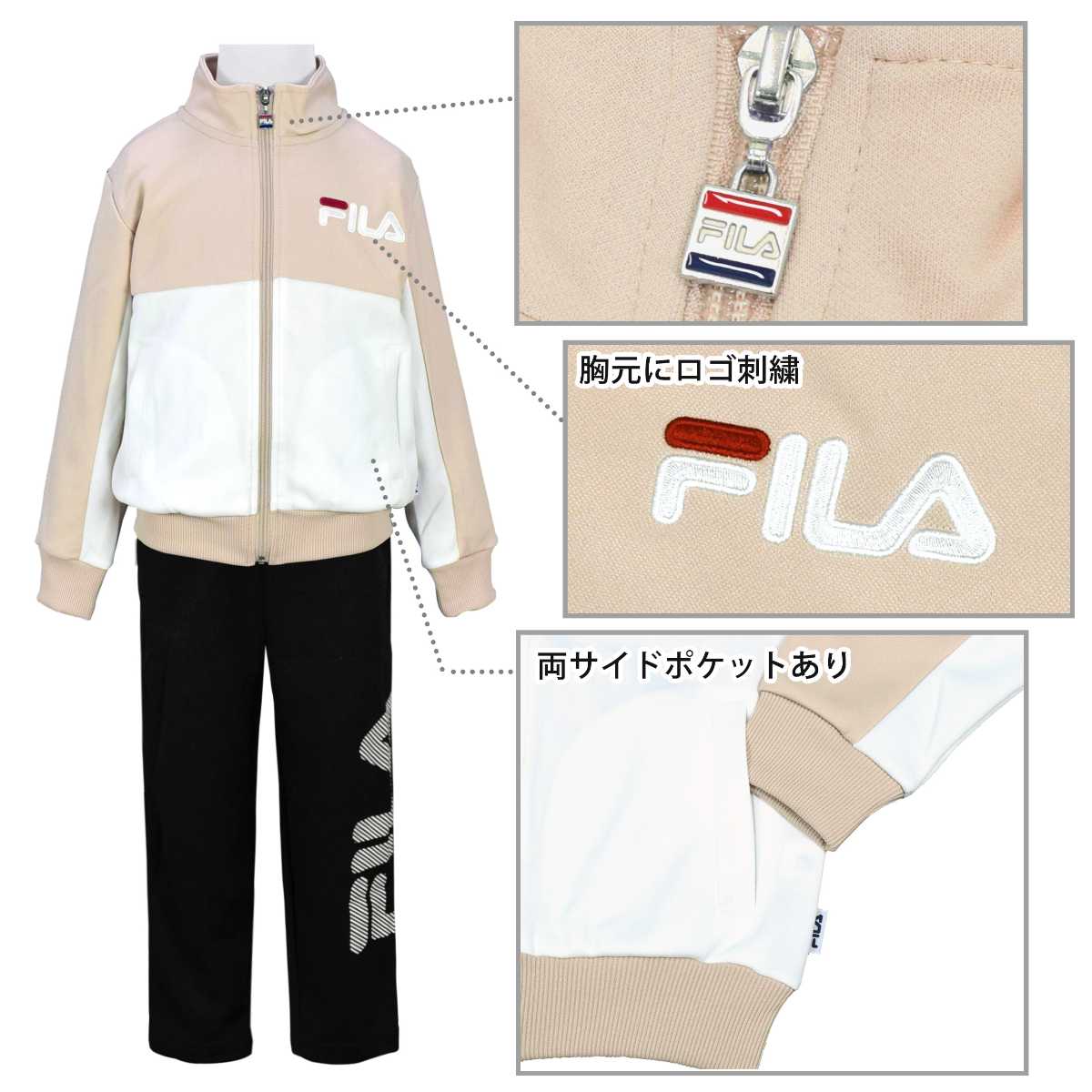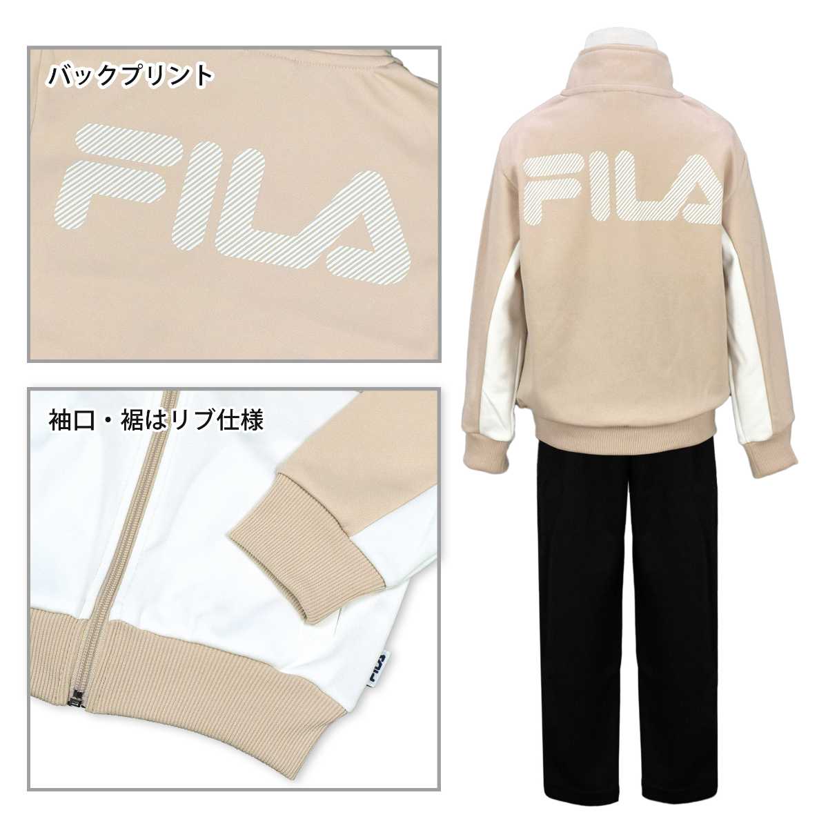 ☆ 商 品 説 明 ☆ FILA フィラ トレーニングウェア 上下 。 切替配色に、ロゴ刺繍、バックプリントも 可愛い シンプル なジャージです。パンツ はロゴプリント入り。ウエストはゴム、ひも付き。トップス、ボトムスに各2つポケットあり。