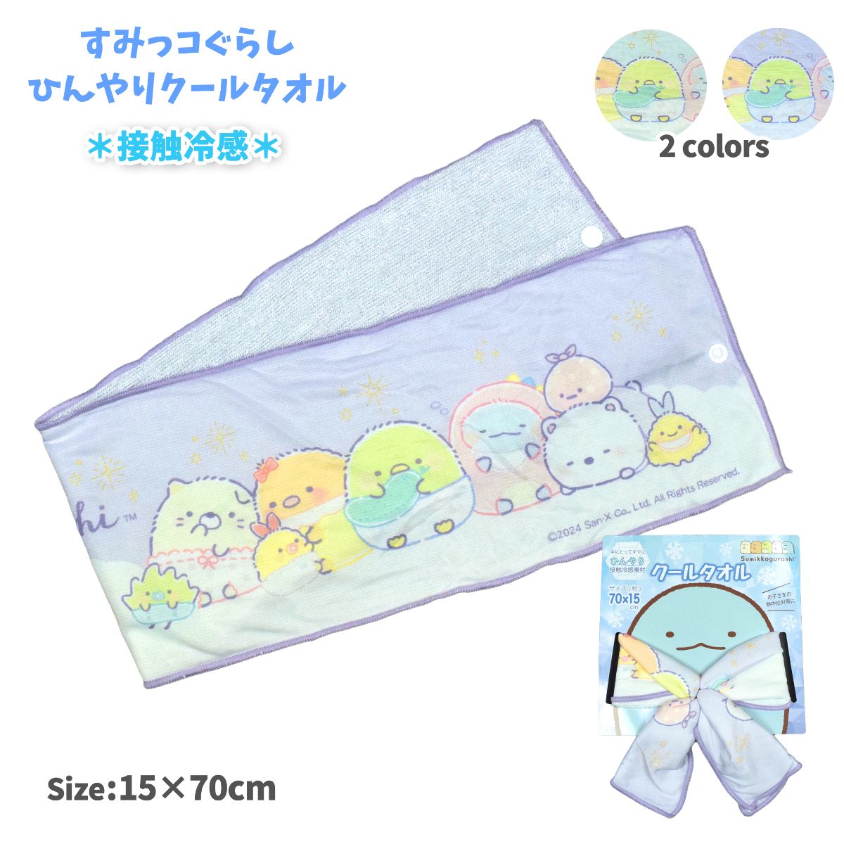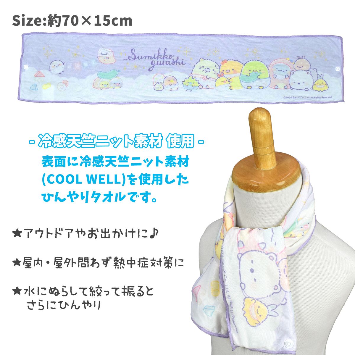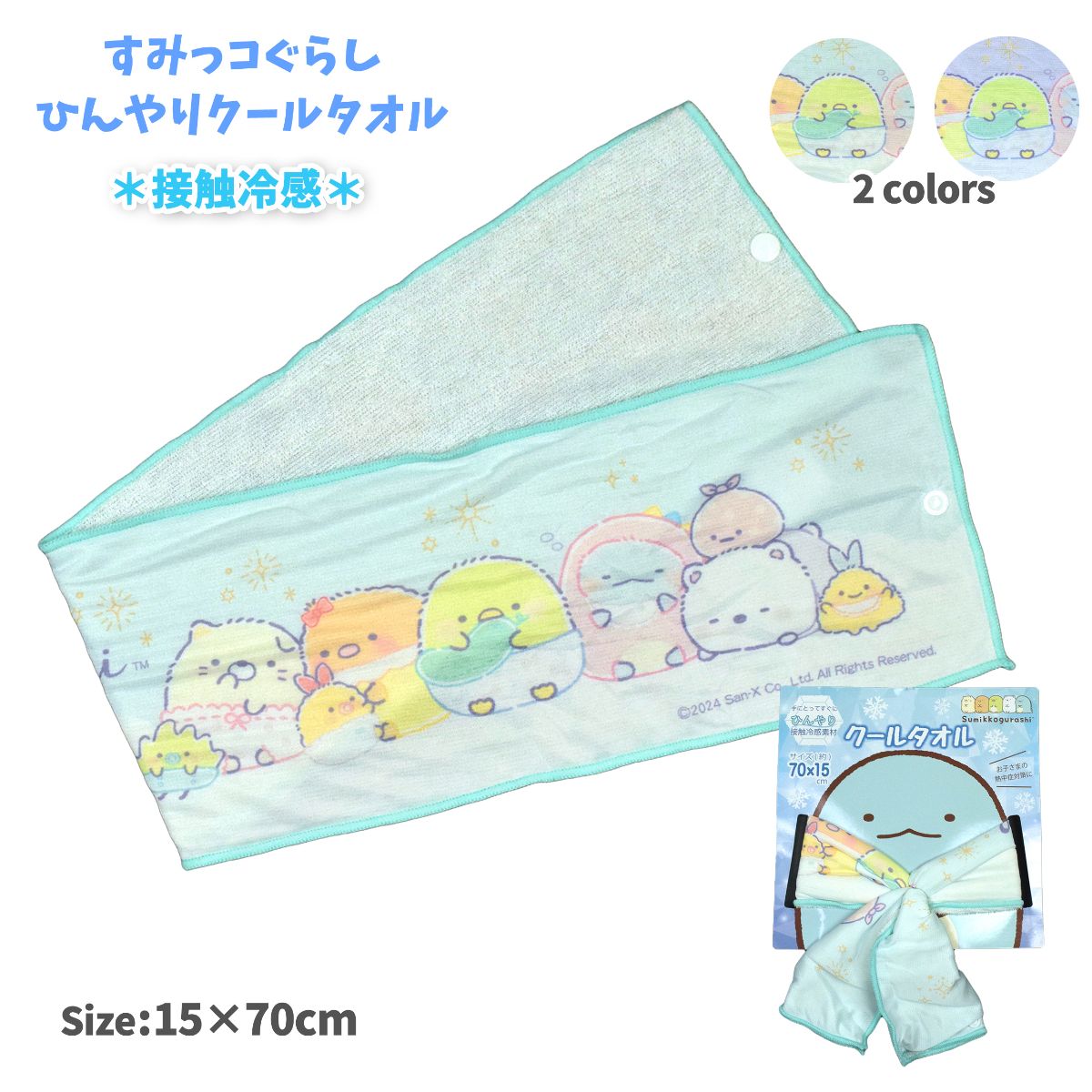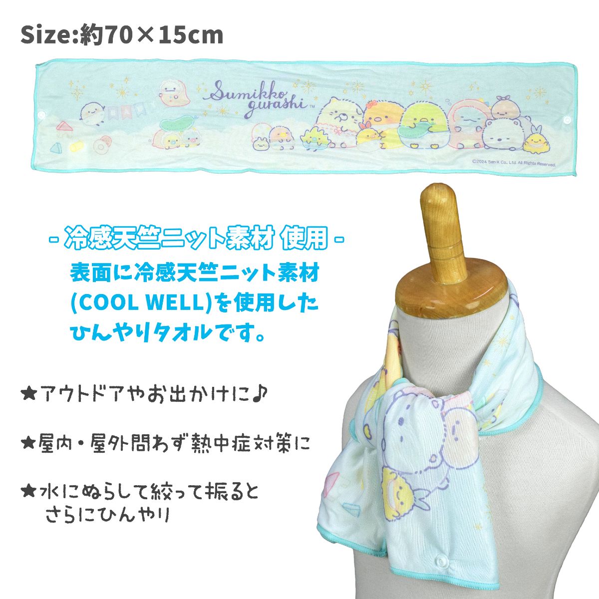 ☆ 商 品 説 明 ☆ すみっコぐらし ひんやり 接触冷感素材 クールロングタオルです。 しろくま とんかつ ねこ ぺんぎん とかげ みにっコなどが勢ぞろい。すみっコたちが かわいい クールタオル。表面は接触冷感の 冷感天竺ニット素材。裏面は吸汗速乾のシンカーパイル素材なのでタオルとしても使用できます。熱中症 暑さ対策におすすめです。スナップボタンを留めてご使用いただくことで 落としてしまう心配もありません。
