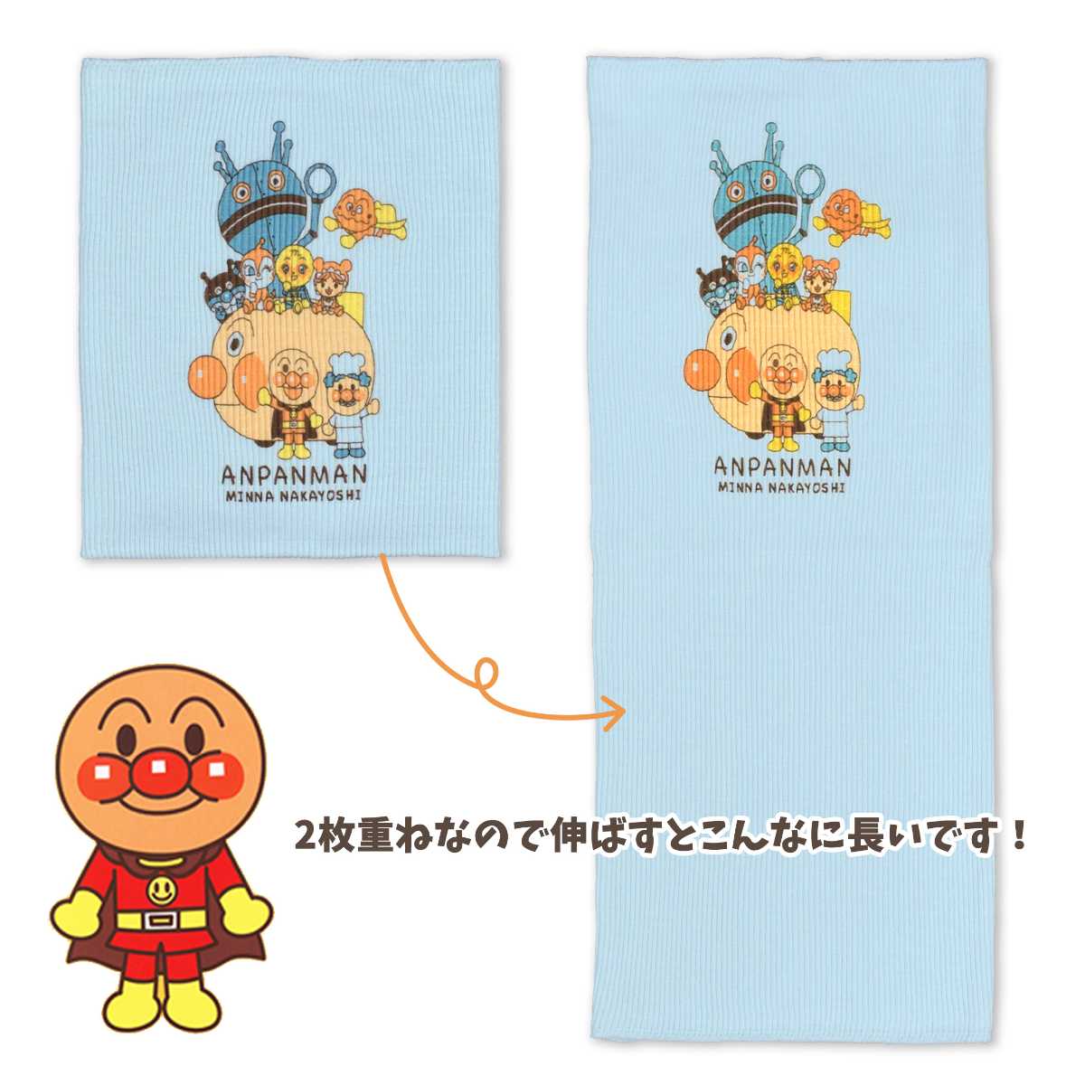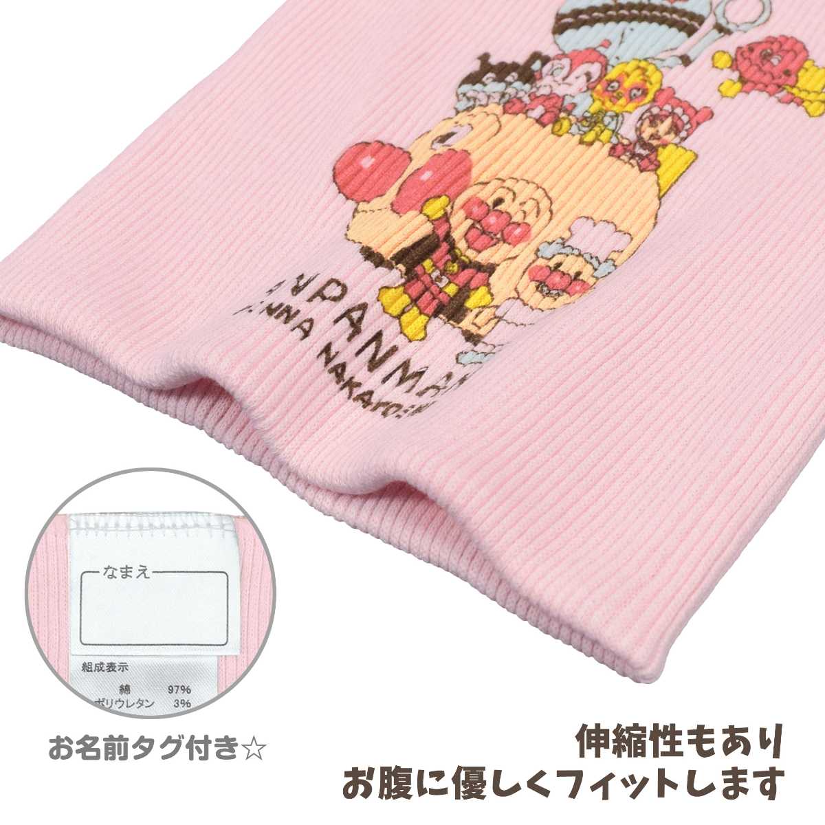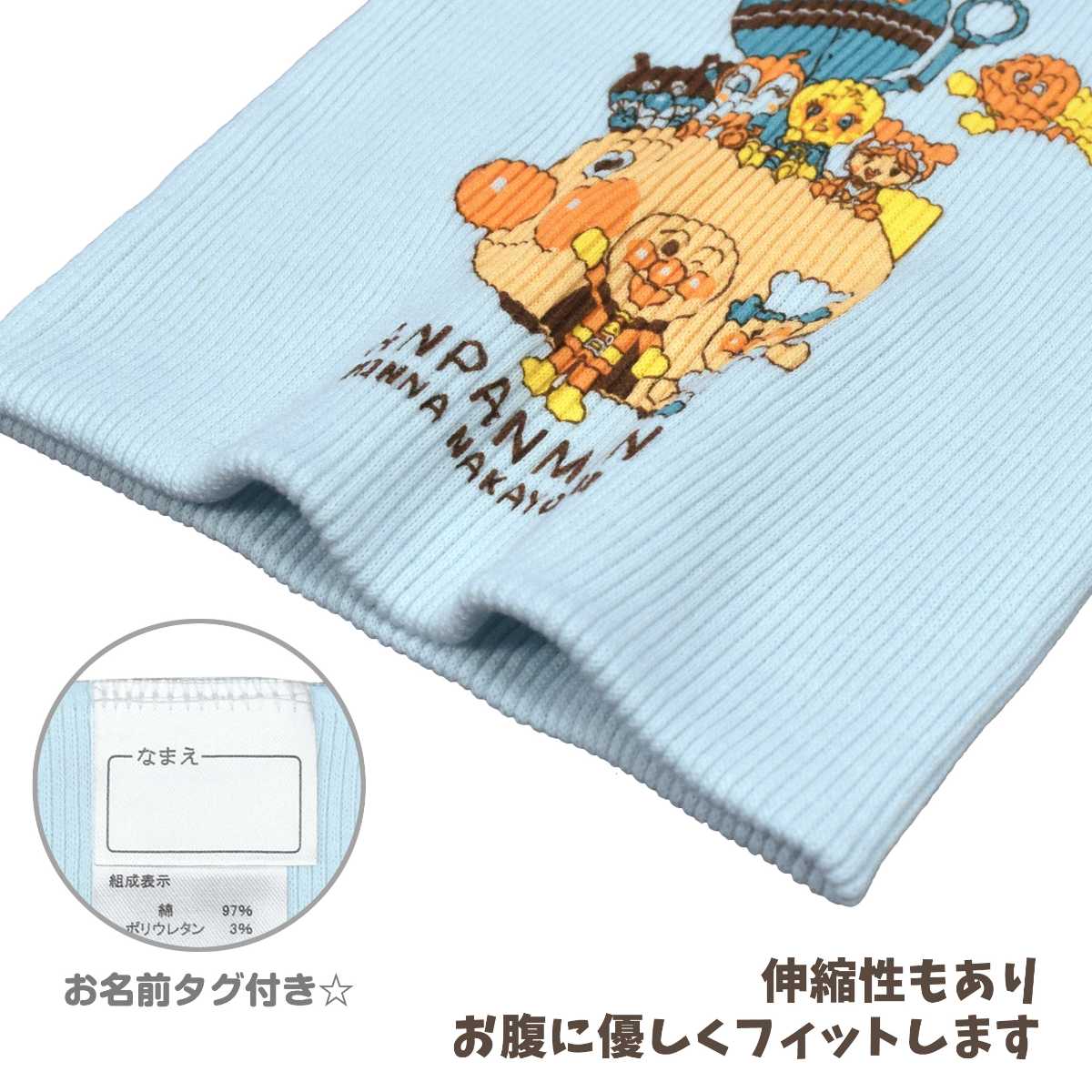 二重になっているのでとても暖か。柔らか で 伸縮性 もありお腹に優しくフィットします。アンパンマン ドキンちゃん ばいきんまん メロンパンナちゃん あかちゃんマン カレーパンマン ジャムおじさん だだんだん2号 アンパンマン号 かわいい プリント入り。