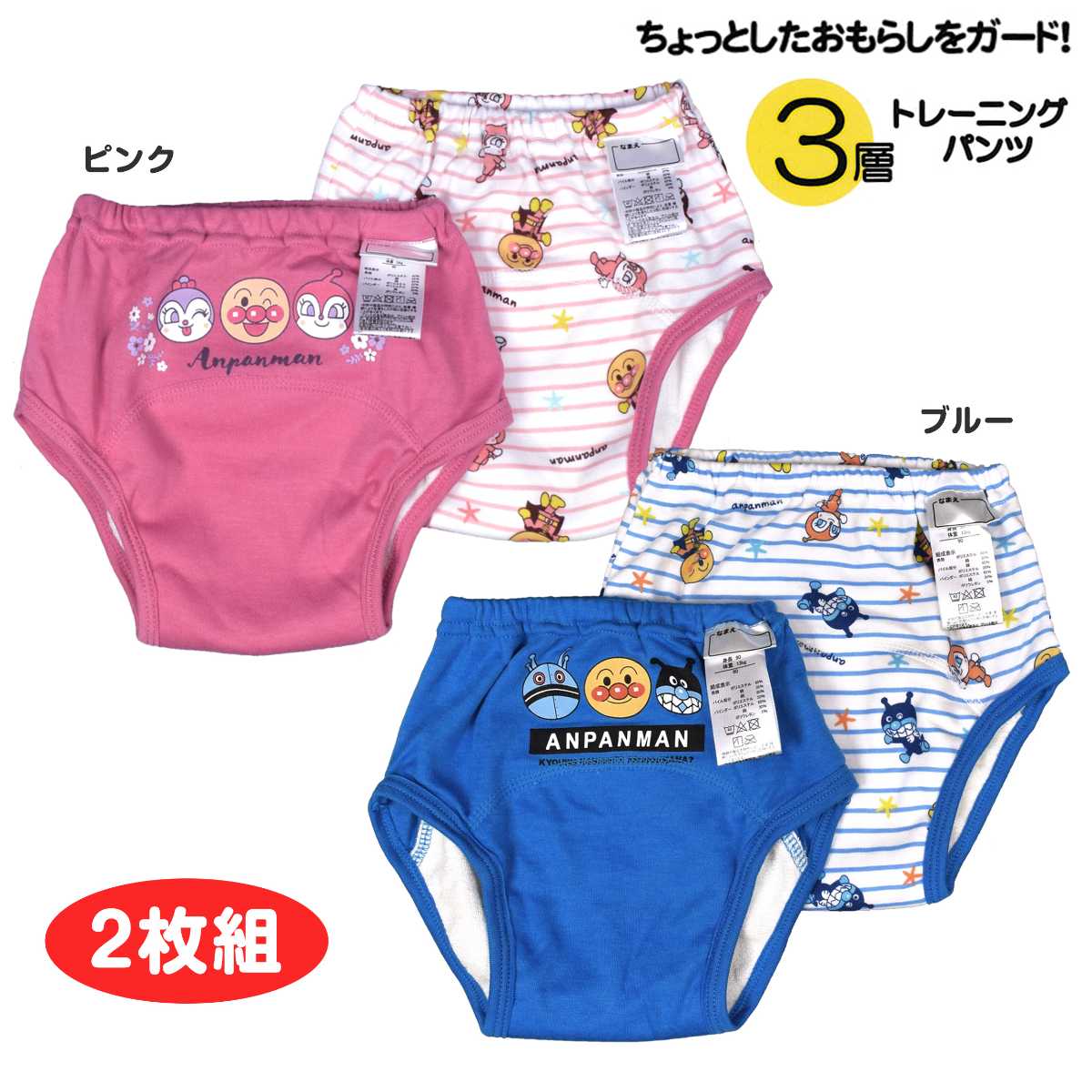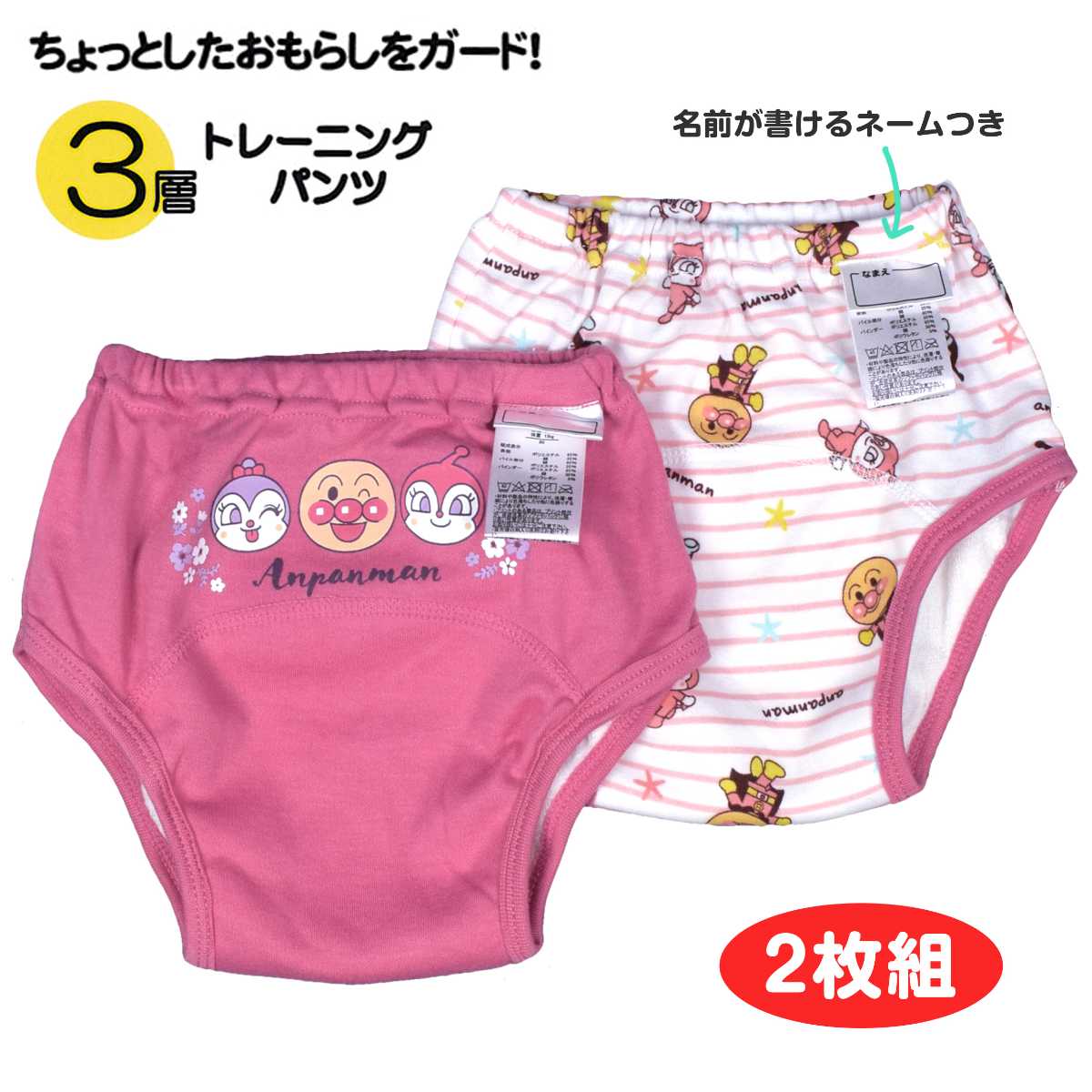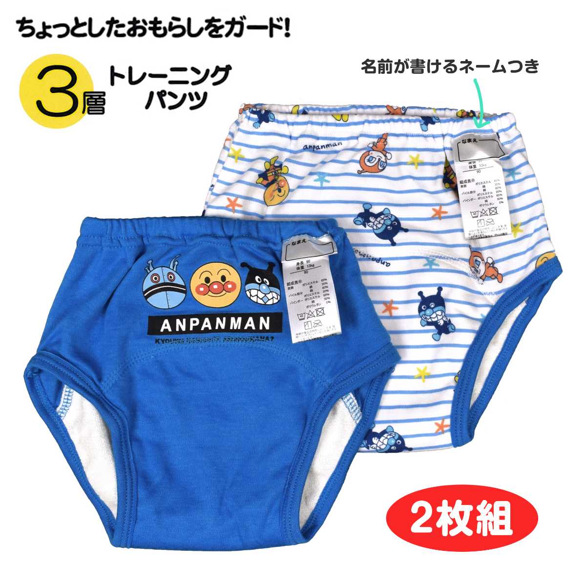 ☆ 商 品 説 明 ☆ アンパンマン 3層構造 柄違い トイレトレーニングパンツ 2枚セット 。 アンパンマン ばいきんまん だだんだん 2号 ドキンちゃん コキンちゃん が勢ぞろい。表生地スムース素材、中地 防水ラミネートフィルム、パイル素材の3層構造でちょっとしたお漏らしを吸収。乾きやすく軽い履き心地で動きやすい パンツ です。デザイン違いの 可愛い 2枚セット なので履き替え、 洗い替え にも便利です。ウエストゴム、ゴム取り換え口付き。お名前タグと洗濯表示はウエスト前部分に付いています。