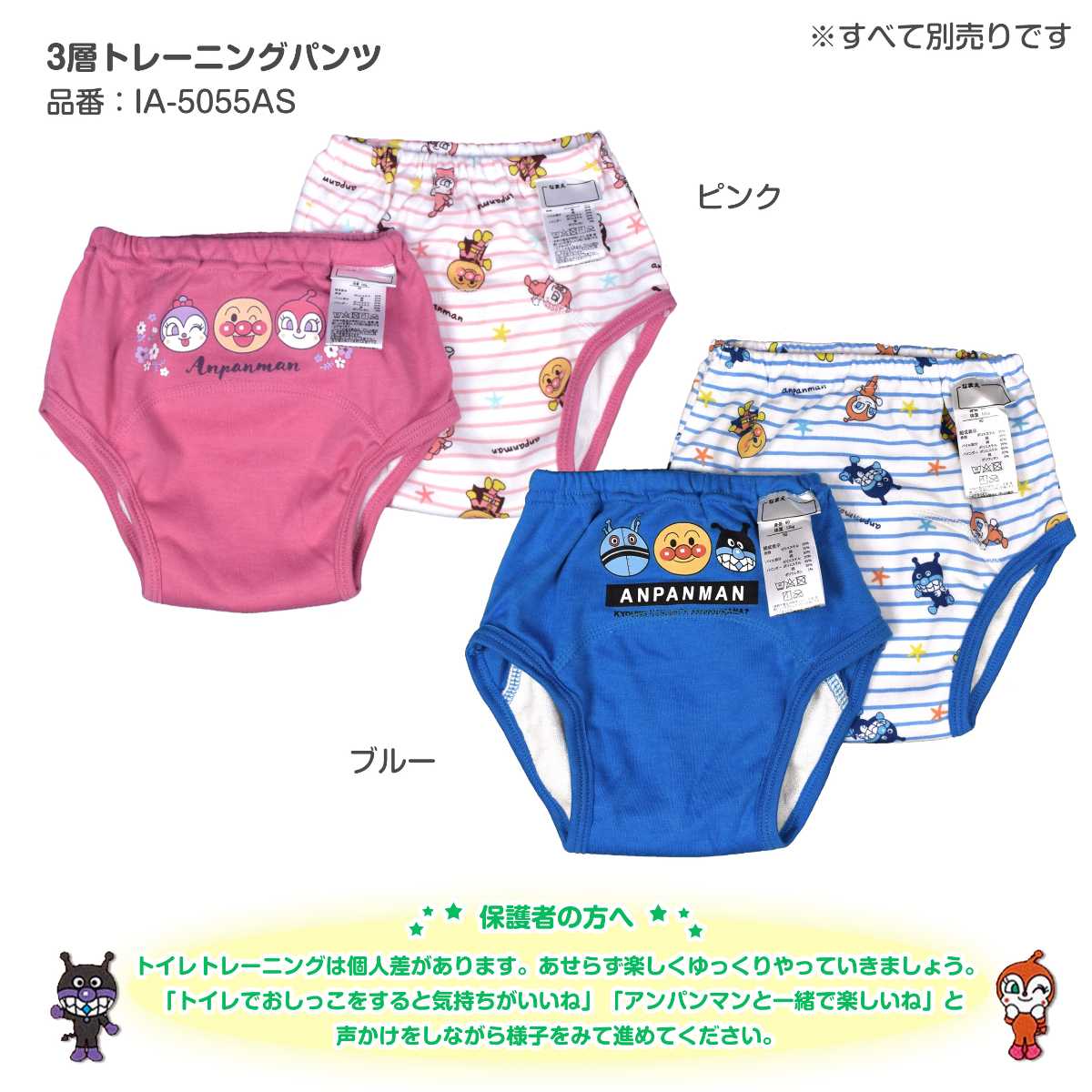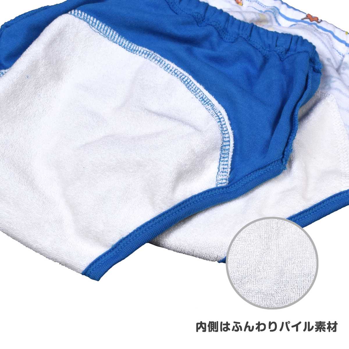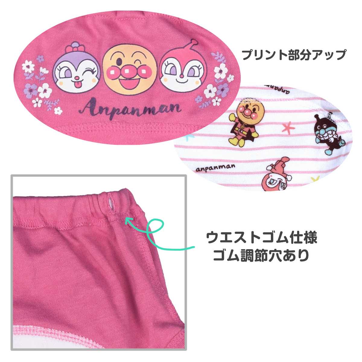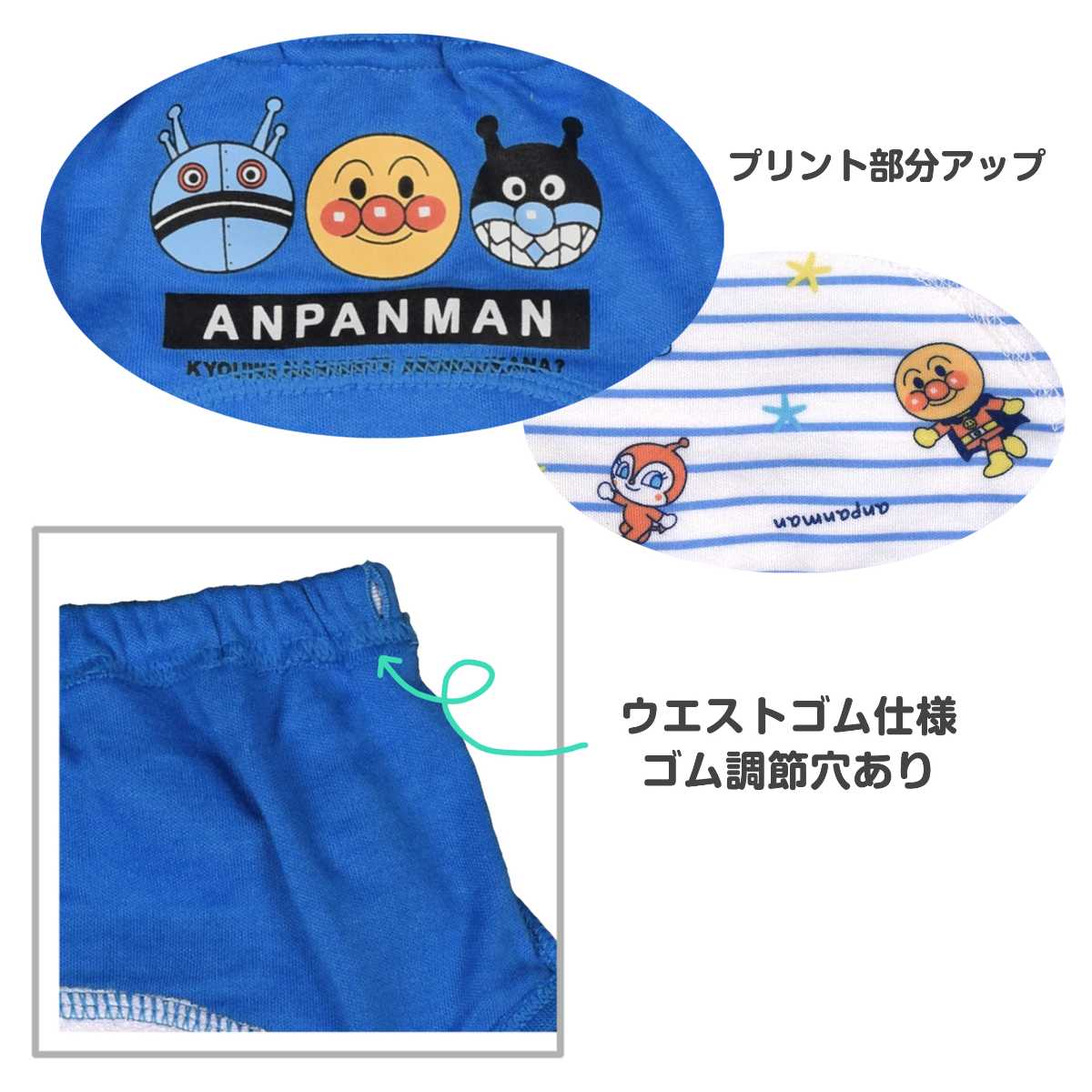 ☆ 商 品 説 明 ☆ アンパンマン 3層構造 柄違い トイレトレーニングパンツ 2枚セット 。 アンパンマン ばいきんまん だだんだん 2号 ドキンちゃん コキンちゃん が勢ぞろい。表生地スムース素材、中地 防水ラミネートフィルム、パイル素材の3層構造でちょっとしたお漏らしを吸収。乾きやすく軽い履き心地で動きやすい パンツ です。デザイン違いの 可愛い 2枚セット なので履き替え、 洗い替え にも便利です。ウエストゴム、ゴム取り換え口付き。お名前タグと洗濯表示はウエスト前部分に付いています。