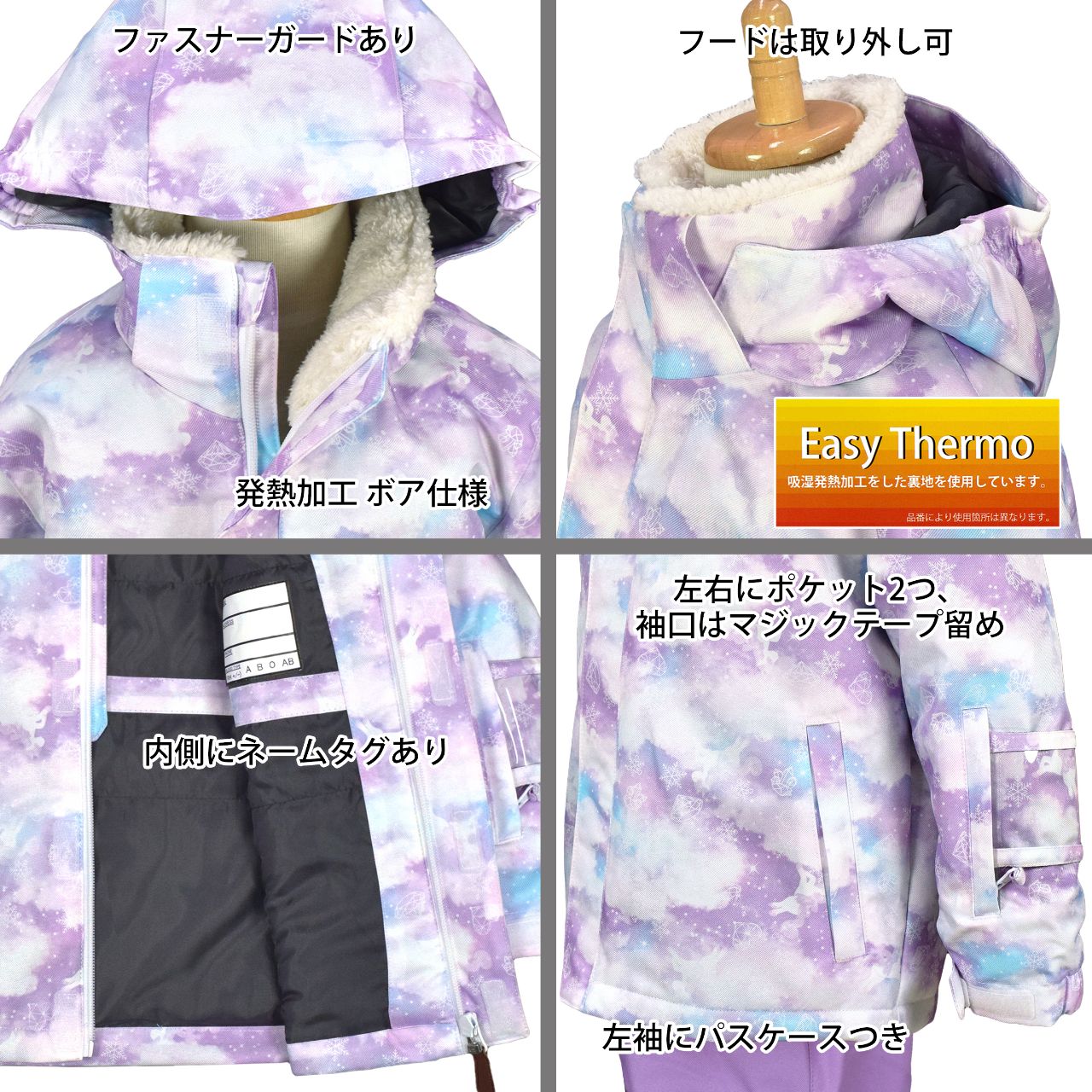 ☆ 商 品 説 明 ☆ JOY RIDE ジョイライド スキーウェア上下セットです。 ユニコーン と雲のプリントが可愛い スキーウエア 上下 セットアップ です。耐水圧5000mm 撥水・耐水圧 コーティング仕様。 【ジャケット】 首回りは発熱加工ボア仕様で あったか 。袖口は一部ゴム、マジックテープ留め。ファスナーガード あり。フード は取り外し可能(マジックテープ)。前面に ポケット が2つ。パスケース あり(左袖)。ネームタグあり。サイズ調節不可。 【パンツ】 雪が入りにくいサロペットタイプ。サイズ調節可能。ウェストは後ろサイドゴム。フロントはファスナー。スノーガード あり。サイズ調節可能。