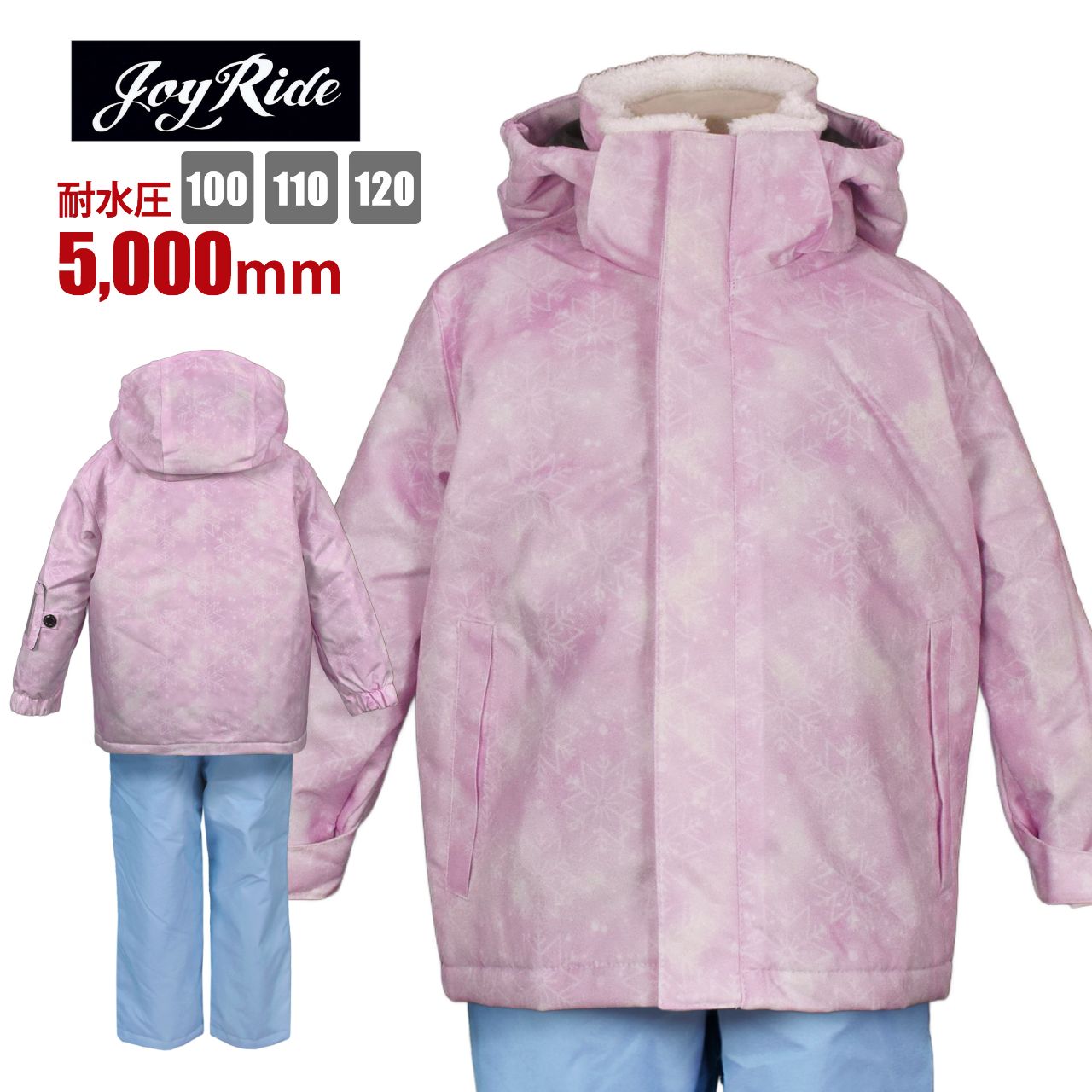 ☆ 商 品 説 明 ☆ JOY RIDE ジョイライド スキーウェア 上下セット。 雪の結晶柄が かわいい スキーウエア 上下 セットアップ です。耐水圧5000mm 撥水・耐水圧 コーティング仕様。 【ジャケット】 首回りは発熱加工ボア仕様で あったか 。袖口は一部ゴム、マジックテープ留め。ファスナーガード あり。フード は取り外し可能(マジックテープ)。前面に ポケット が2つ。パスケース あり(左袖)。ネームタグあり。サイズ調節不可。 【パンツ】 雪が入りにくいサロペットタイプ。サイズ調節可能。ウエストは後ろサイドゴム。フロントはファスナー。スノーガード あり。