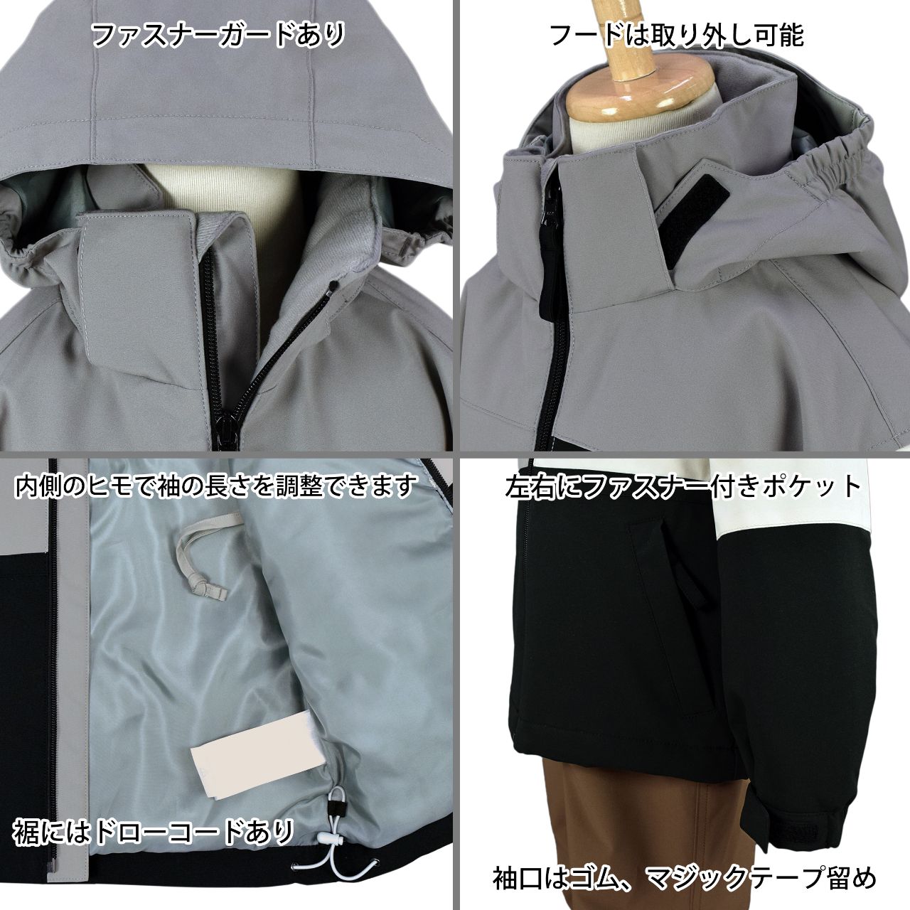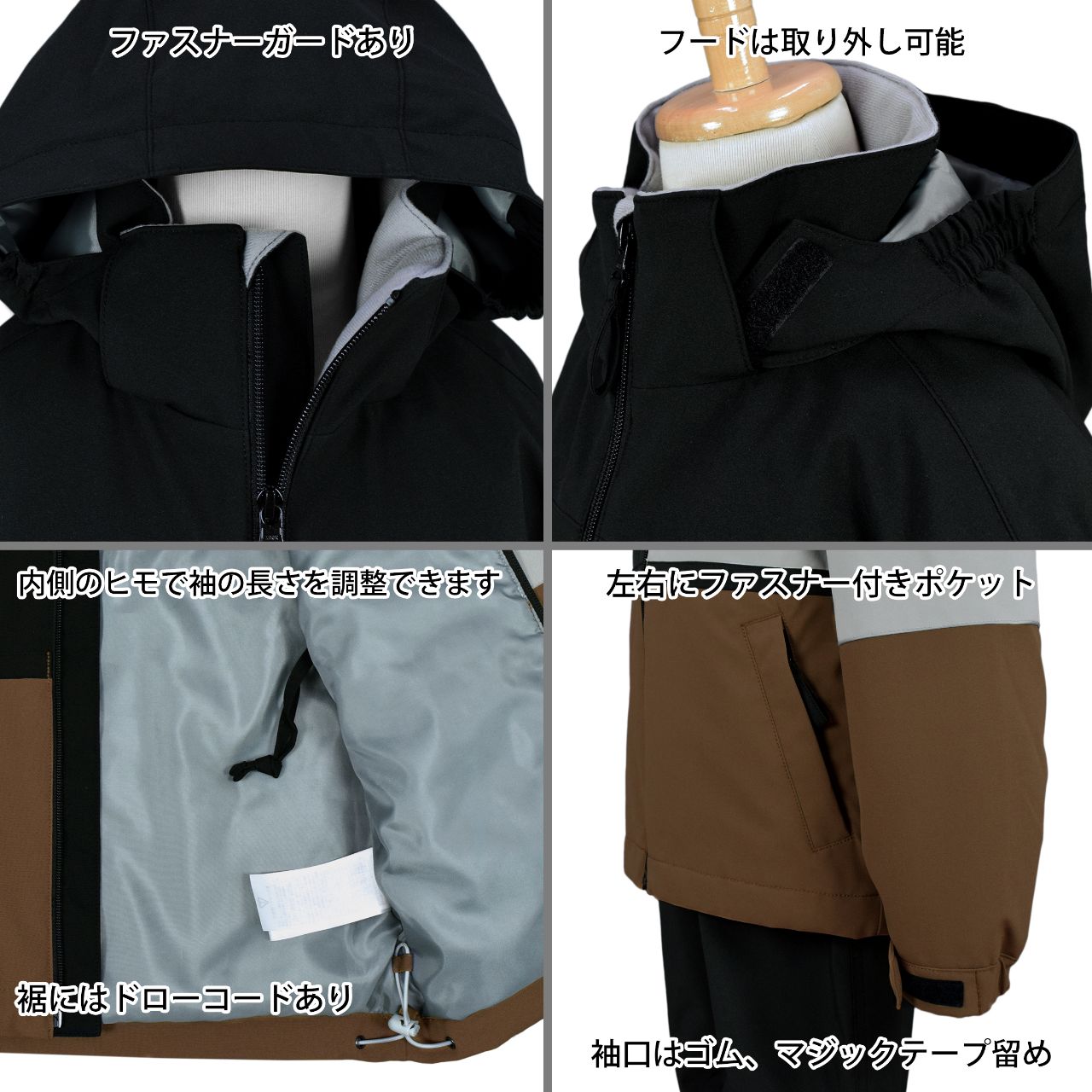 首まわりは裏トリコット起毛。袖口は一部ゴム、マジックテープ留め。ファスナーガード あり。フード は取り外し可能(マジックテープ)。前面にファスナー付き ポケット が2つ。裾はドローコード付き。襟元にネームタグ付き。