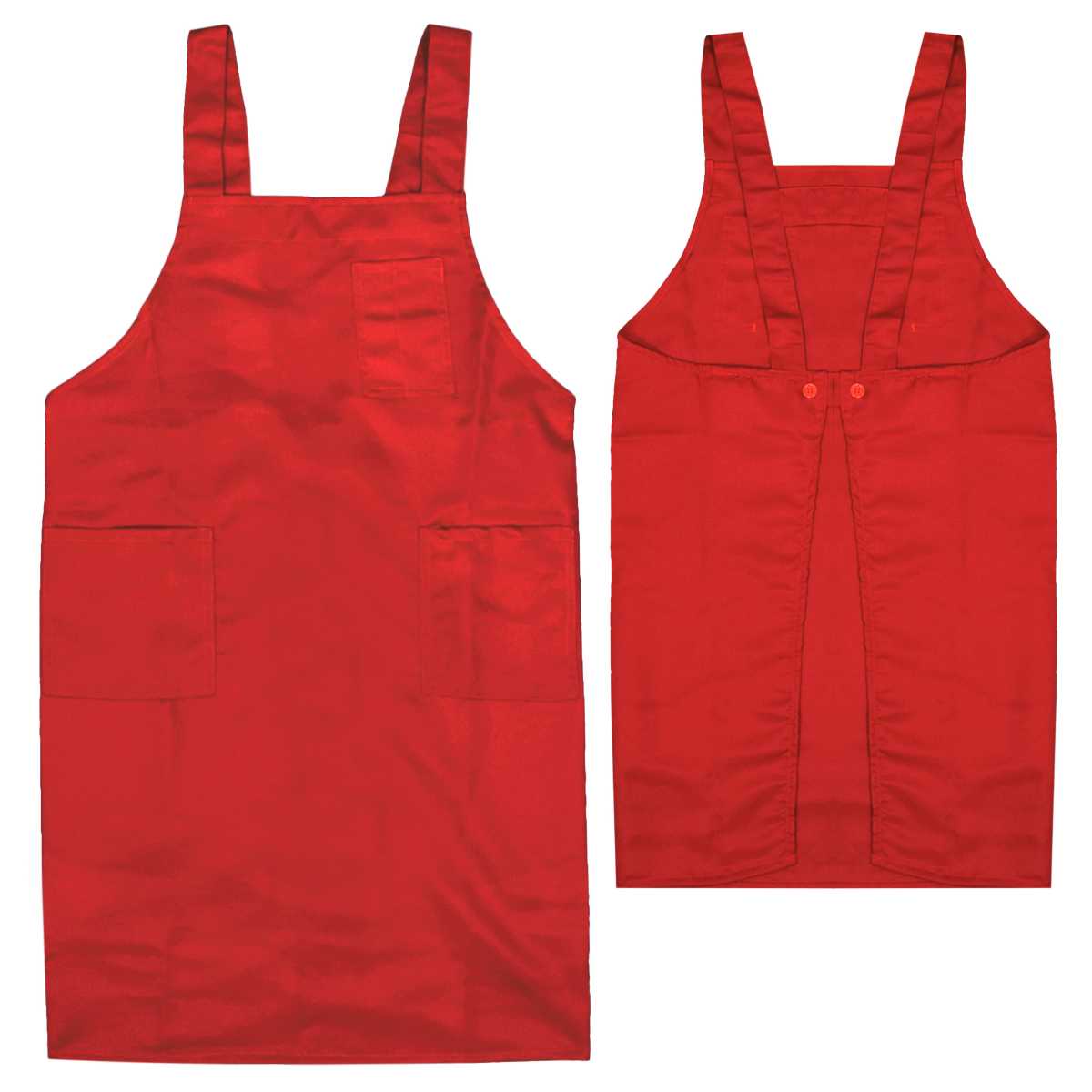 胸はペンがさせるポケット付き。ウエストは調節可能のボタン留め。肩ヒモは調節不可。