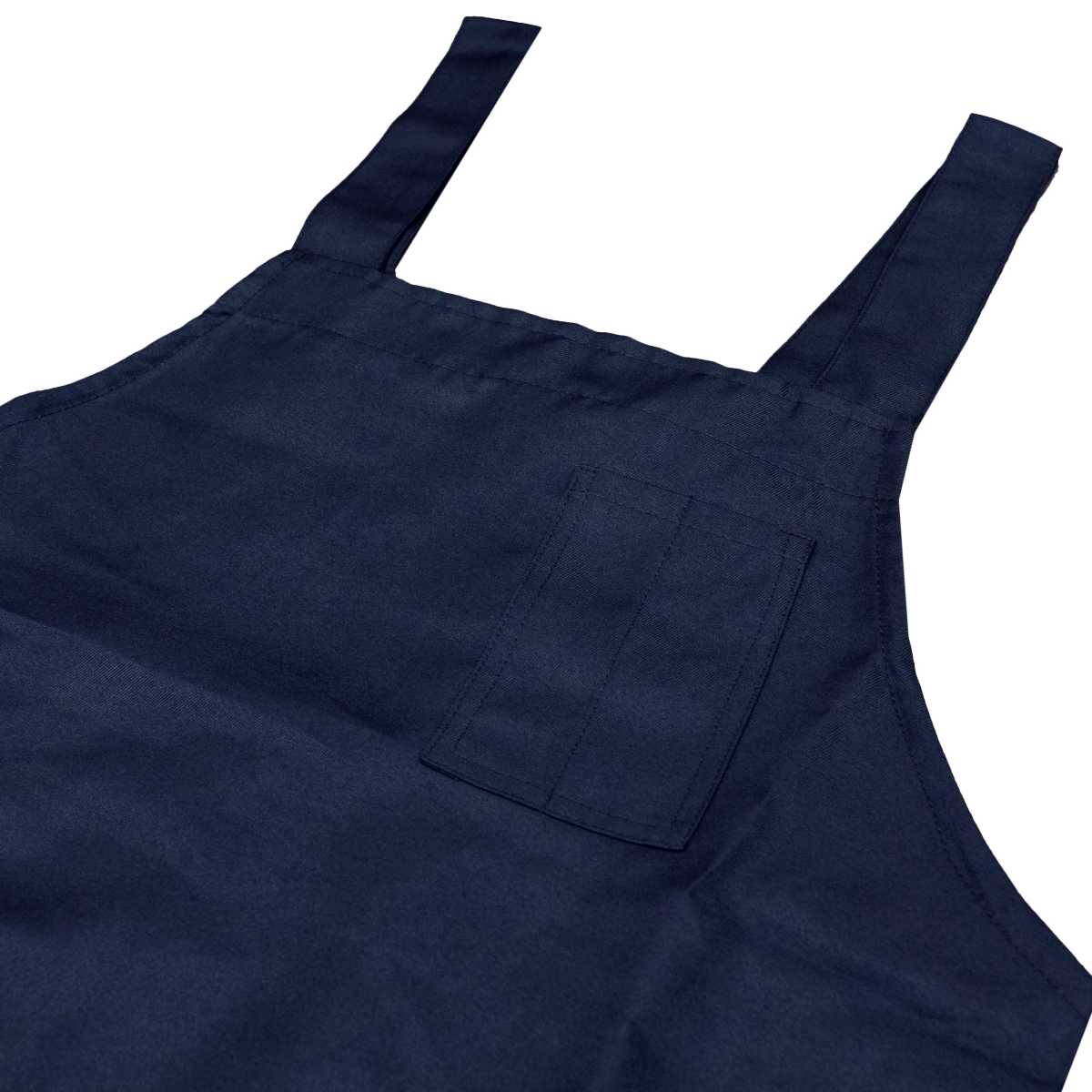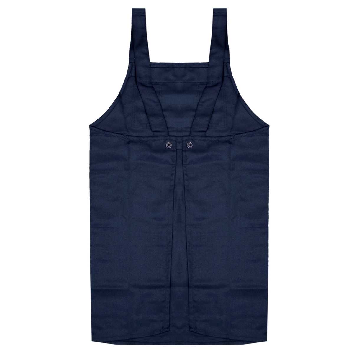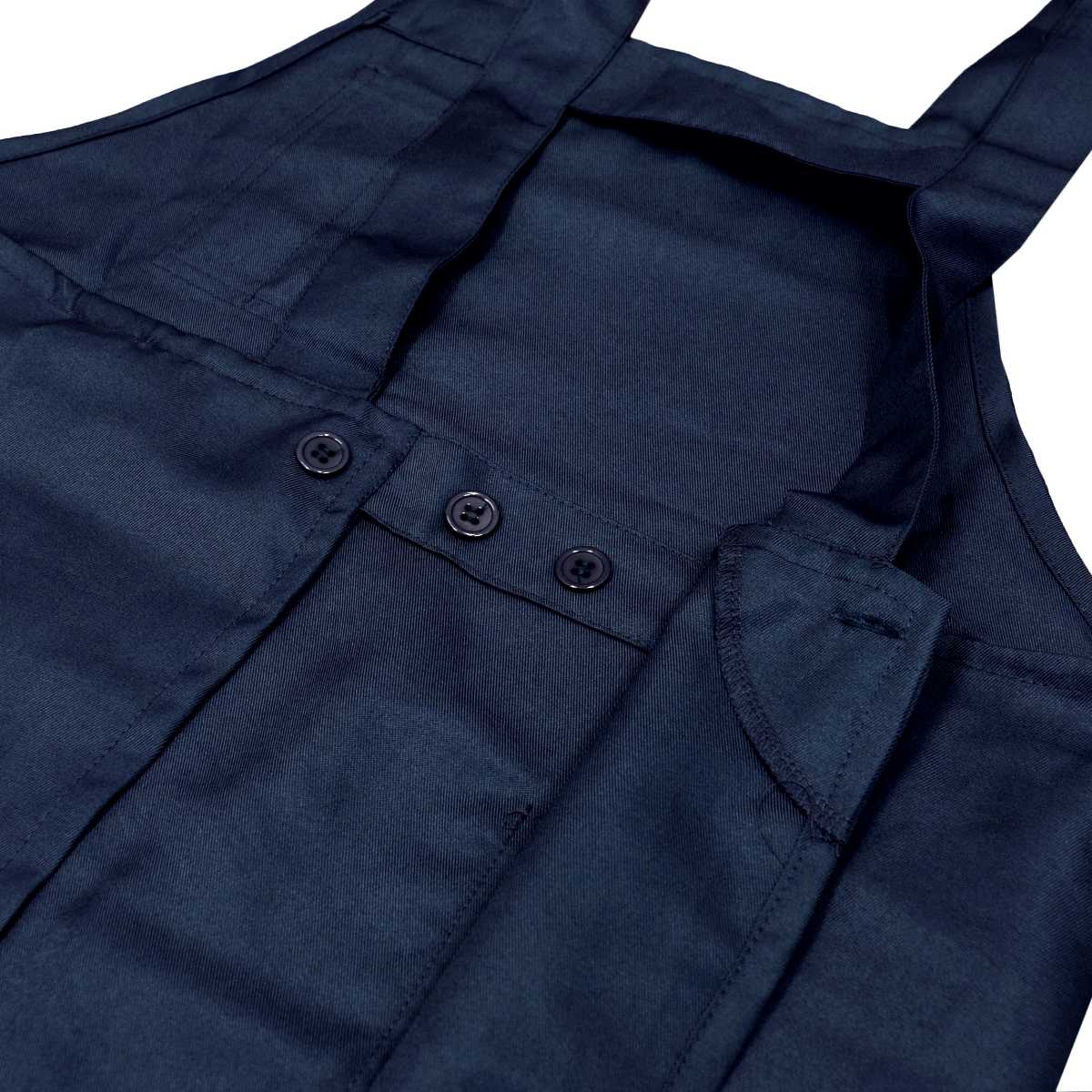 胸はペンがさせるポケット付き。ウエストは調節可能のボタン留め。肩ヒモは調節不可。