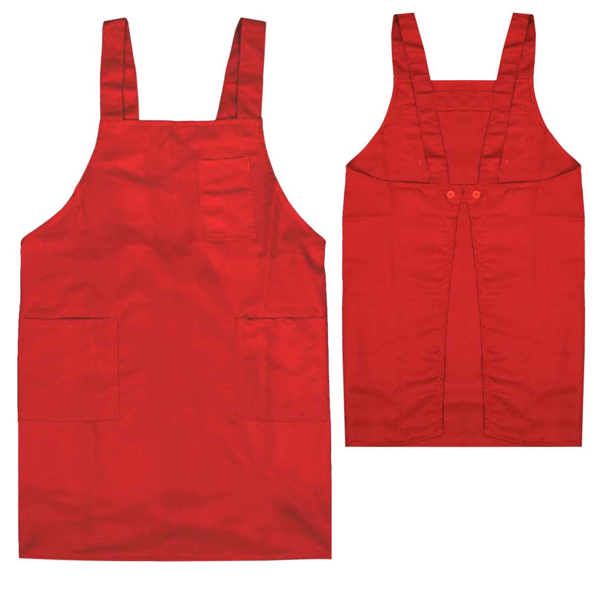 胸はペンがさせるポケット付き。ウエストは調節可能のボタン留め。肩ヒモは調節不可。