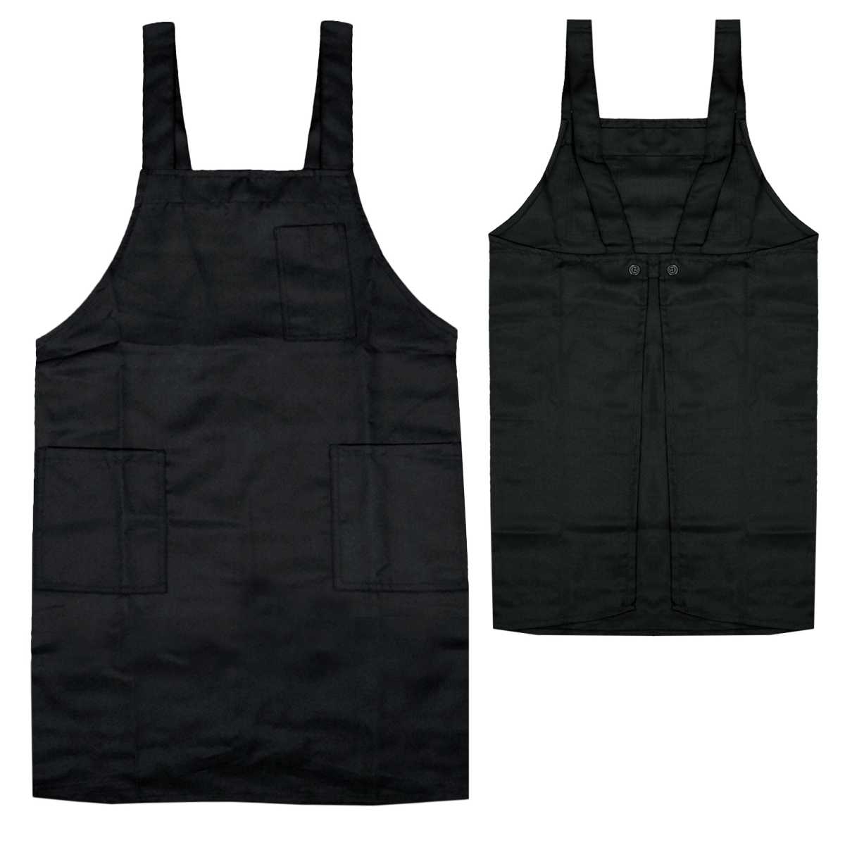 胸はペンがさせるポケット付き。ウエストは調節可能のボタン留め。肩ヒモは調節不可。