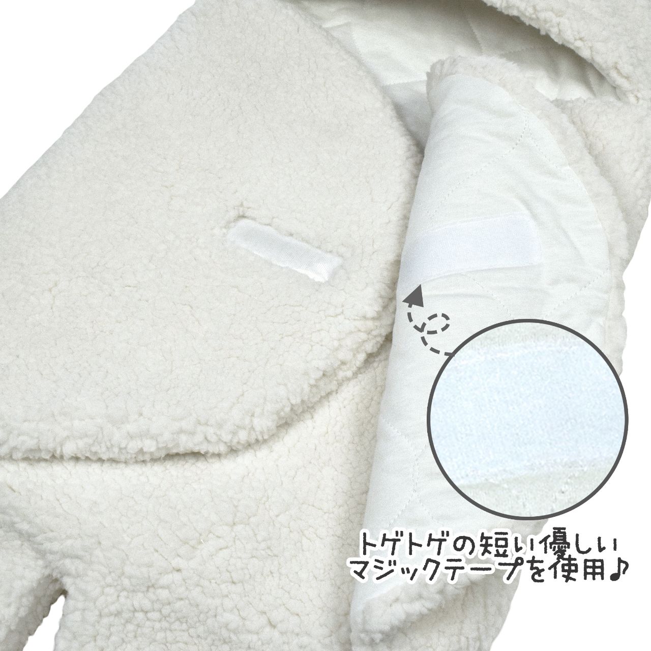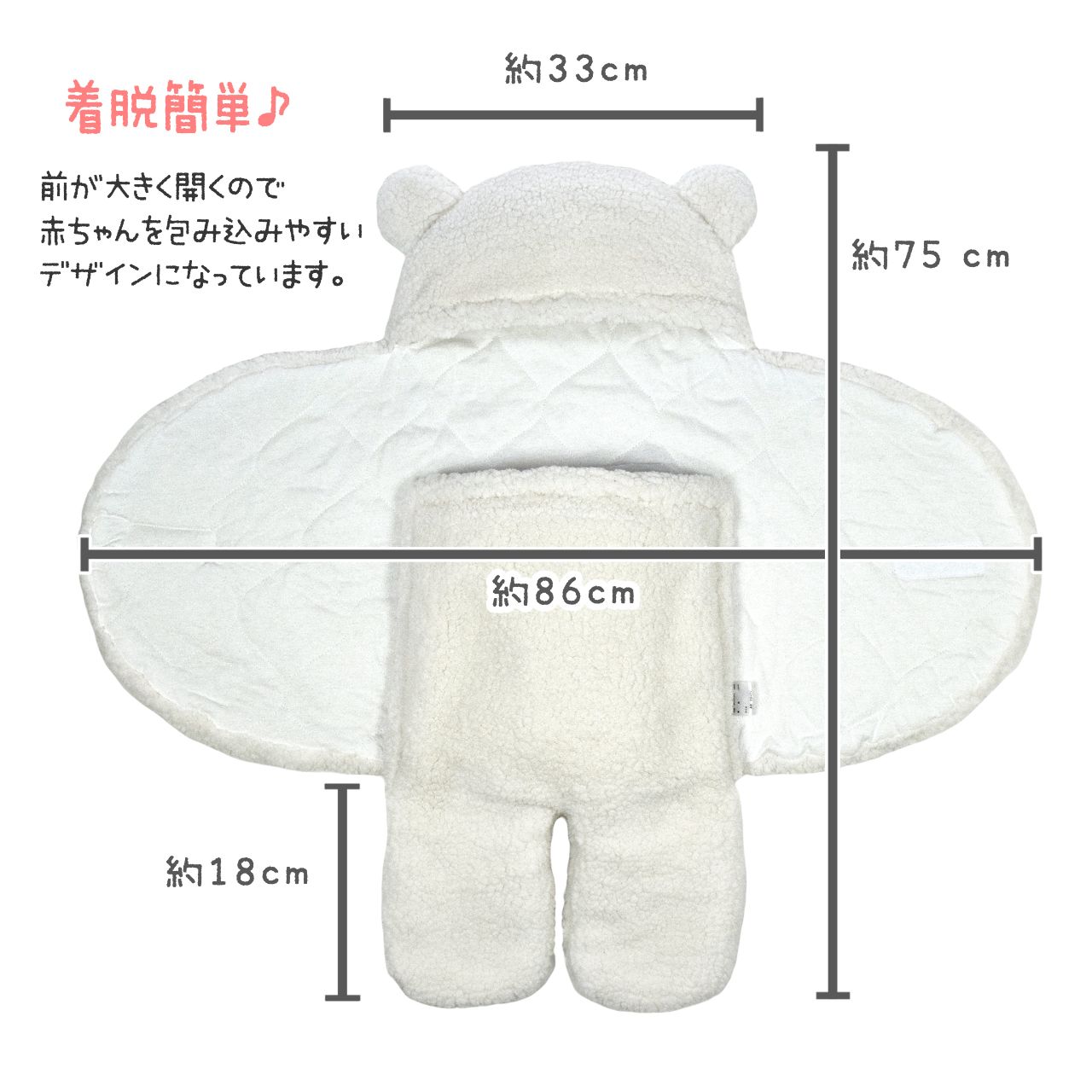 ☆ 商 品 説 明 ☆ 柔らかボア くま耳 フード付き 中綿入り あったか おくるみ 。 赤ちゃんの身体に触れる部分は コットン100% の優しい肌ざわり。表面は もこもこ ふあふあ ボア仕様。面ファスナーで着脱簡単。マジックテープはトゲトゲの短い優しい物を使用。中綿入りであたたか。前が大きく開くので赤ちゃんを包み込みやすいデザインになっています。足もすっぽりくるめるので 元気に動いても足が出る心配がありません。ベビーカーご使用時も足が分かれているので簡単に乗せられるのもポイントです。お尻には 可愛い くまのしっぽが付いています。