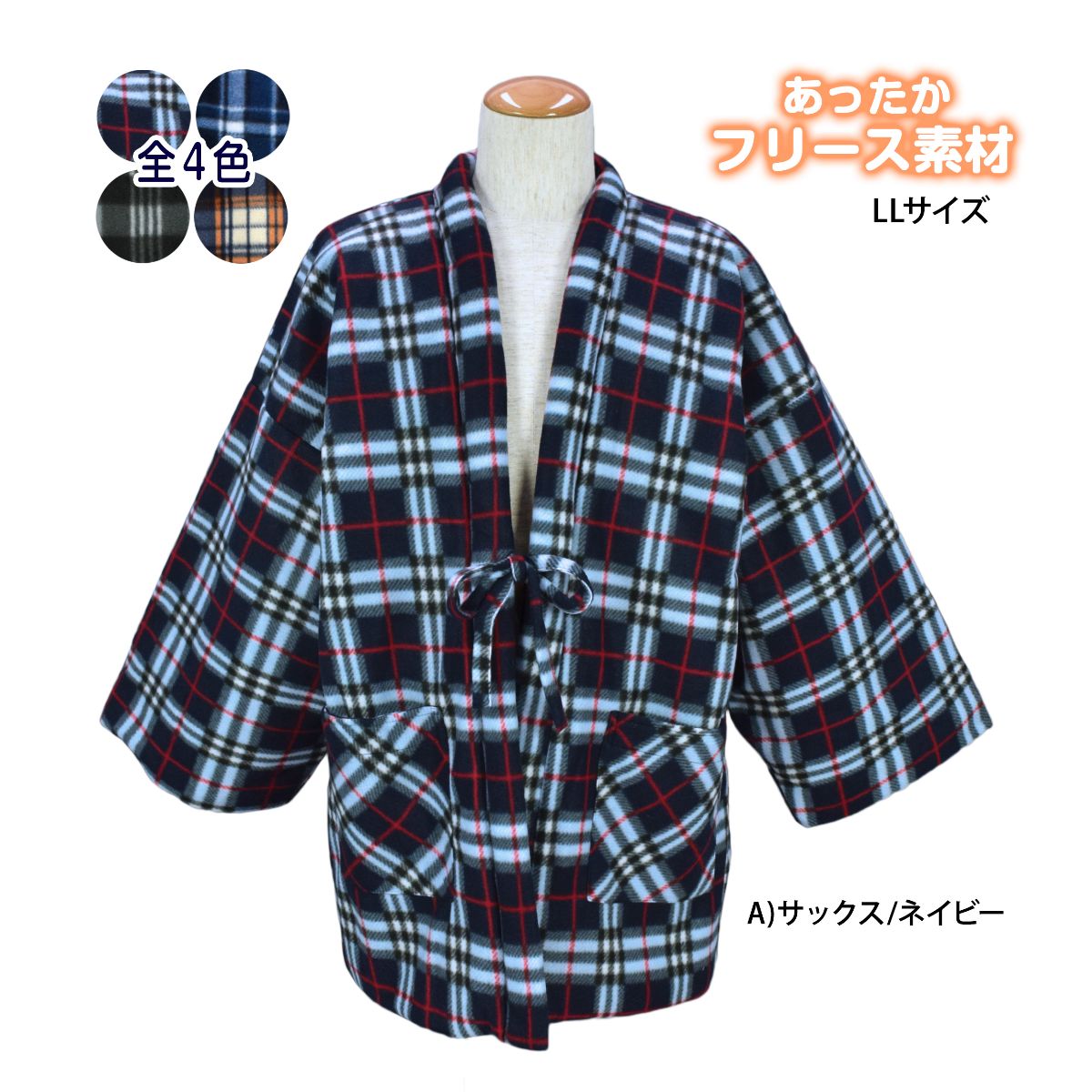 ☆ 商 品 説 明 ☆ 男性用 大きいサイズ フリース 中綿入り はんてん 。 表地はフリースの チェック柄 裏地はキルティング。ポケット は前に2つ。共布のひも付き。半天 を着ると、寒い時期には暖かく快適に過ごせます。冬はお家にいる時間も長くなりがちなので、暖かな 半纏 がおすすめです。 ※模様や柄の出方は個々の商品によってそれぞれ異なります。 ※生産ロットの違いにより裏地の色が異なる場合があります。 カラーはお選び出来ませんのご了承願います。