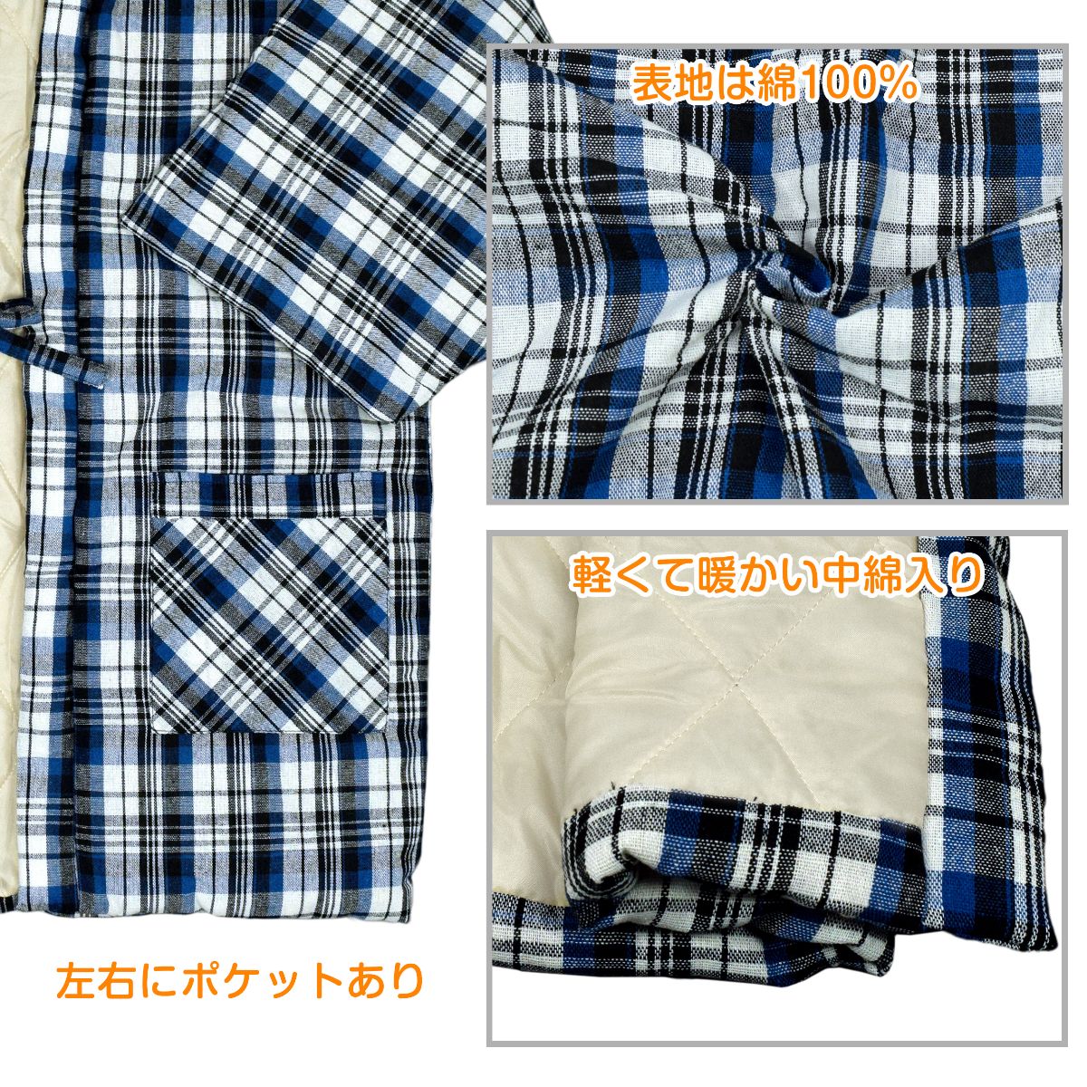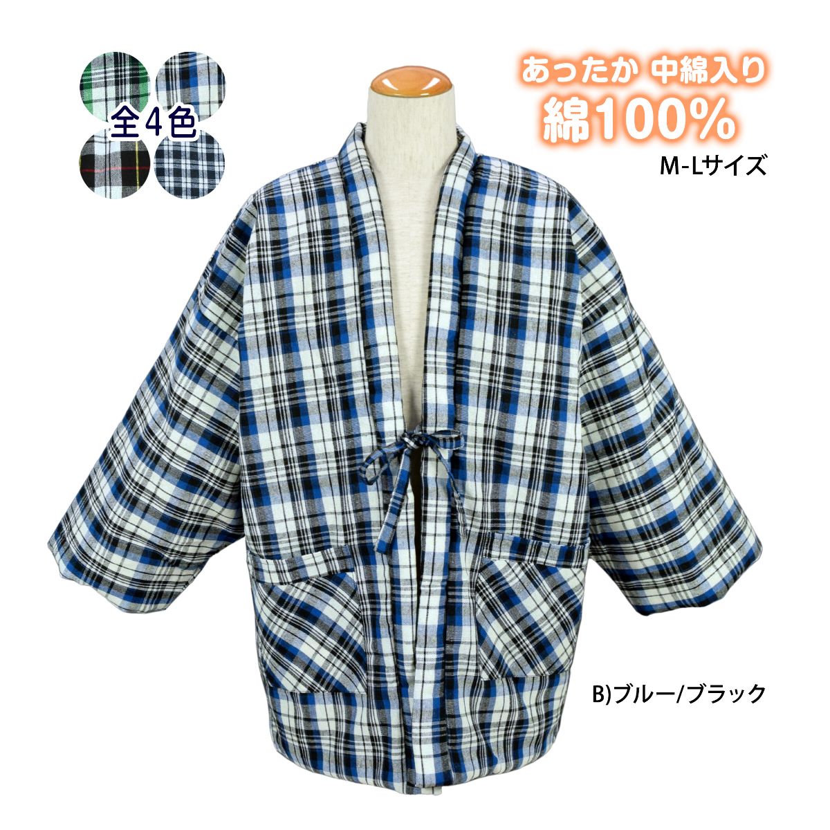 半纏 はんてん メンズ 表綿 綿入れ ポケット付き おしゃれ あったか ○ 商品型番:MDS-603MAS