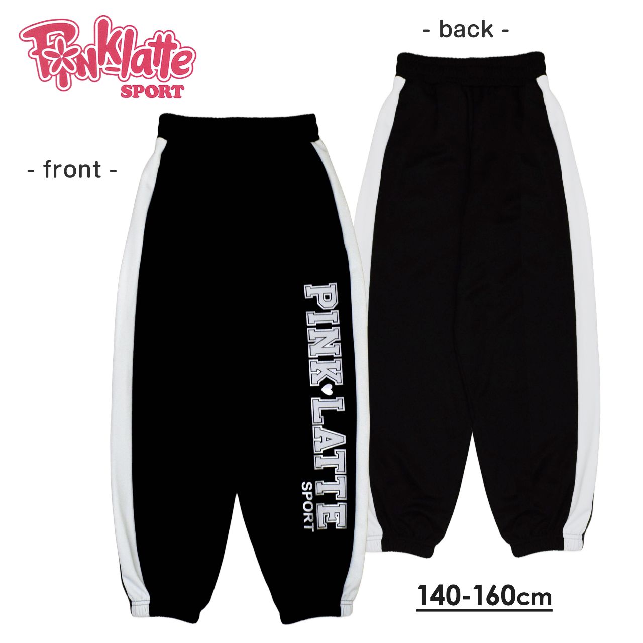 ☆ 商 品 説 明 ☆ PINK-latte sport ピンクラテスポーツ ジャージ パンツ 。 サイド切替やフロントのラメプリントが脚をスッキリ見せてくれるスタイルアップ効果のあるボトムです。 動きやすく、通学やダンス、レッスンにもピッタリ。パンツは裾がリブのホッピングタイプ。 ウエストゴム、ゴム取り替え穴なし、紐付き。サイドに2つポケットあり。 別売りのジャケットと合わせれば統一感のあるセットアップコーデが完成します。