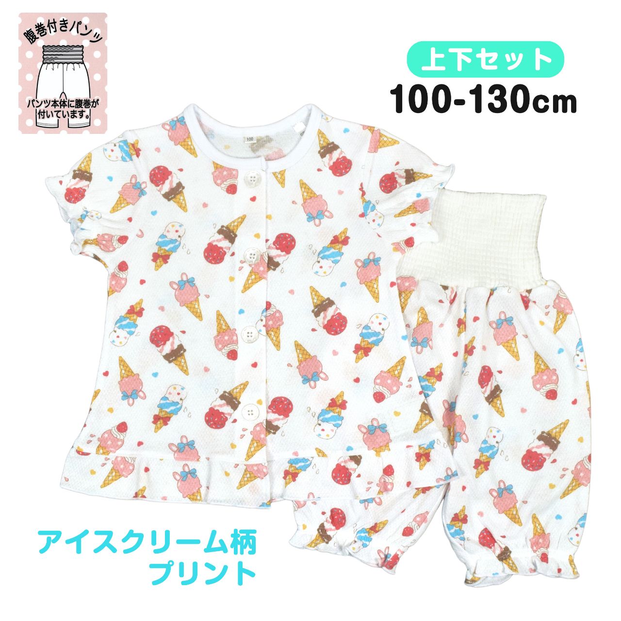 ☆ 商 品 説 明 ☆ メッシュ素材 アイスクリームプリント 腹巻き付き 半袖パジャマ。 カラフルなアイスクリームのプリント半袖パジャマ 上下セット です。トップスは袖と裾がフリルでとってもかわいいデザイン。パンツは腹巻き付きだから 寝冷えからおなかを守ってくれます。袖口とパンツの裾には軽くゴムが入っています。前立てボタン留め。上下共お名前タグあり。