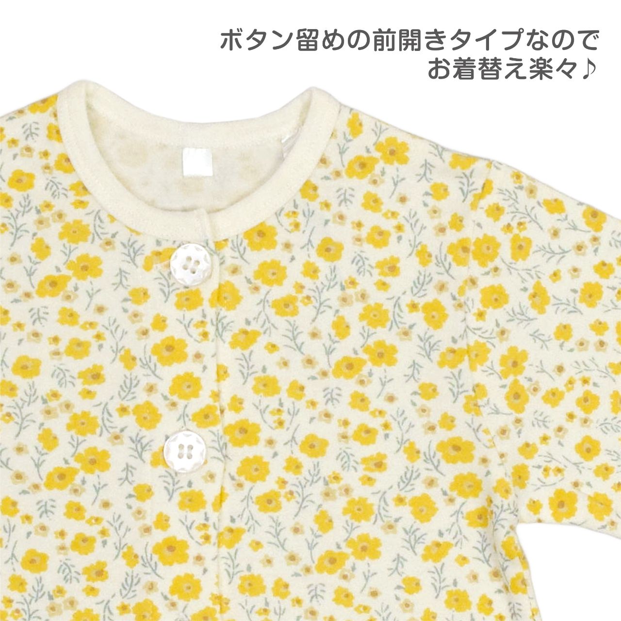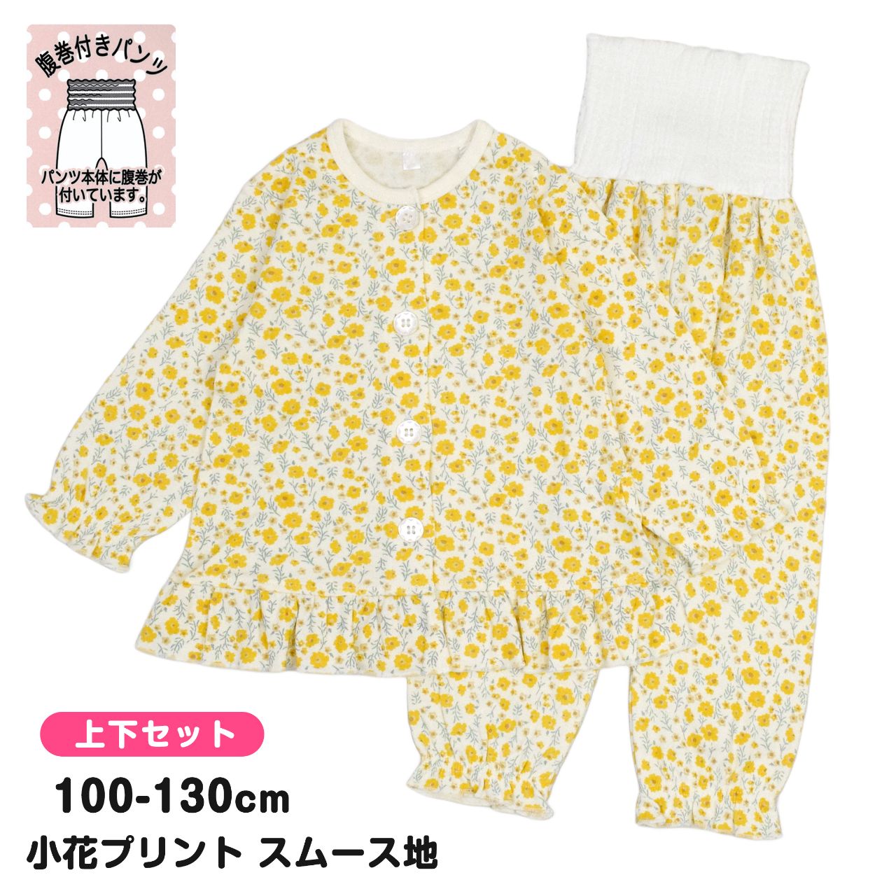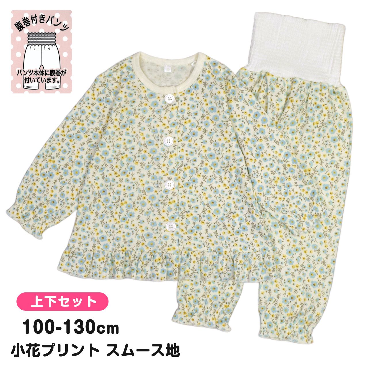☆ 商 品 説 明 ☆ 小花プリント 腹巻き付き 長袖パジャマ 。 かわいい 小花総柄プリントのスムース地パジャマです。 本体は綿100%で柔らかく優しい肌触り。前立てはボタン留め。トップス、手首、パンツの足首にゴムが入りフリル仕立ての可愛いデザインです。パンツは腹巻き付きで冷えからおなかをしっかり守ります。上下共お名前タグあり。