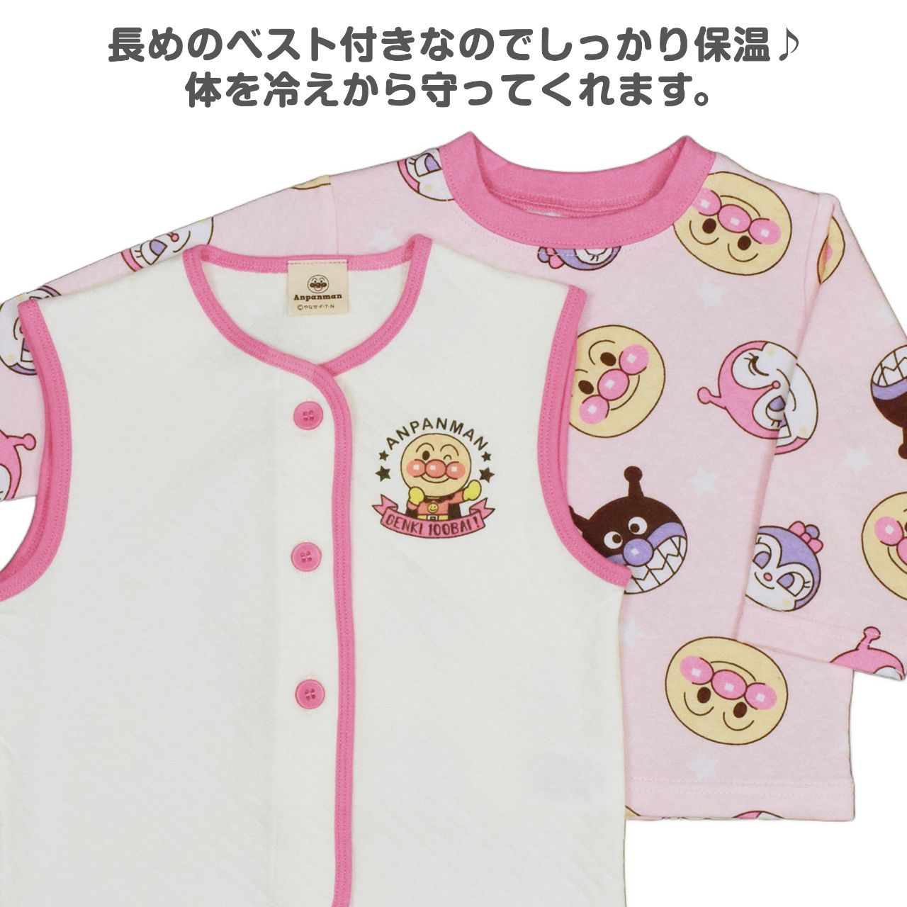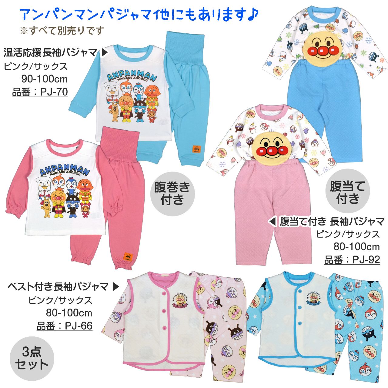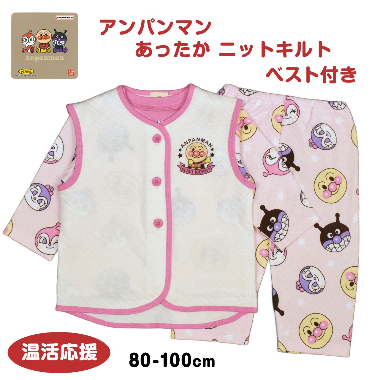 ☆ 商 品 説 明 ☆ それいけ アンパンマン ベスト付き ニットキルト 長袖 パジャマ 3点セット 。 アンパンマン ばいきんまん ドキンちゃん コキンちゃん かわいい フェイスプリント。前ボタン留めのベストもニットキルト地に長め丈だからしっかり暖かな ニットキルトパジャマ です。 パジャマの表生地、裏生地は綿100%で柔らかく優しい肌触り。パンツはお尻にマチが付いているので ゆったりした履き心地。ウエストゴム ゴム交換口付き。ベスト、パジャマ上下共お名前タグあり。