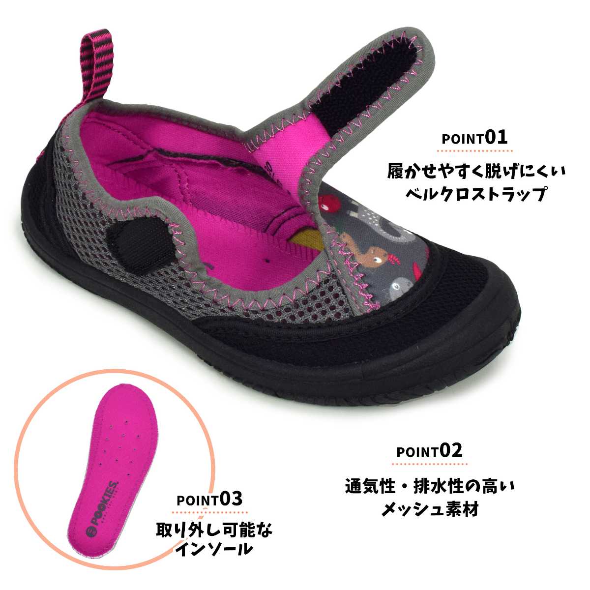 ☆ 商 品 説 明 ☆ POOKIES プーキーズ 男女兼用 水陸両用 アクアシューズ 。 メッシュ で通気性抜群、柔らかく履きやすい シューズ です。甲部分はマジックテープ使用なのでお子様の甲に合わせて留めて頂けます。砂浜や岩場などでの擦り傷等から足を守ってくれるので1足あると安心な ウォーターシューズ です。ソールは 合成ゴムで滑りにくくなっています。インナーソール は取り外し可能。