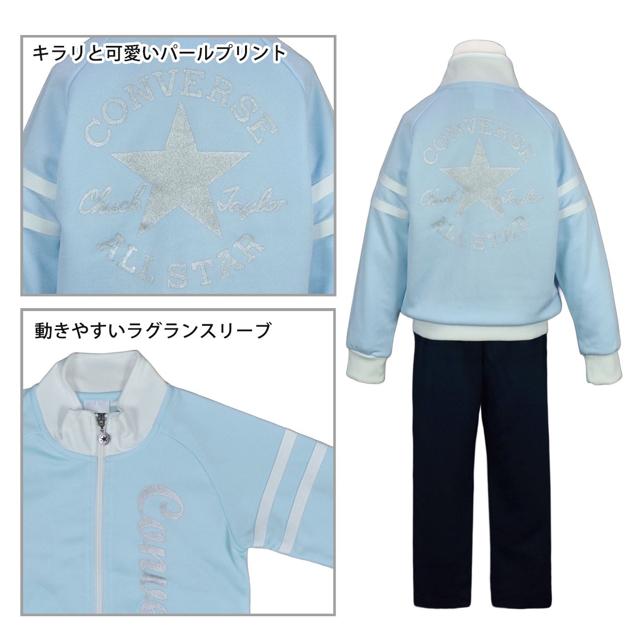 ☆ 商 品 説 明 ☆ CONVERSE コンバース トレーニングウェア 上下セット 。 ジャケット 前後のロゴはパールプリント 両袖はテープ使い。シルバーカラーのプリントがキラリとしてかわいい セットアップ ジャージです。 パンツは裾部分にロゴプリント入り。ウエストはゴム、ひも付き。ゴム取り換え穴なし。トップス・ボトムスに各2つポケットあり。