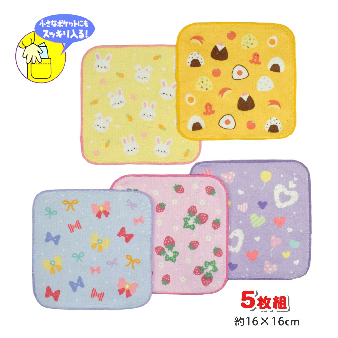 ☆ 商 品 説 明 ☆ 総柄 柄違い プチタオル 5枚組 。 うさぎ ハート いちご たこさんウインナー リボン など可愛くカラフルな プリント入り ミニタオル5枚セットです。 16cm×16cmの小さなタオルなのでお子様のポケットやポケットポーチなどにスッキリ入ります。柄違いなので毎日選ぶのが楽しくなる プチタオルです。お名前タグ付き。
