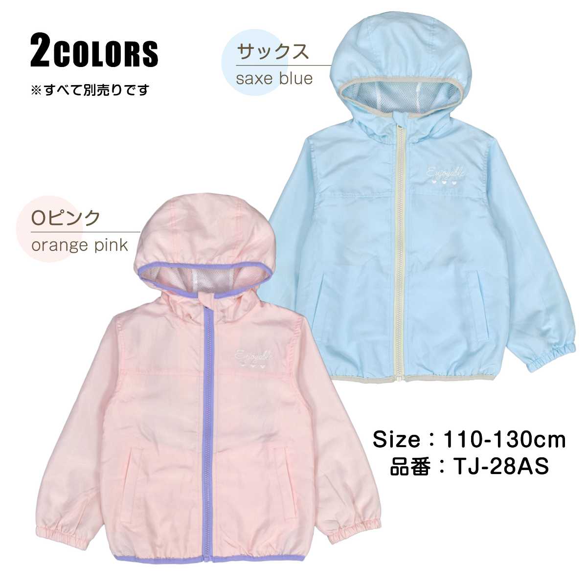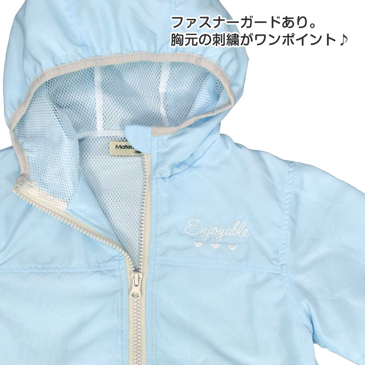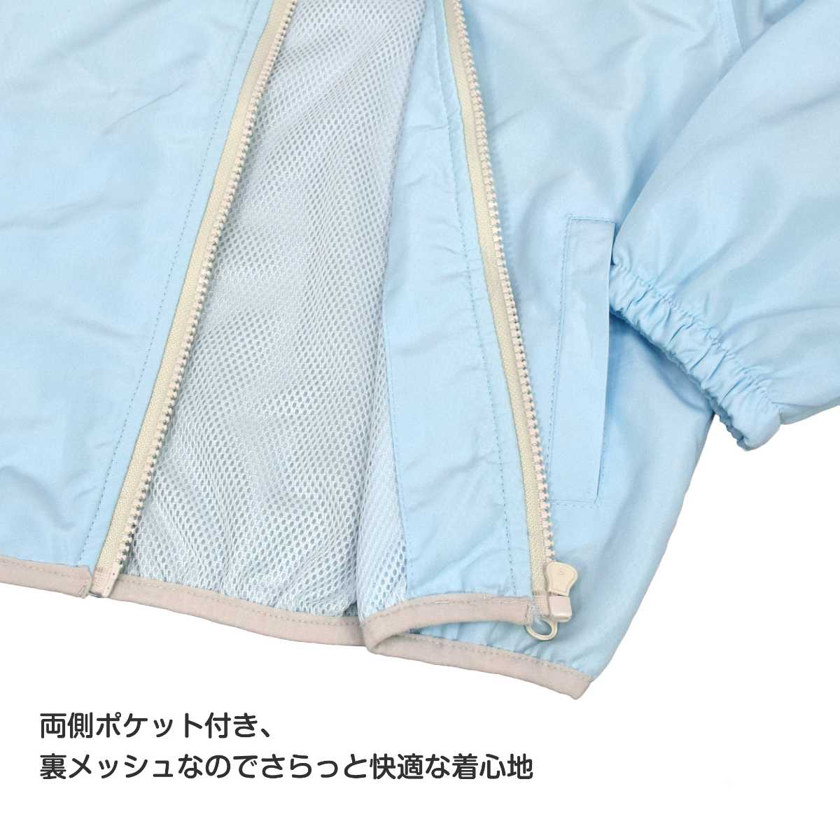 ☆ 商 品 説 明 ☆ 裏メッシュ フード付き ウインドブレーカー 。 胸元に刺しゅうが入った かわいい フルジップ ジャンパー です。裏側は袖の中までメッシュ使い、軽く羽織れます 。袖口はゴム入り。ポケット 2つ ファスナーガード あり。フード取外し不可。