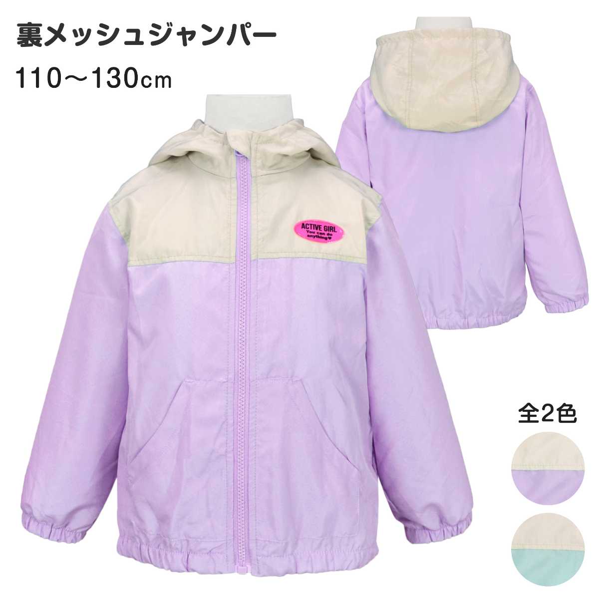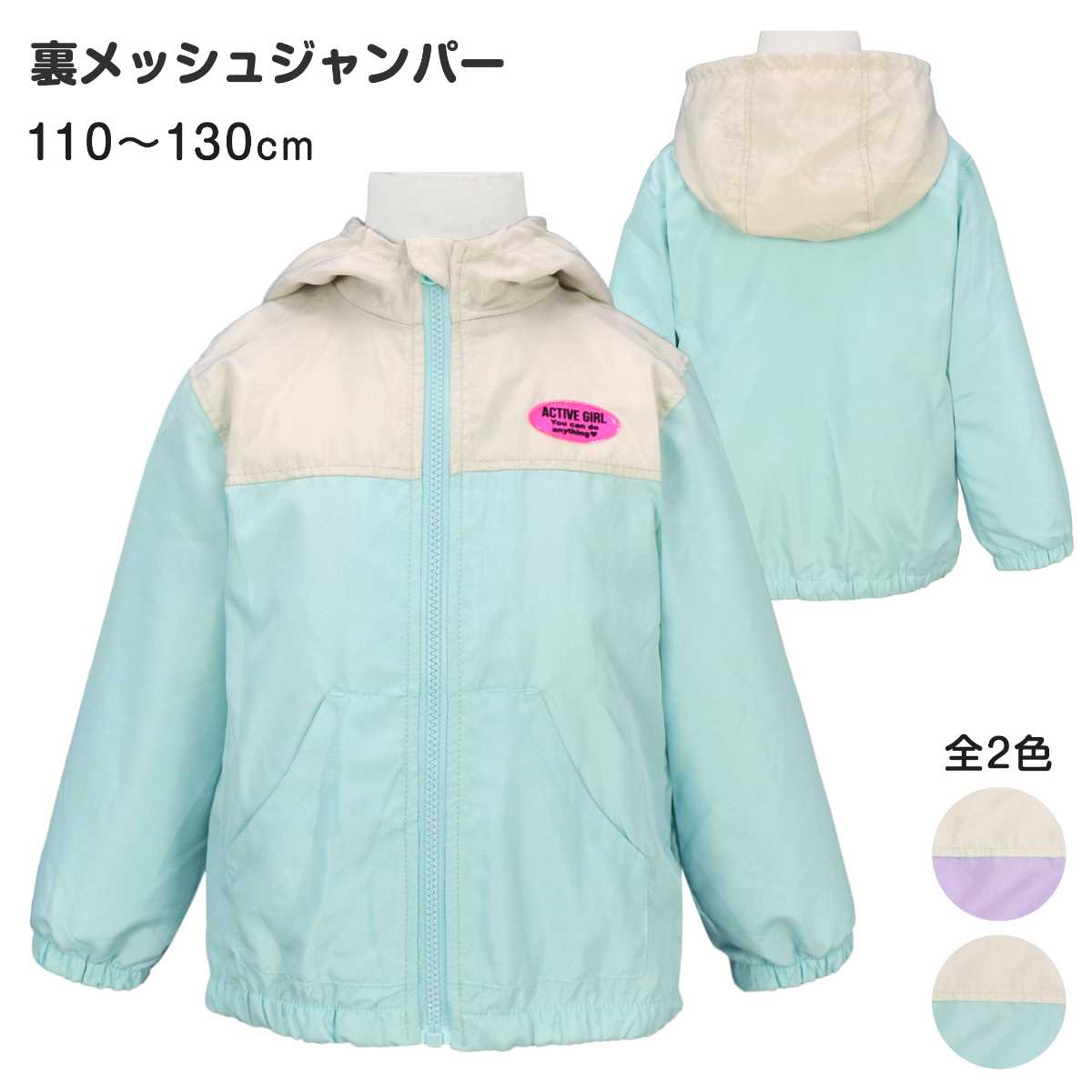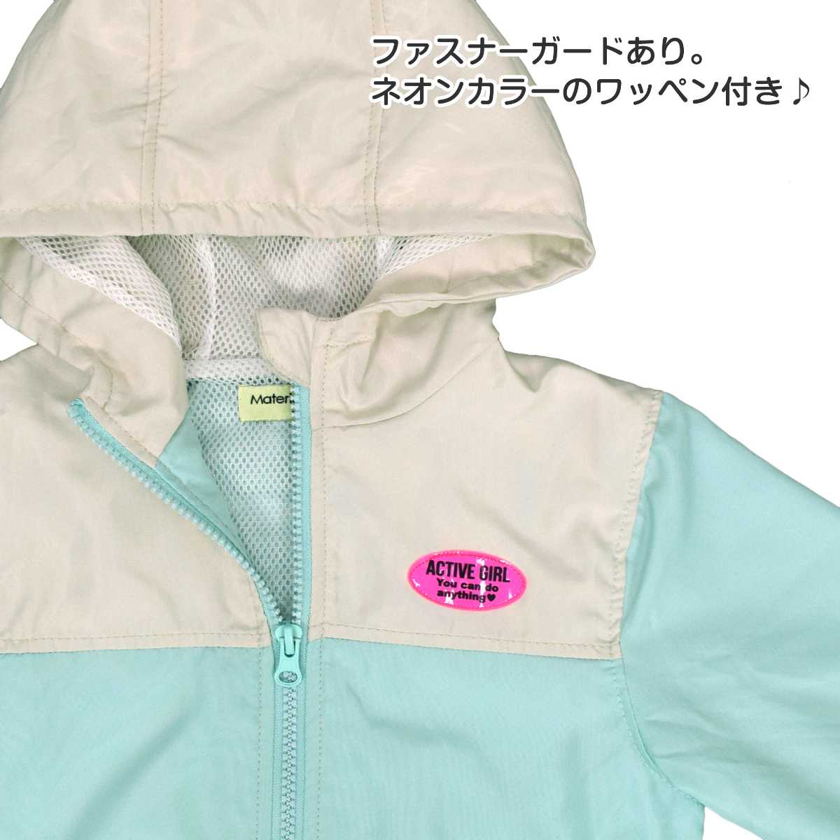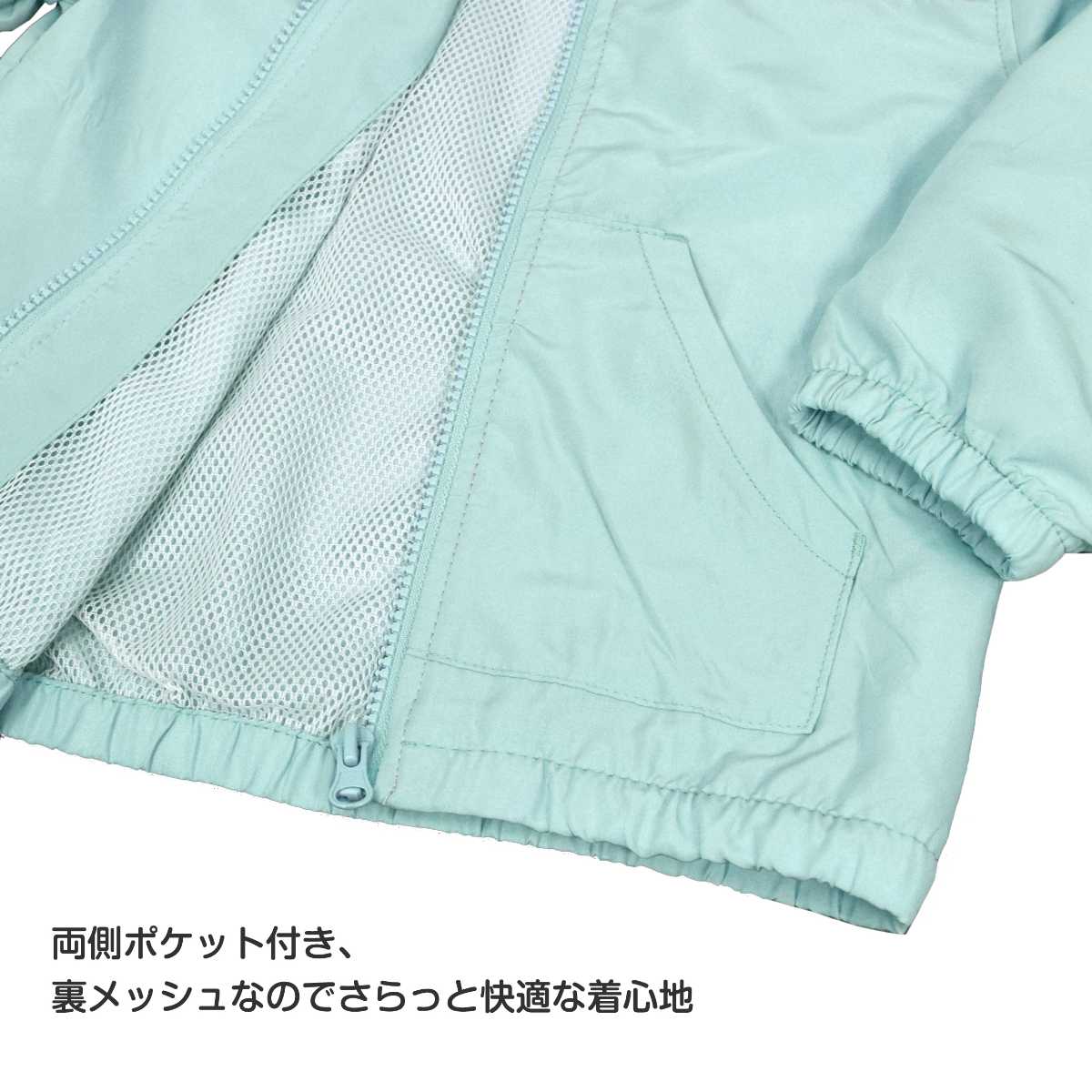 ☆ 商 品 説 明 ☆ 裏メッシュ フード付き ウインドブレーカー 。 軽く羽織れる裏メッシュ フルジップ ジャンパー 。胸元 切替に ネオンカラー のワッペンが付いた かわいい ウインドブレーカー です。袖口と裾はゴム入り。裏側は袖の中までメッシュ使い。ポケット 2つ ファスナーガード あり。フード取外し不可。