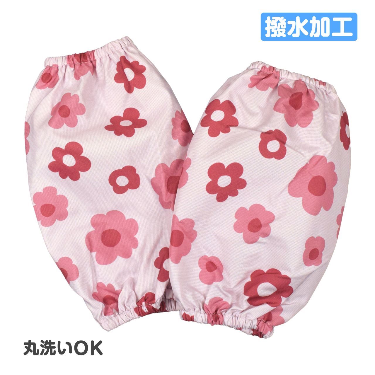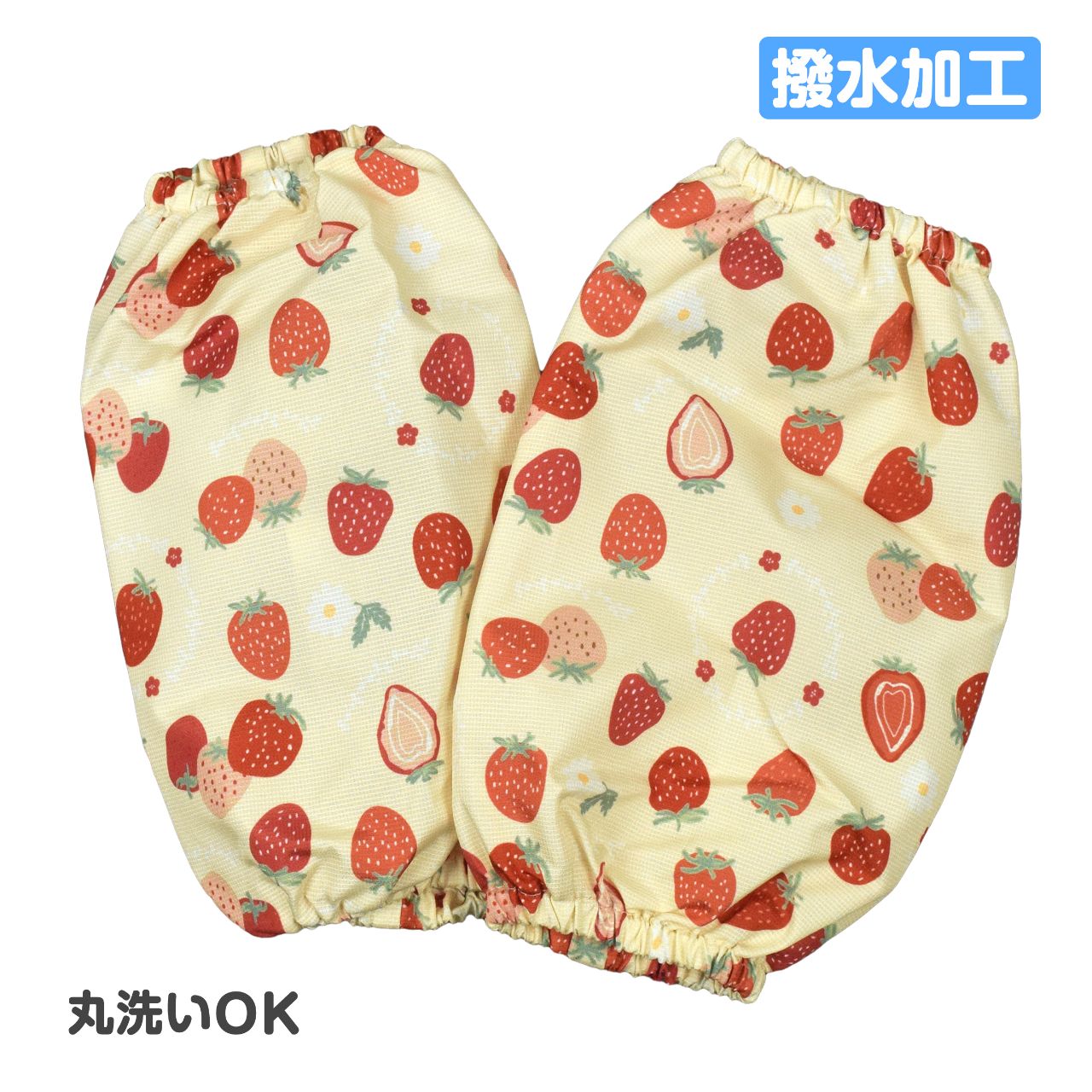 かわいい イチゴのプリント。撥水加工 なので水滴から袖口をカバーできます。スモックを着てくれない時でも 腕カバー を付けるだけで袖口の汚れも安心です。丸洗い もOK。