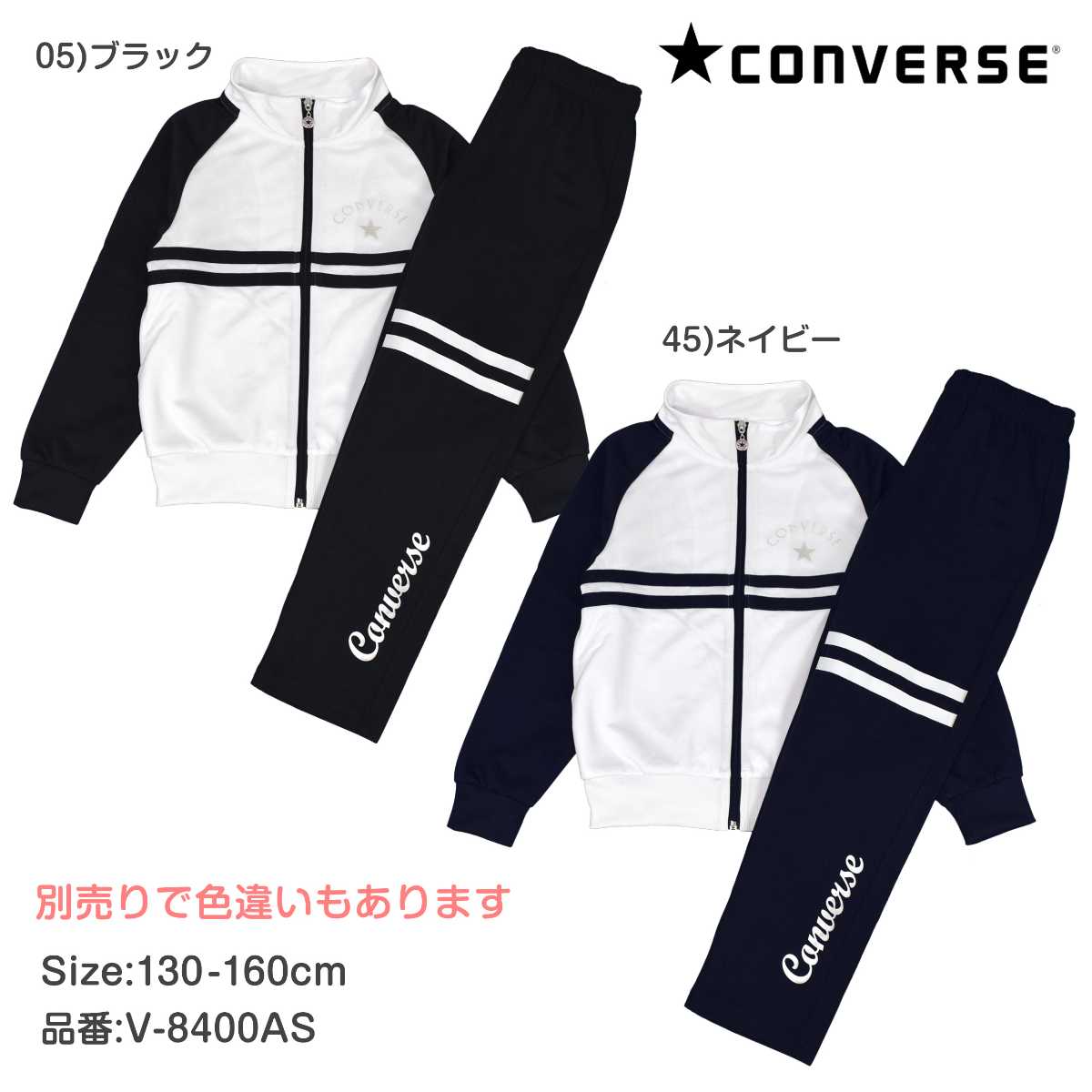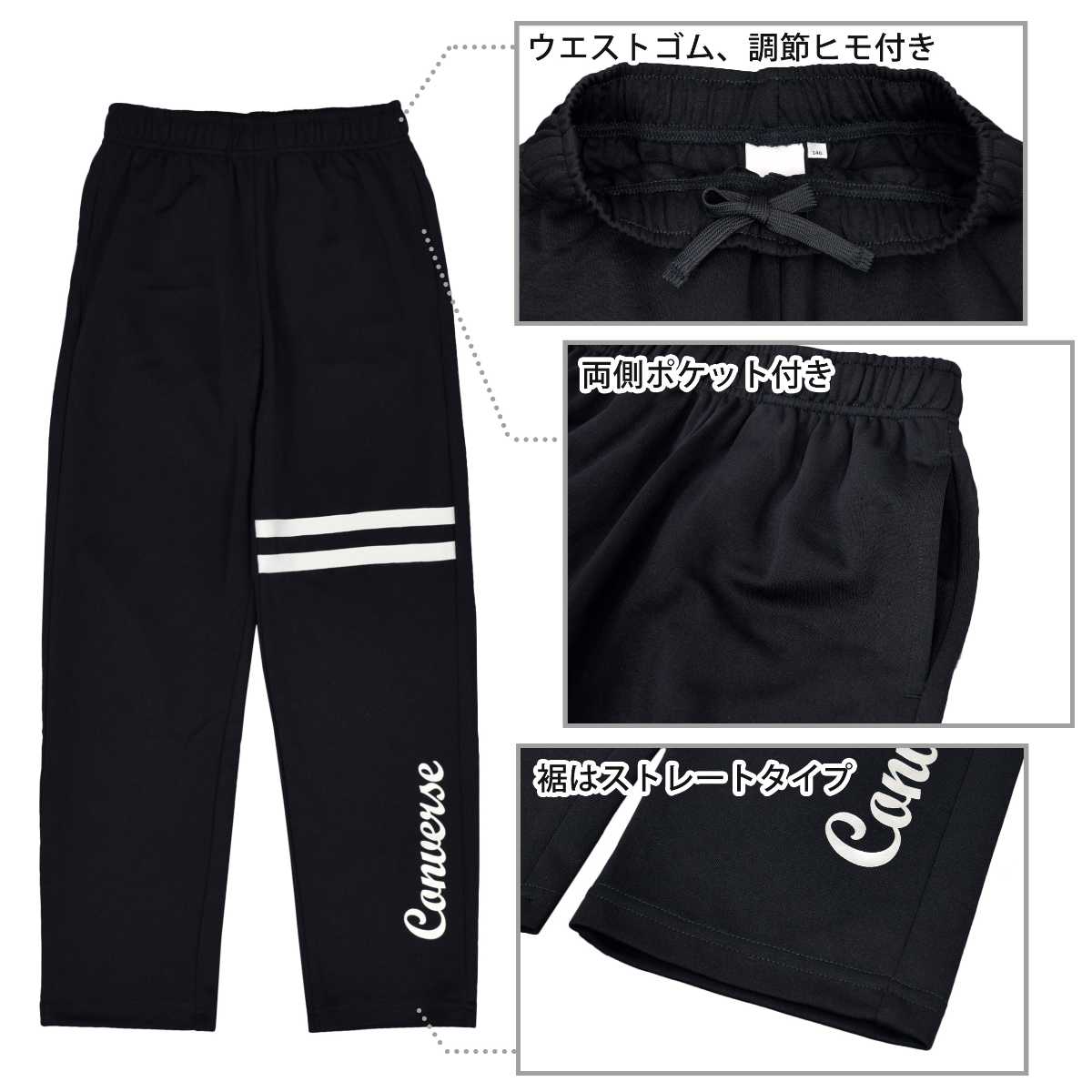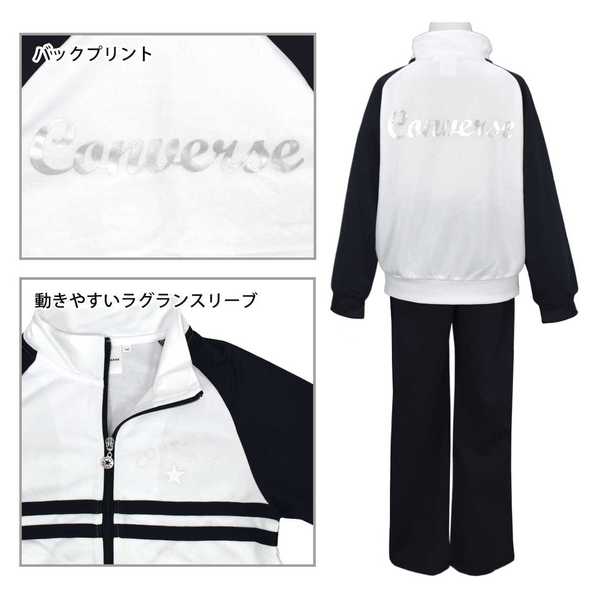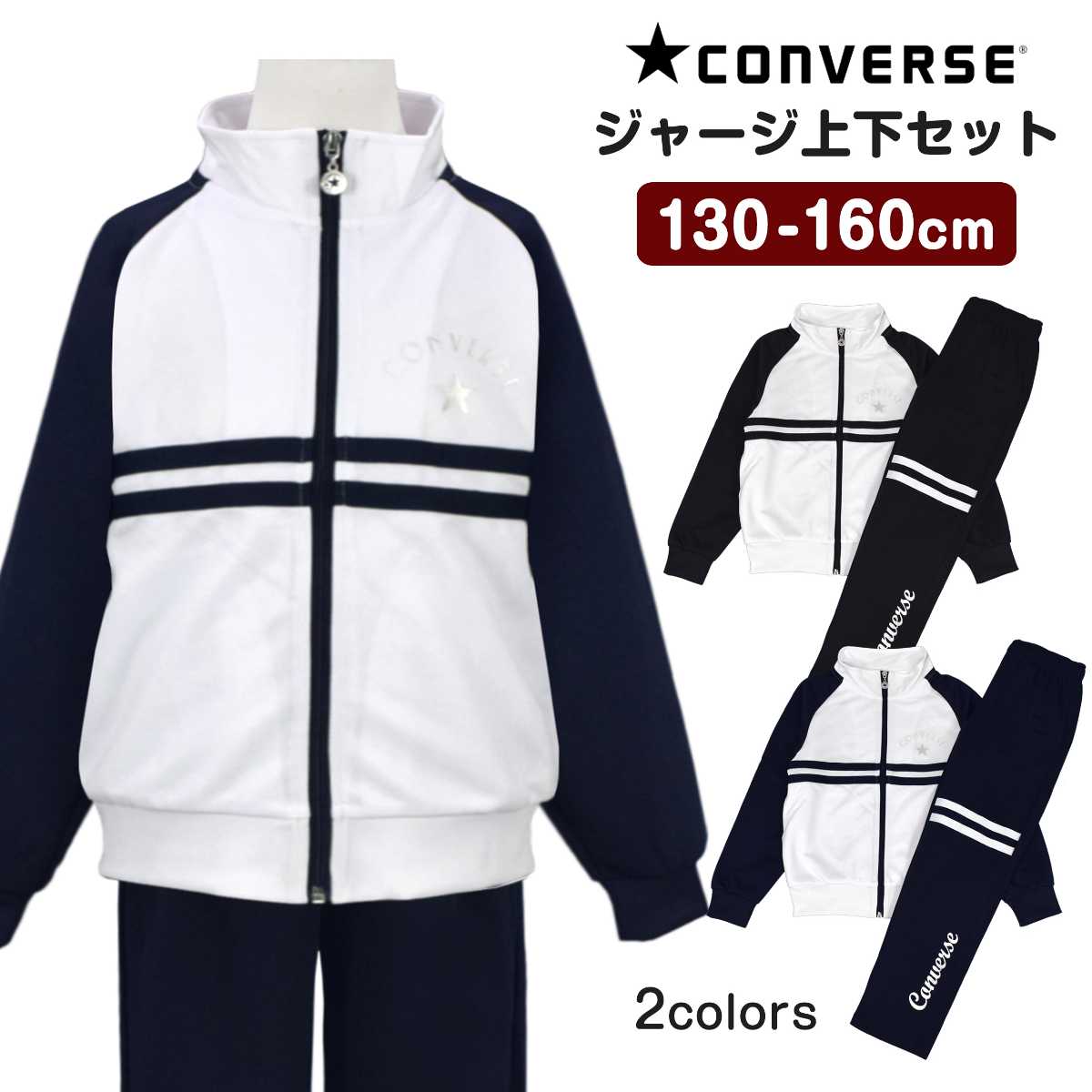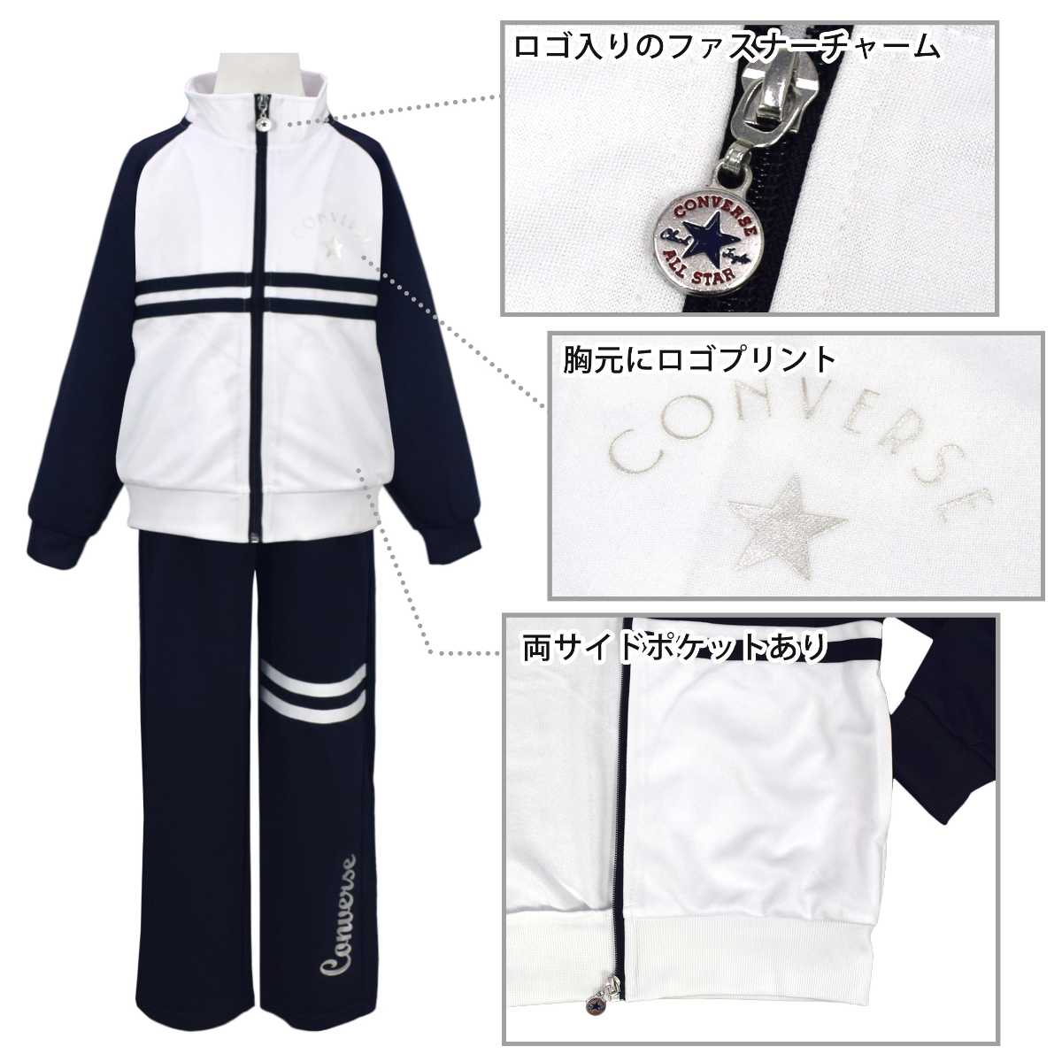 ☆ 商 品 説 明 ☆ CONVERSE コンバース トレーニングウェア 上下セット。 ジャケット 前後のロゴはパールプリント、胸下のラインでスッキリした印象の ジャージ です。 パンツは太もも部分に2本のライン、裾部分にもパールプリントのロゴ入り。 ウエストはゴム、ひも付き。ゴム取り換え穴なし。 トップス・ボトムスに各2つポケットあり。