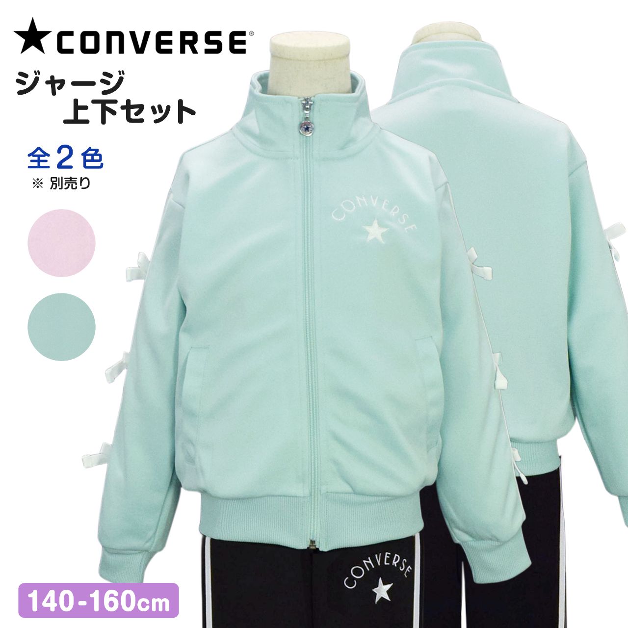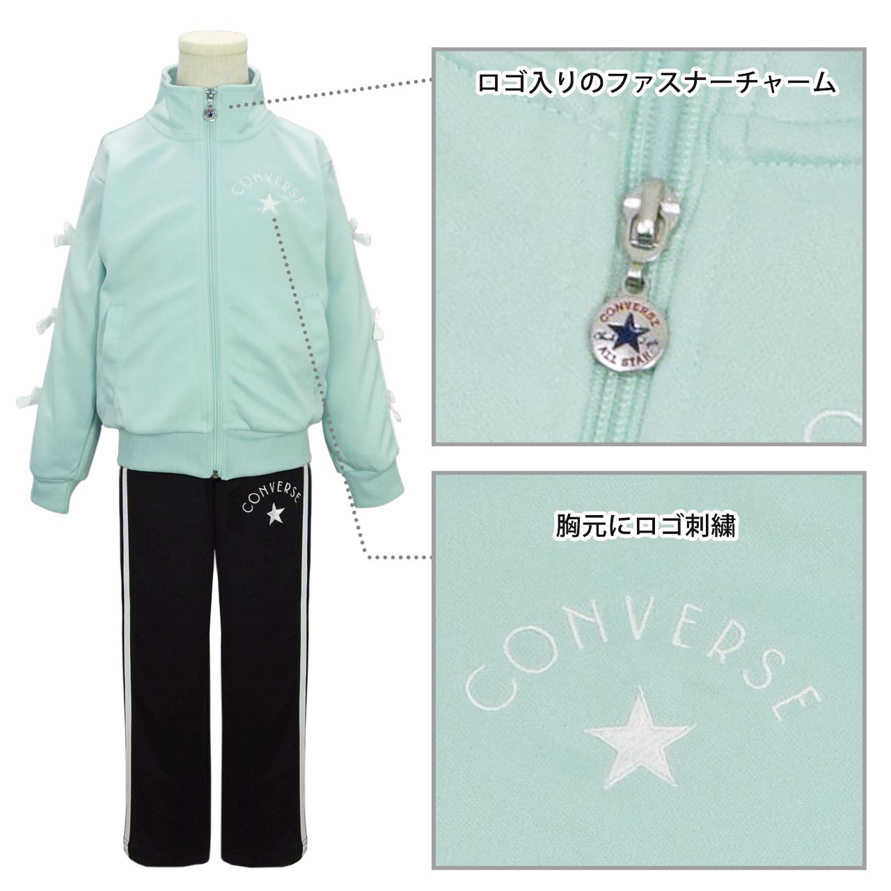 ☆ 商 品 説 明 ☆ CONVERSE コンバース トレーニングウェア ジャージ 上下セット 。 胸にはコンバースのマークとロゴ刺繍入り。袖は2本ラインにリボンが付いたガーリーでかわいらしいセットアップジャージです。 パンツは、腰部分に刺繍入り。サイドは2本ライン。ウエストはゴム、ひも付き。トップス、ボトムスに各2つポケットあり。