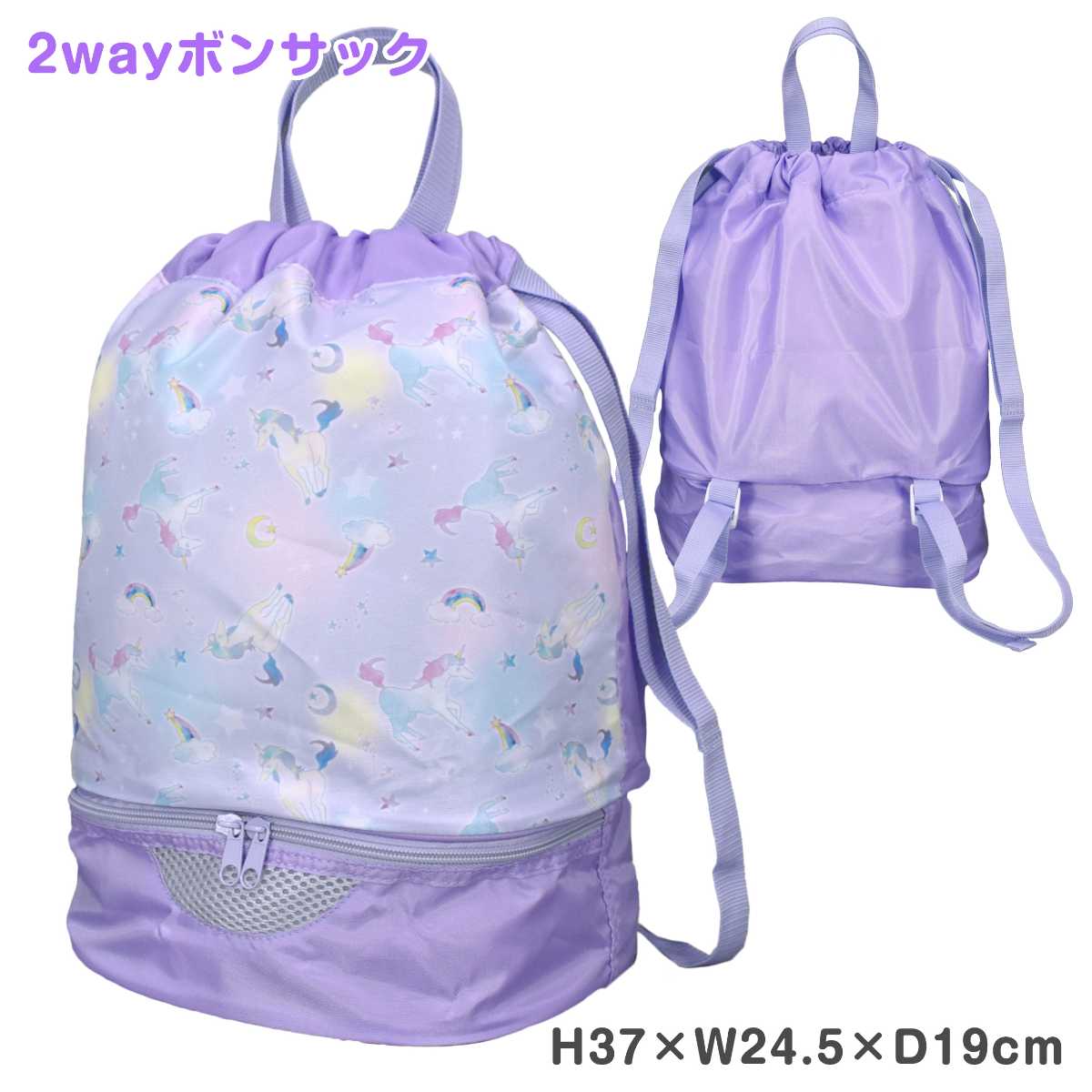 ☆ 商 品 説 明 ☆ ユニコーン 2WAY ボンサック プールバック 。 かわいい ユニコーンプリントの ボンサック プールバッグです。手提げ としても リュック としても使える便利な2WAY仕様。2層に分かれた収納スペースで、濡れたり汚れたものなどを分けられます。底部分の収納は ダブルファスナー で開閉しやすく メッシュ素材 の通気孔付きで 蒸れにくく なっています。小さな 持ち手 がついているので机のフックにも掛けられます。内側に名前が記入できるネームタグ付き。ショルダー紐は調節可能。